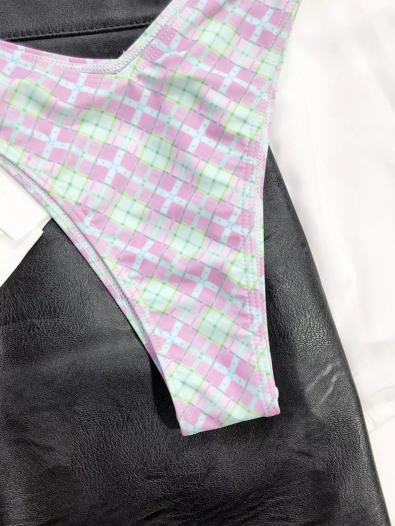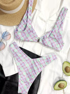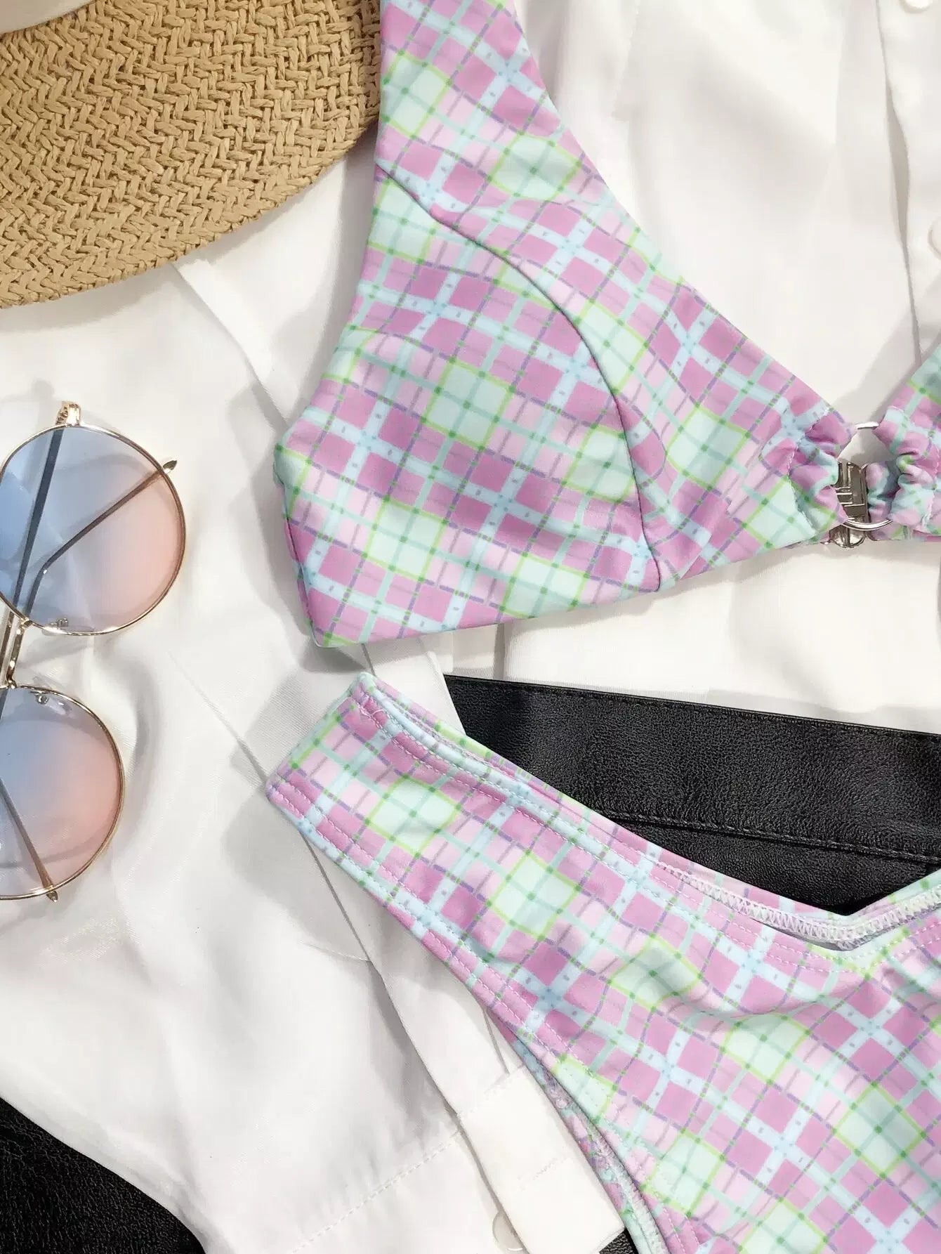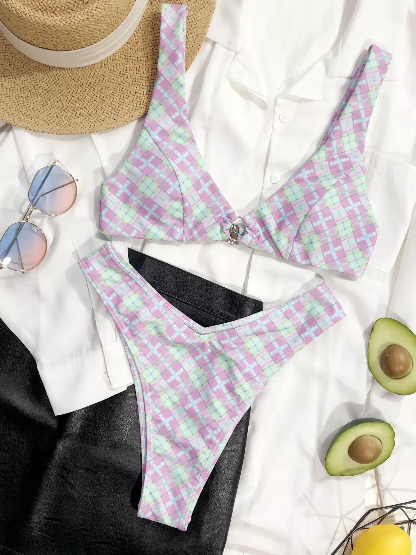 Plaid Ring Linked High Cut Bikini Swimsuit