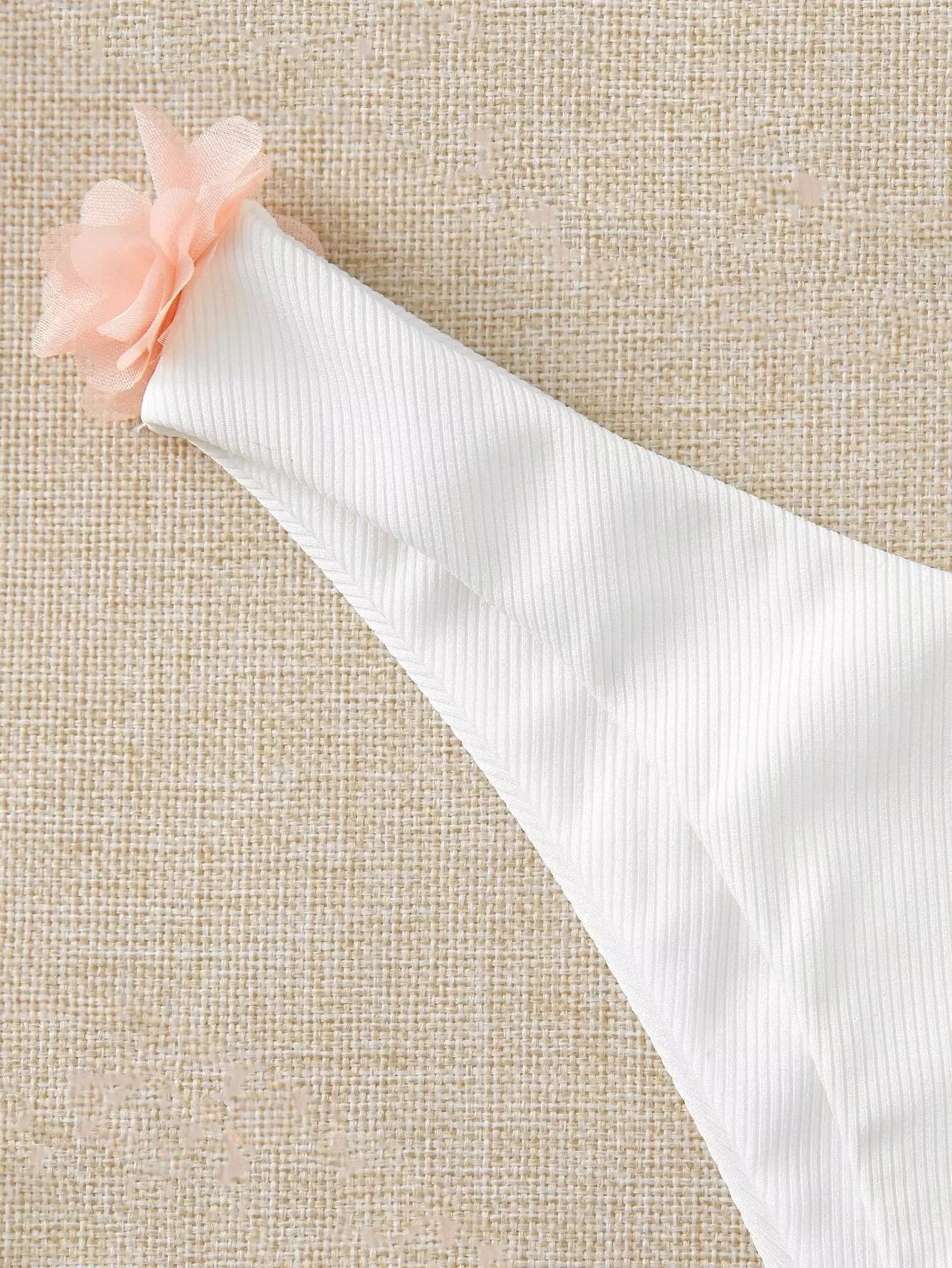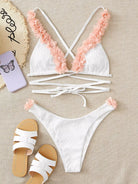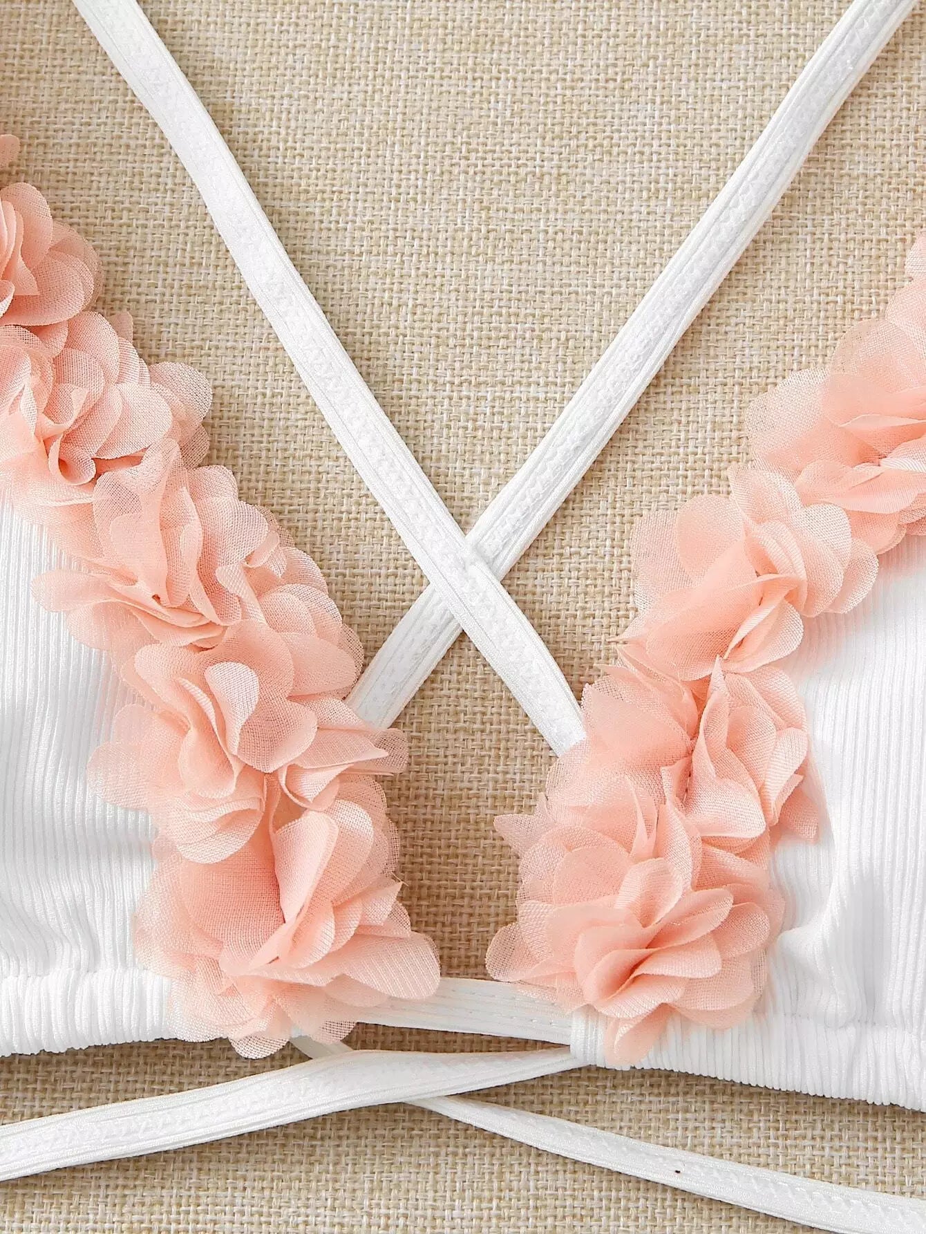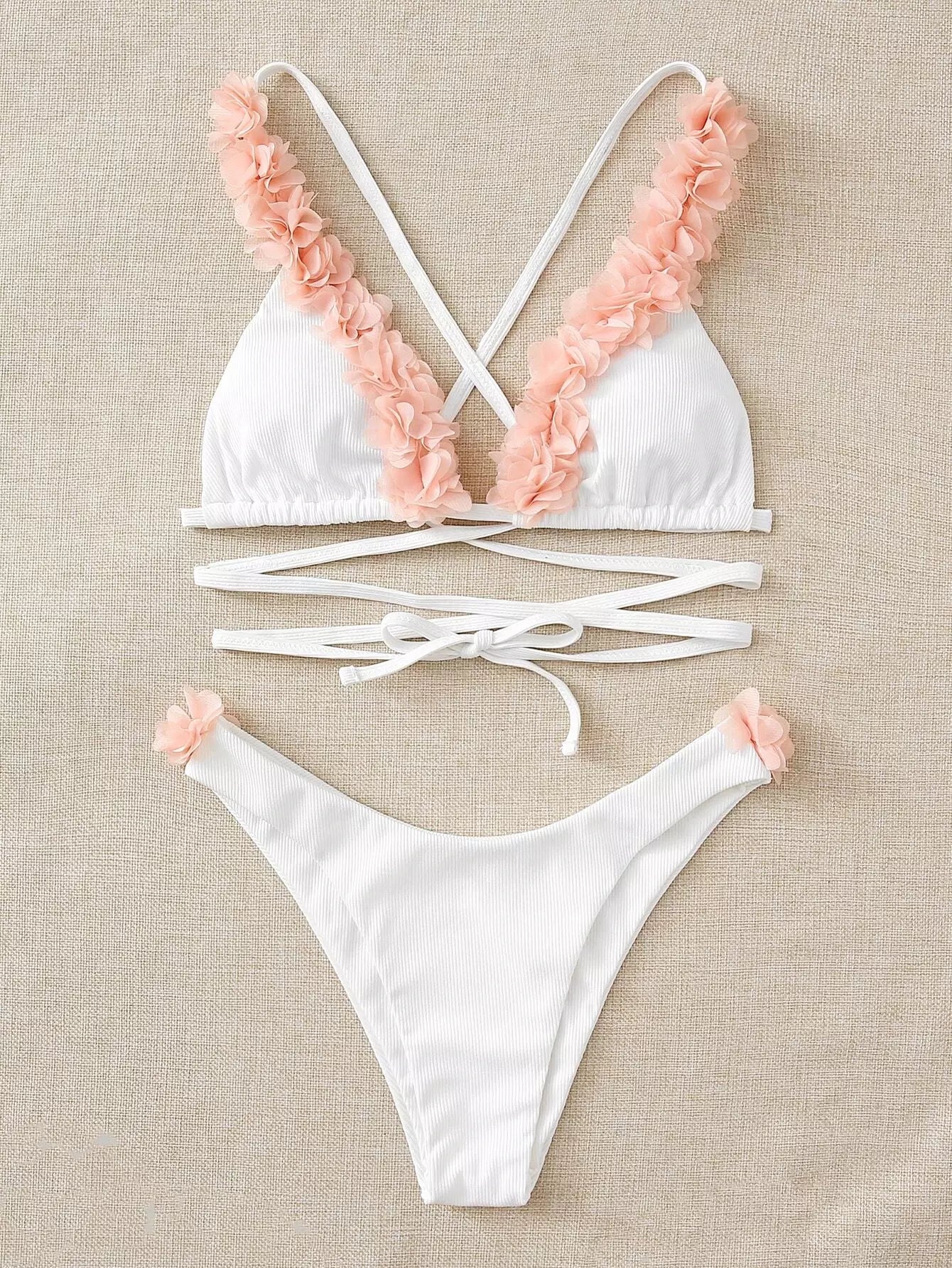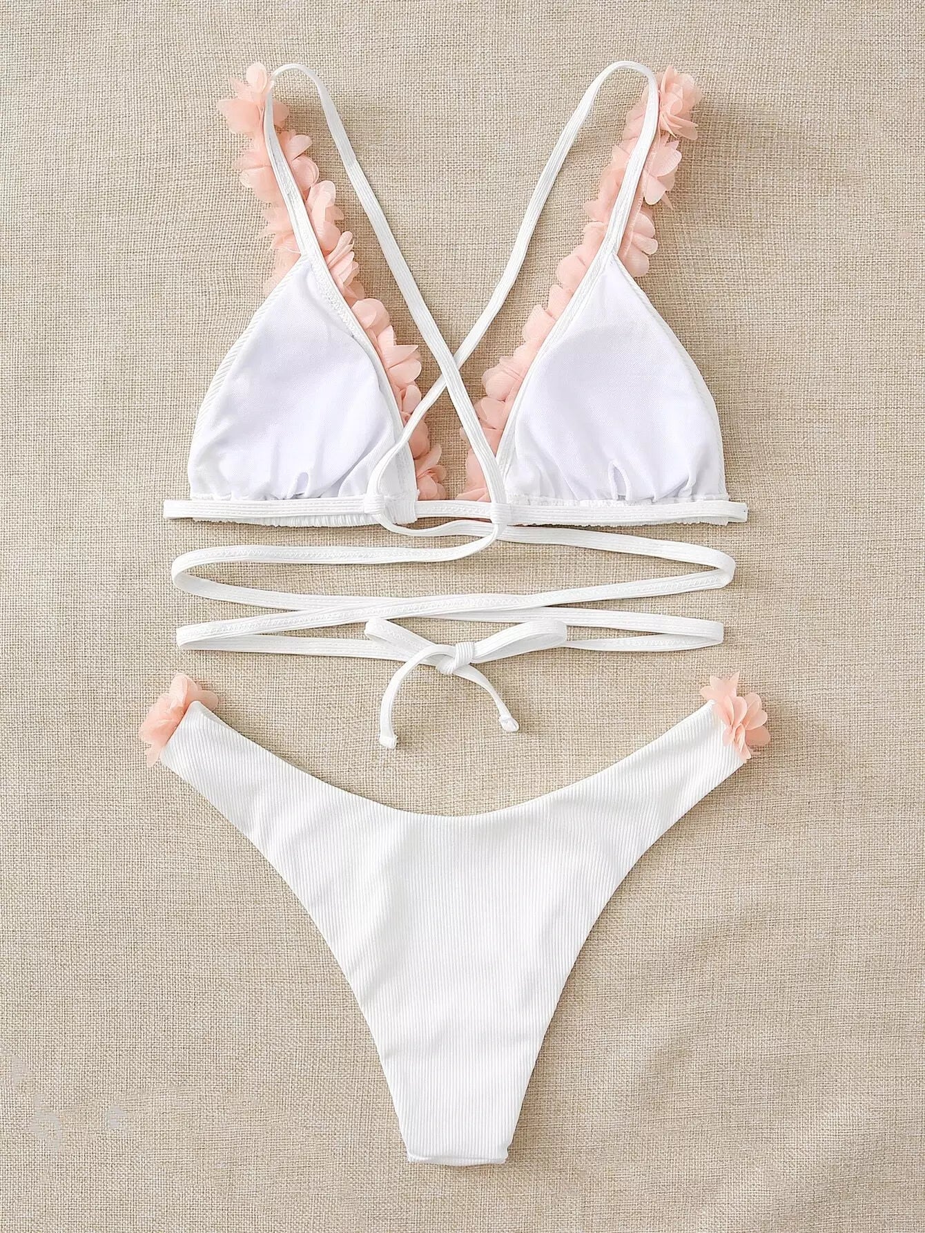 Rib Appliques Triangle High Cut Bikini Swimsuit