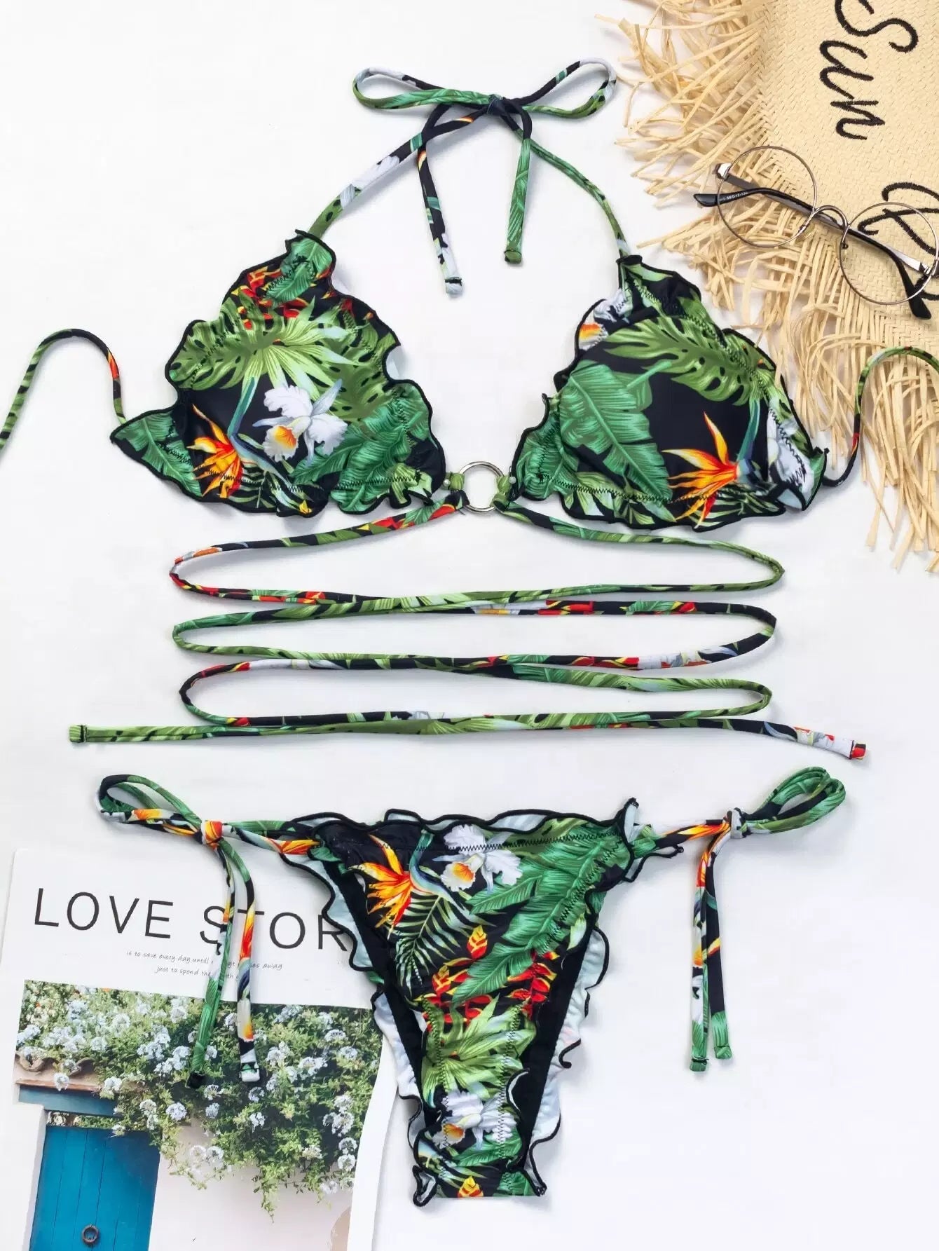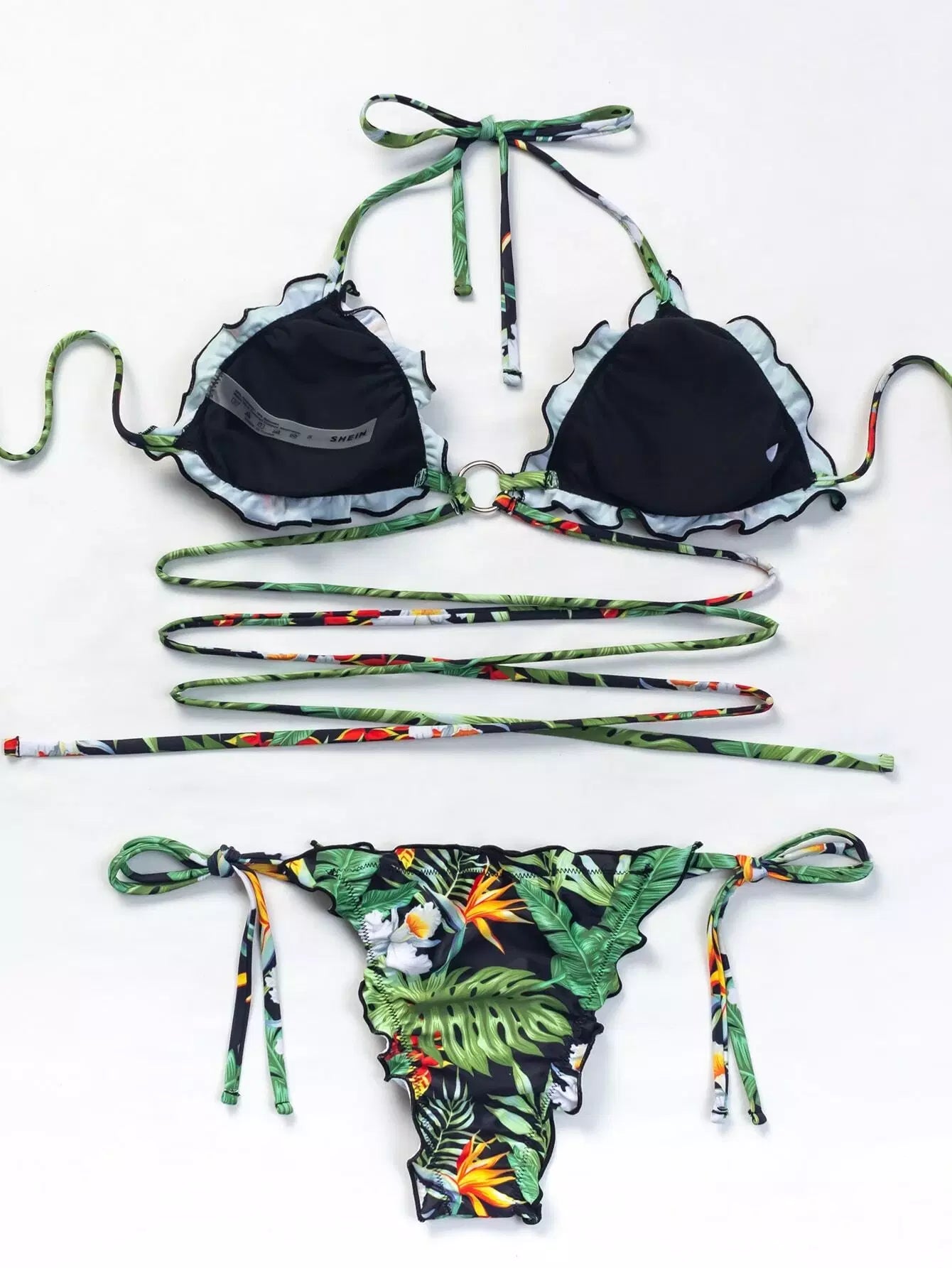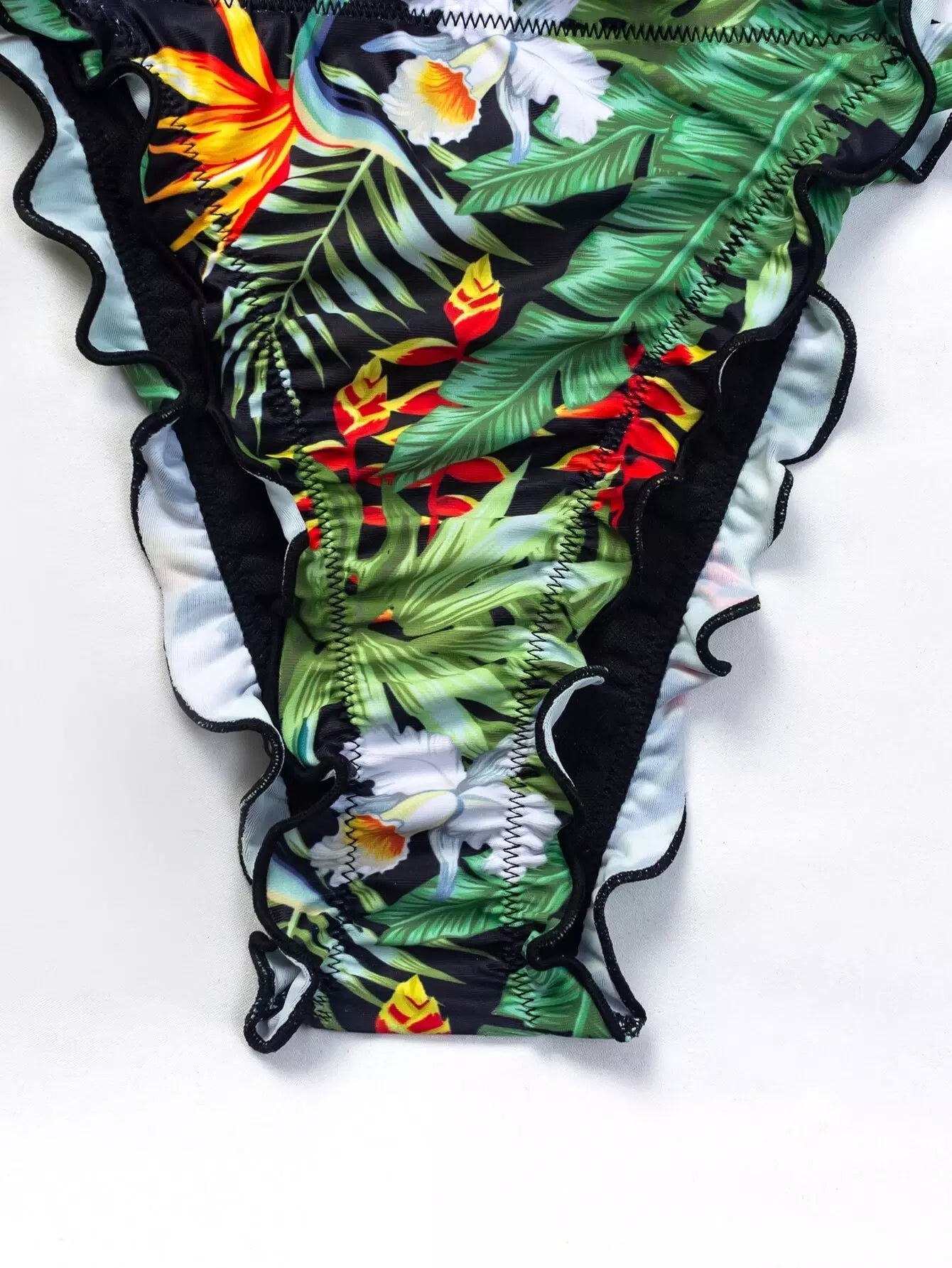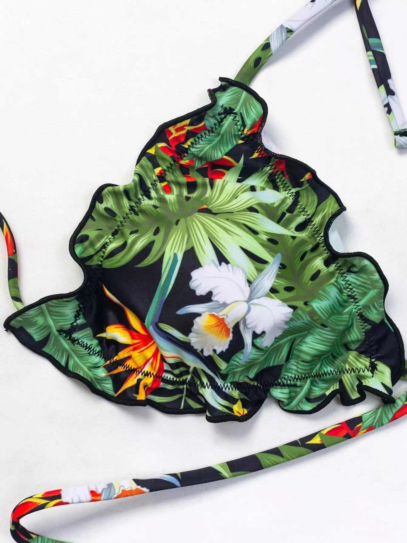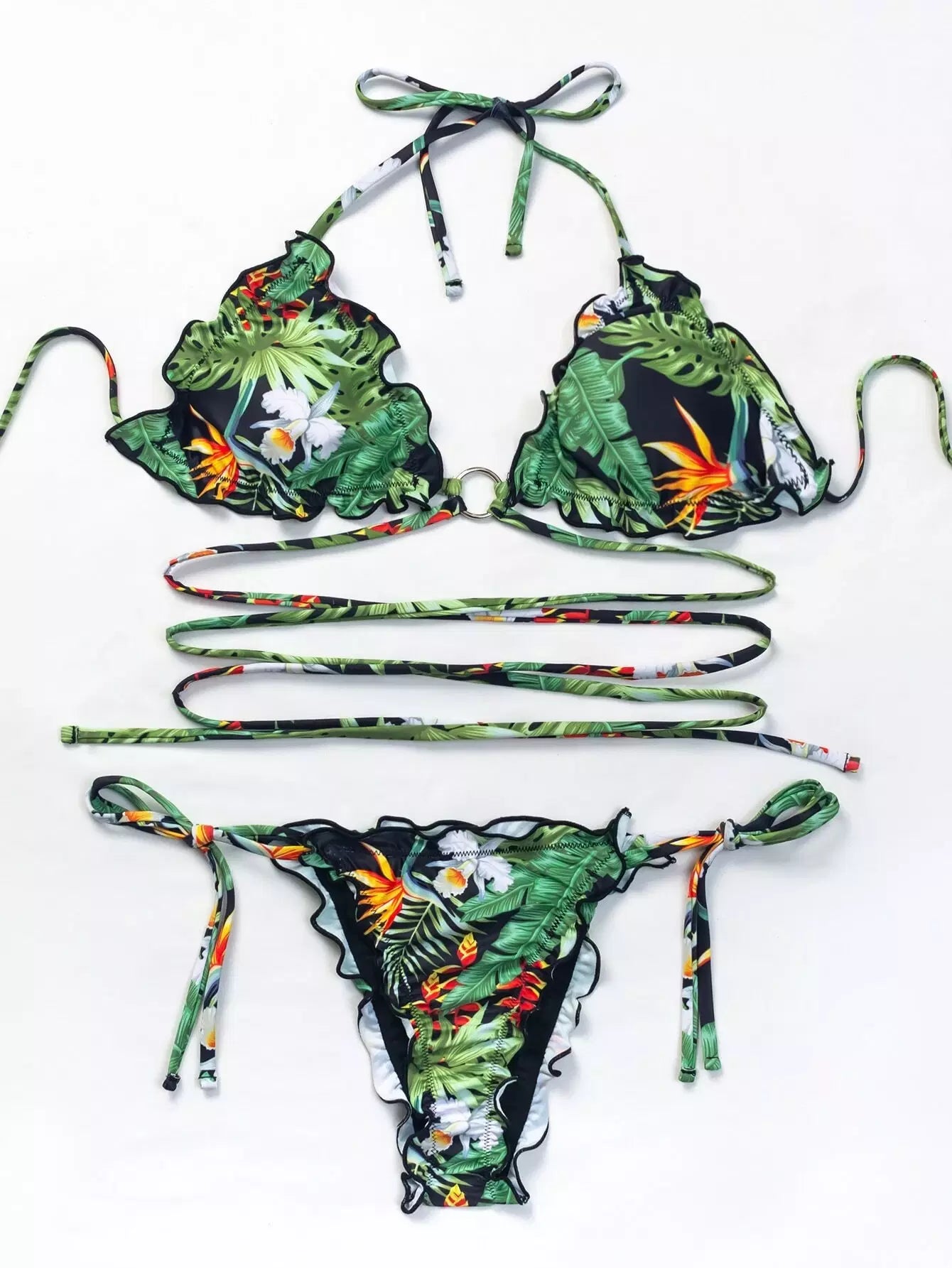 Tropical Lettuce Trim Tie Side Bikini Swimsuit