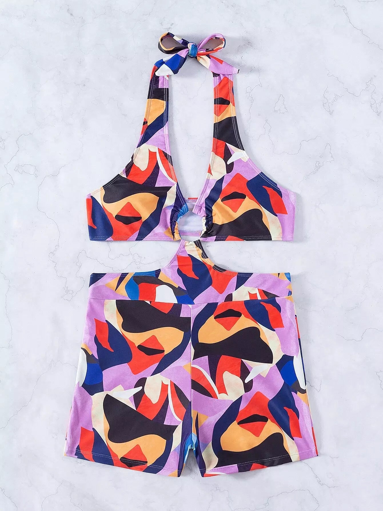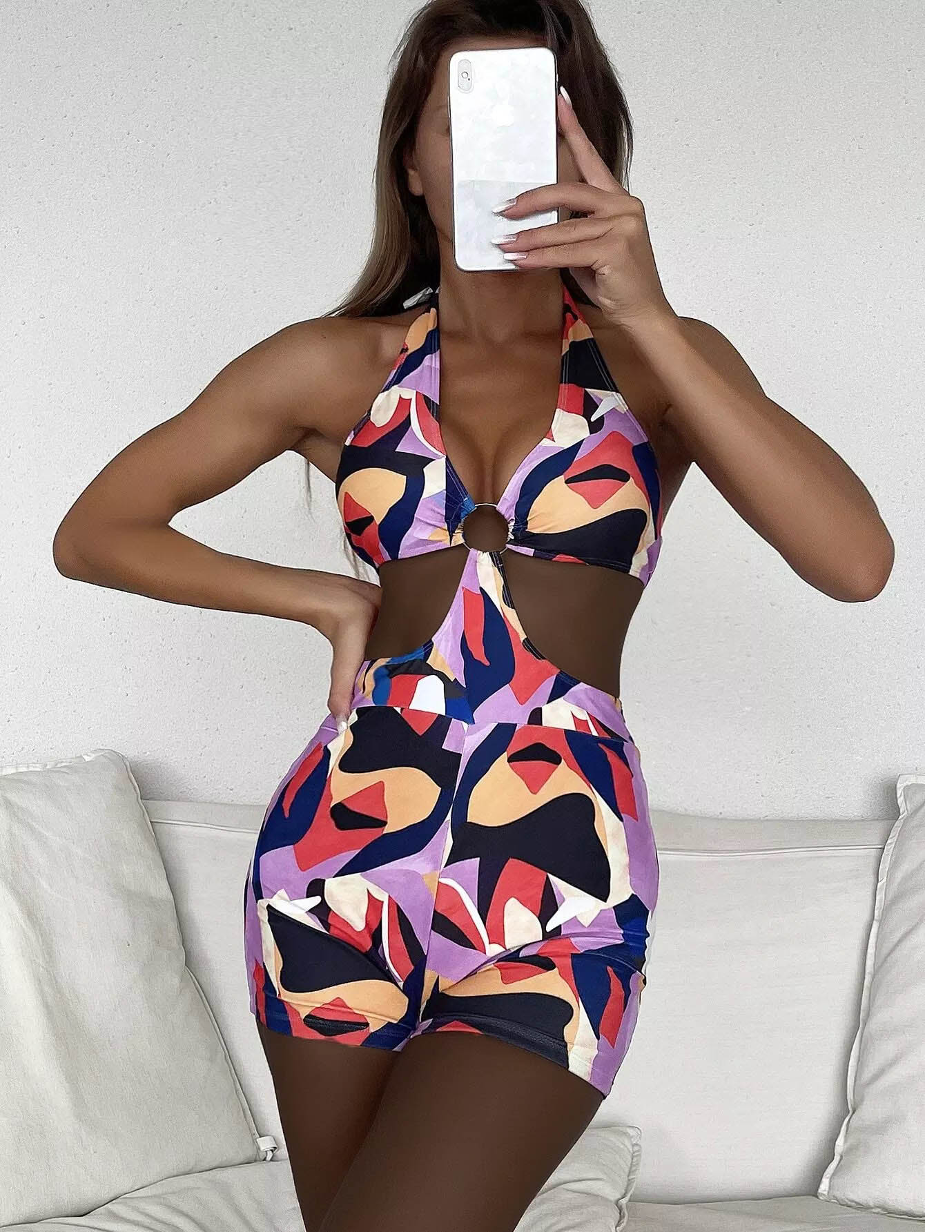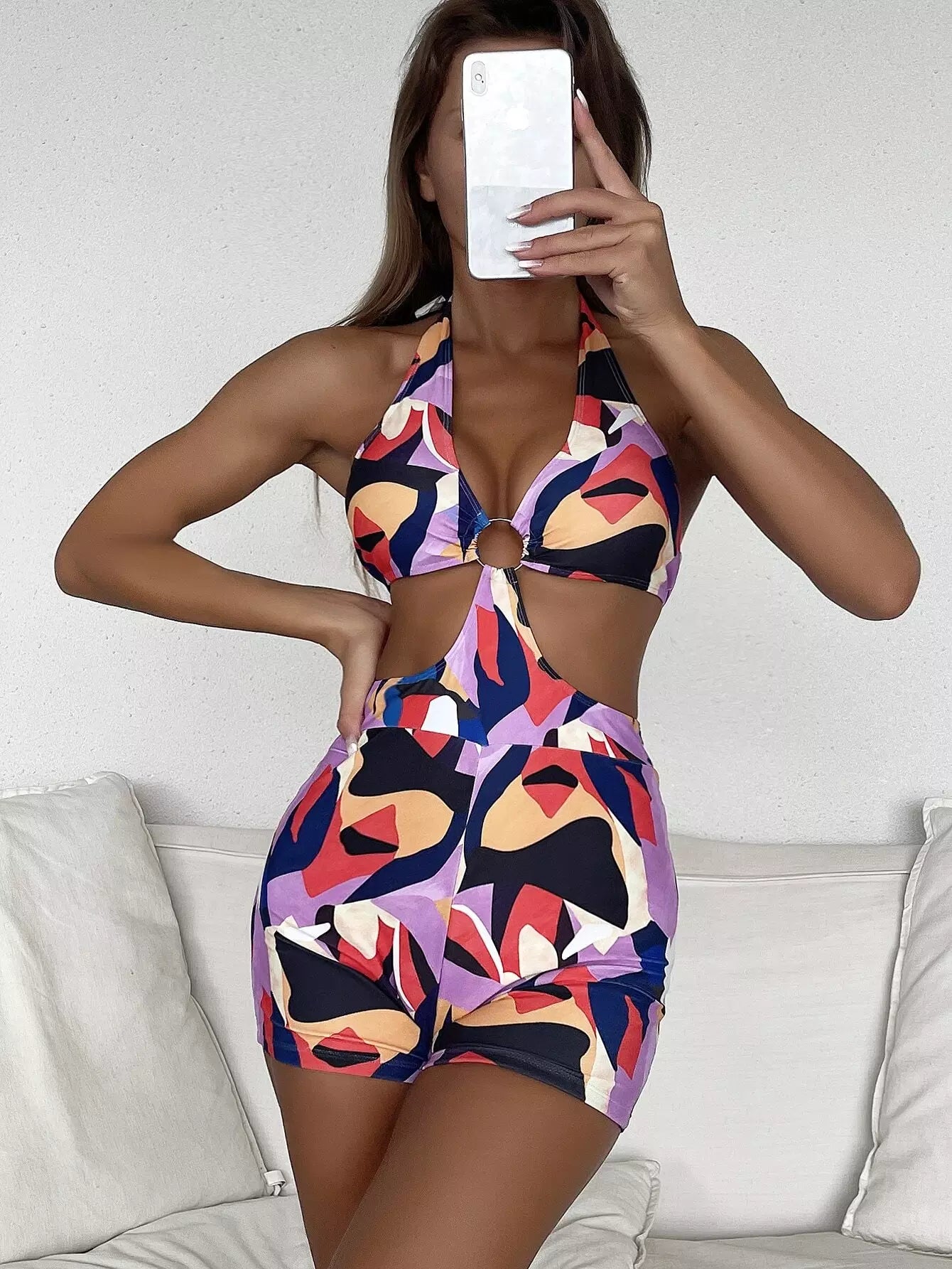 Allover Print Ring Linked Halter One Piece Swimsuit