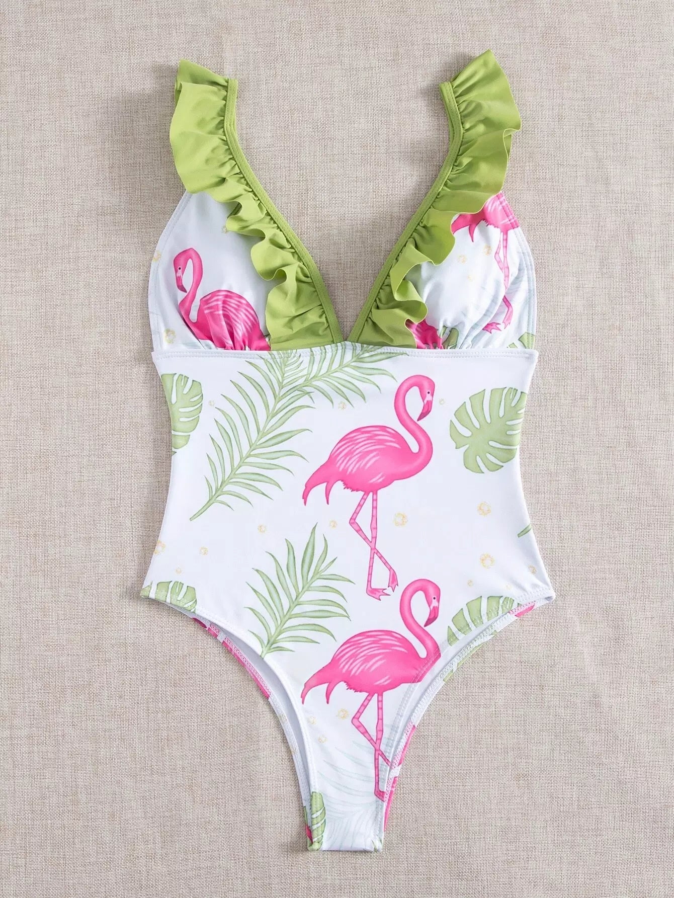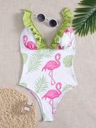 Flamingo Graphic Ruffle Trim One Piece Swimsuit