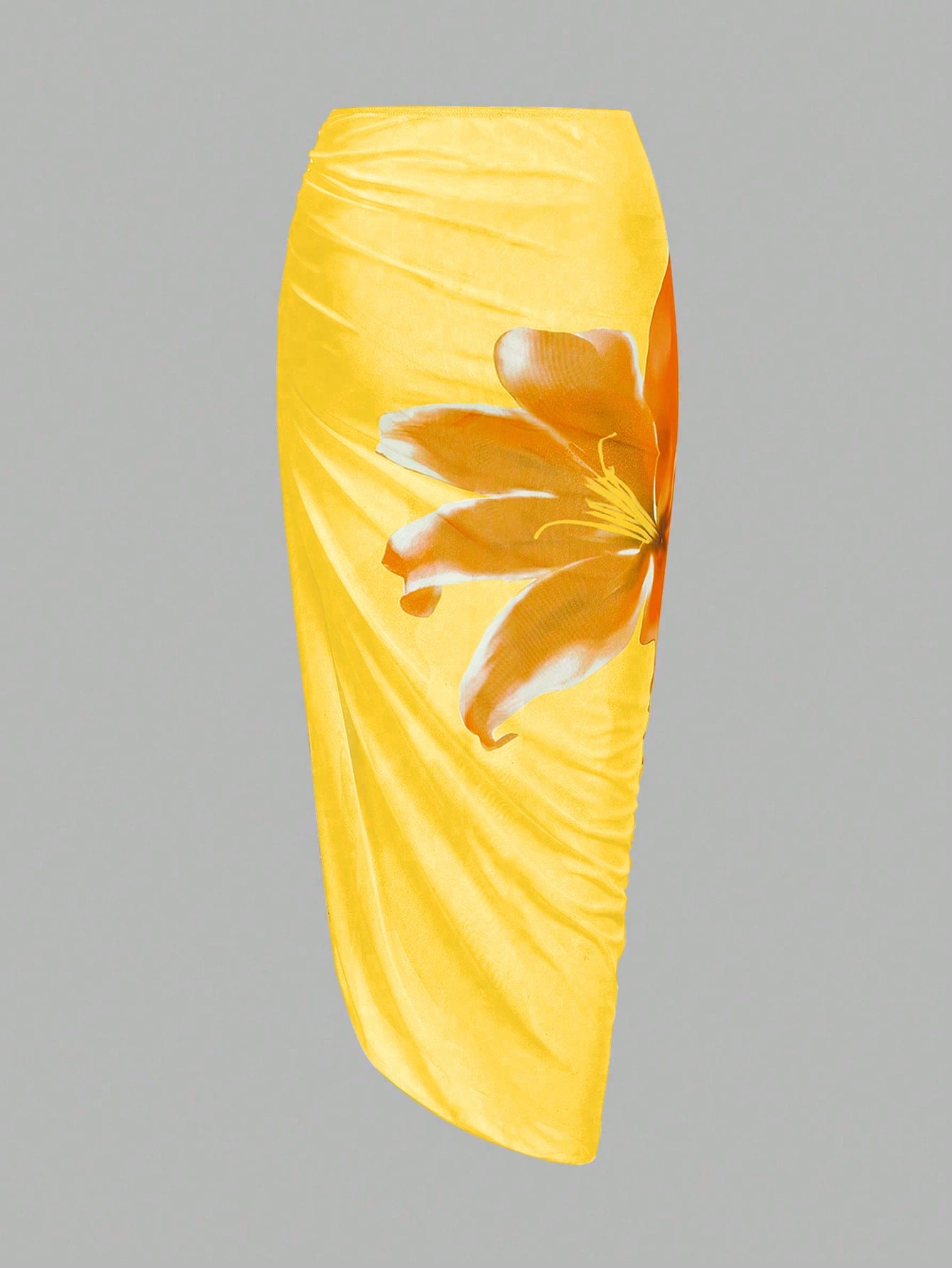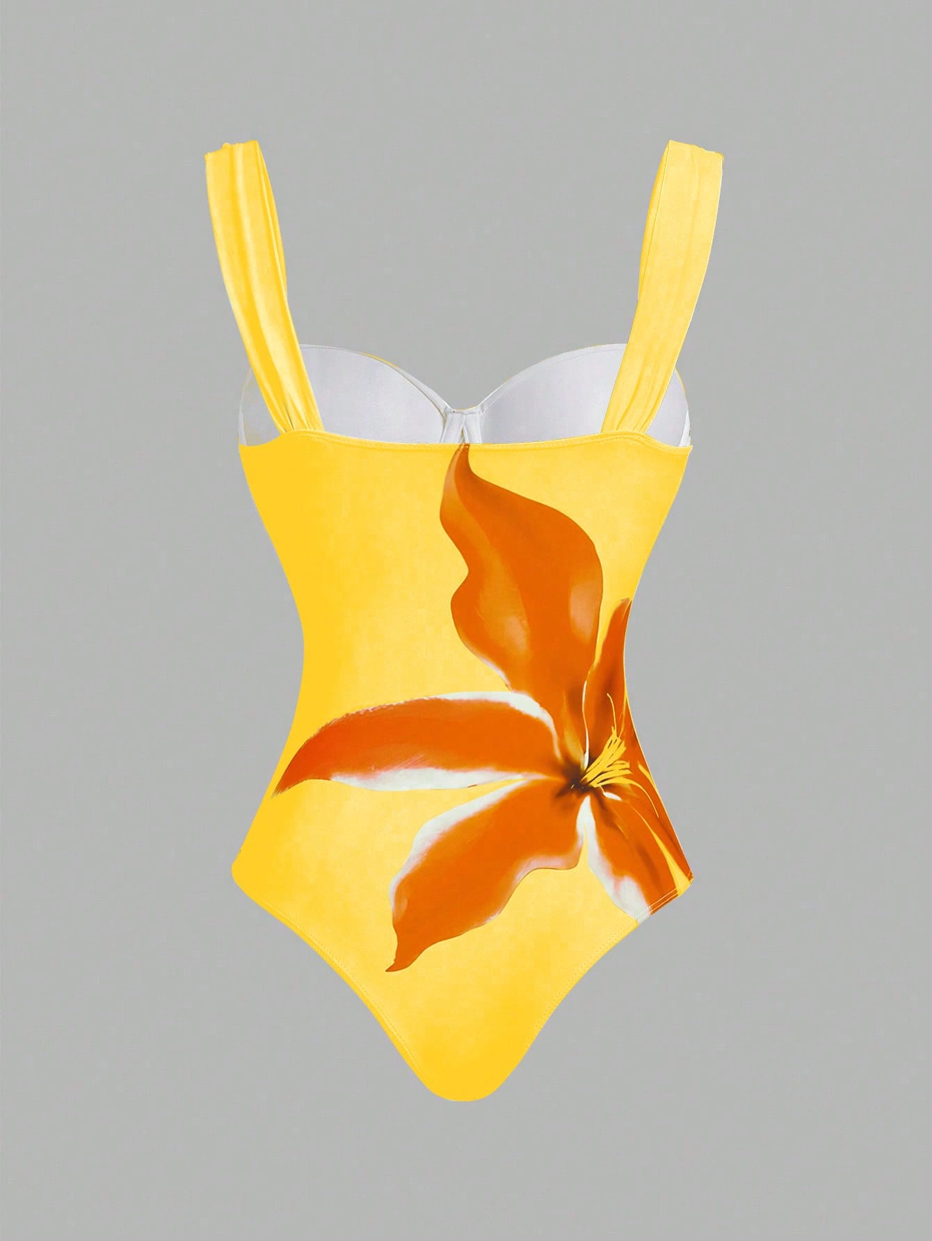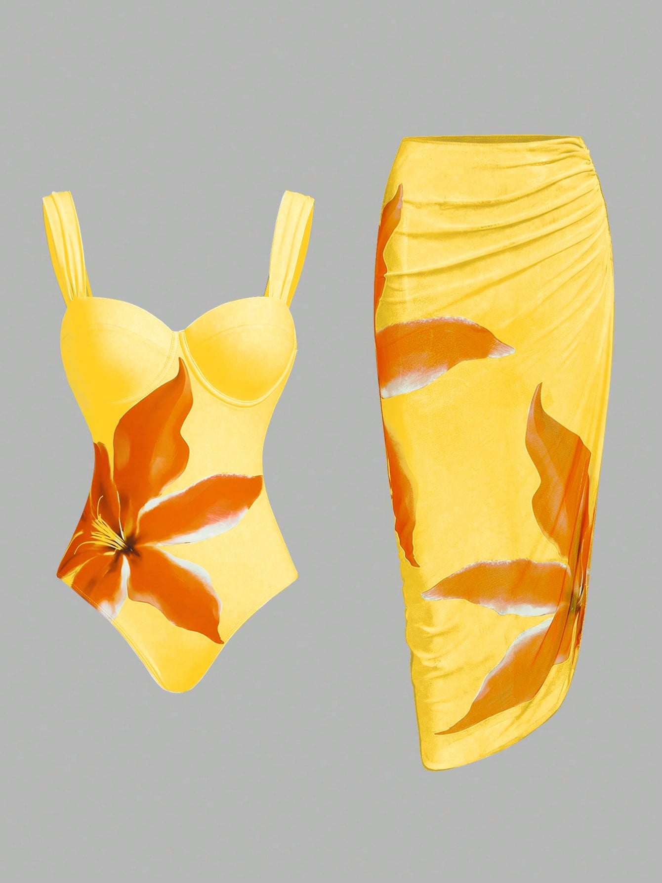 Swim Oasis Women Vacation Beach Flower Print One-Piece Swimsuit With Cover-Up And Skirt For Summer