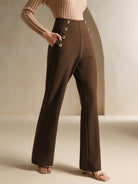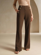Anewsta Urban Deep Coffee Metallic Buckle Decor Elastic Slim Fit Flared Leg Pants, Versatile & Slimming
