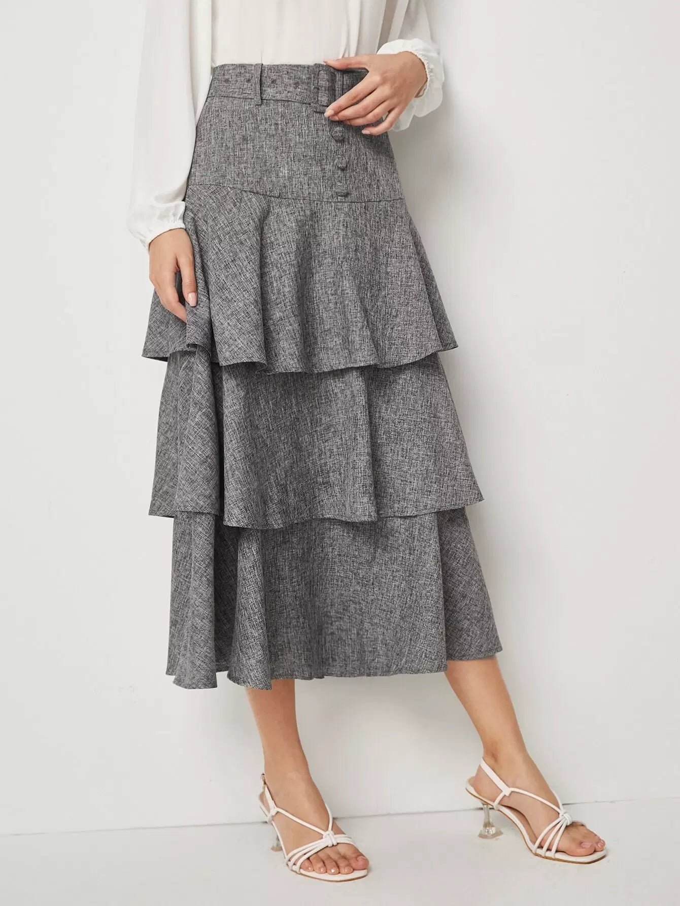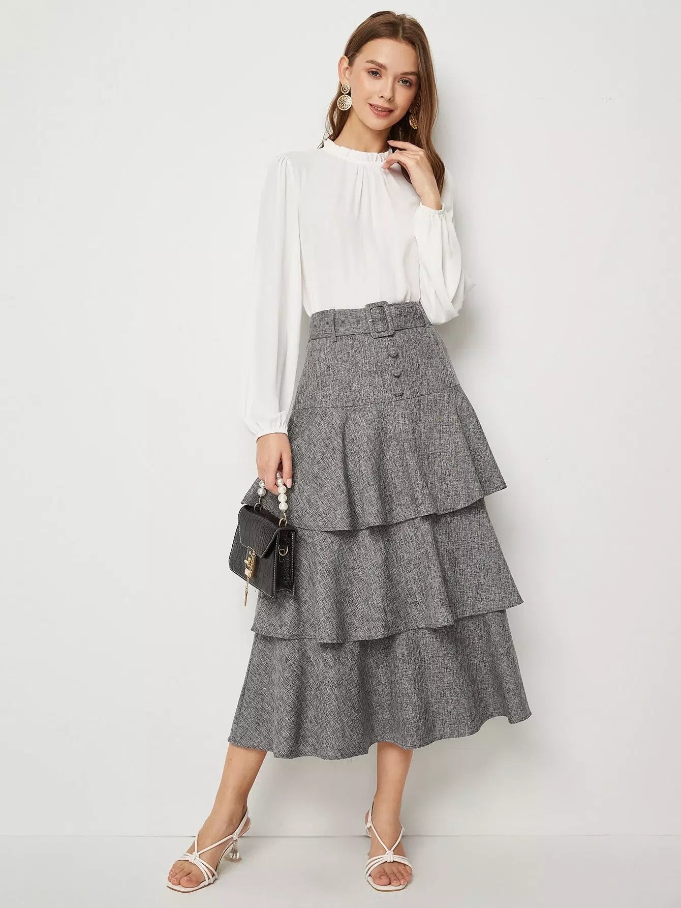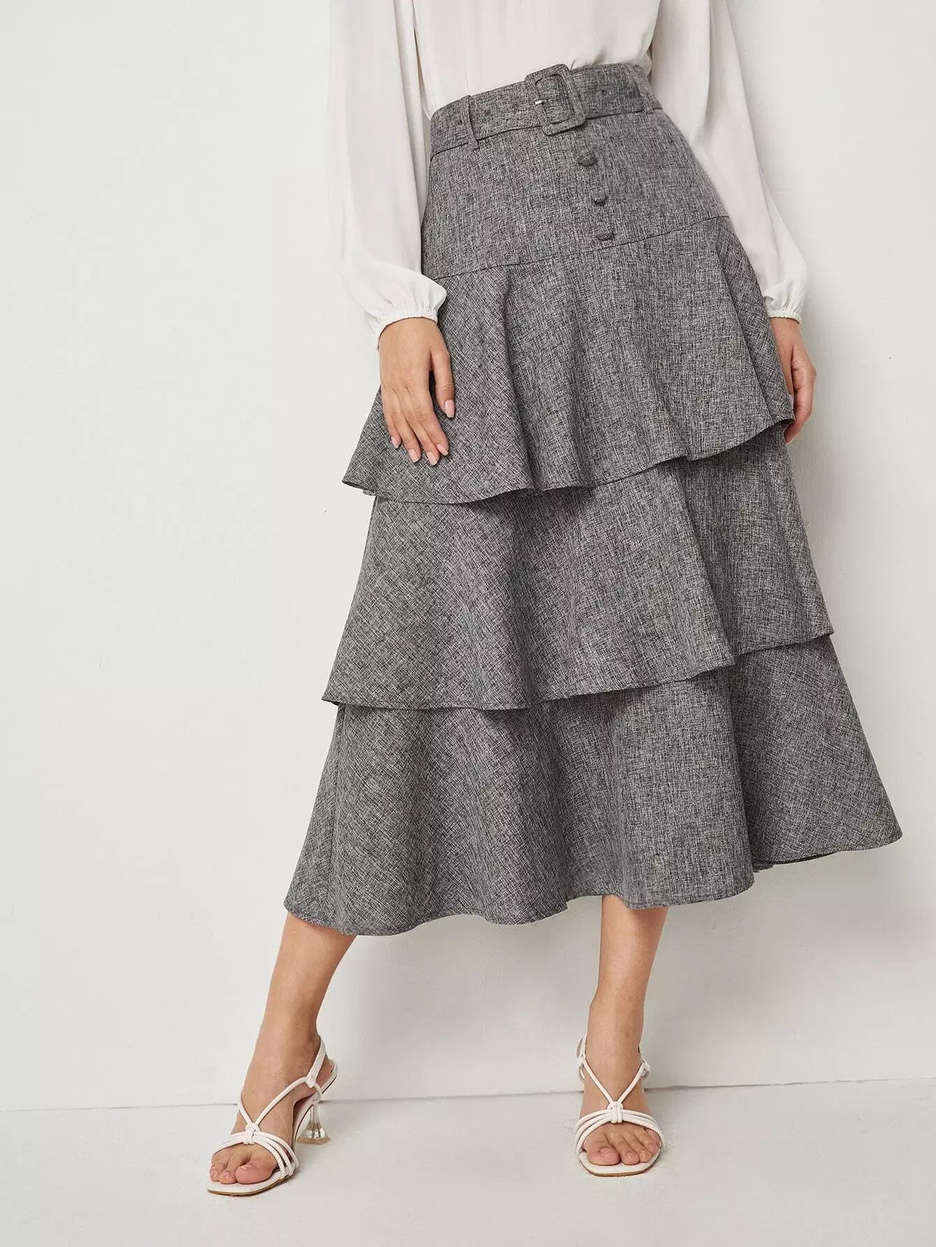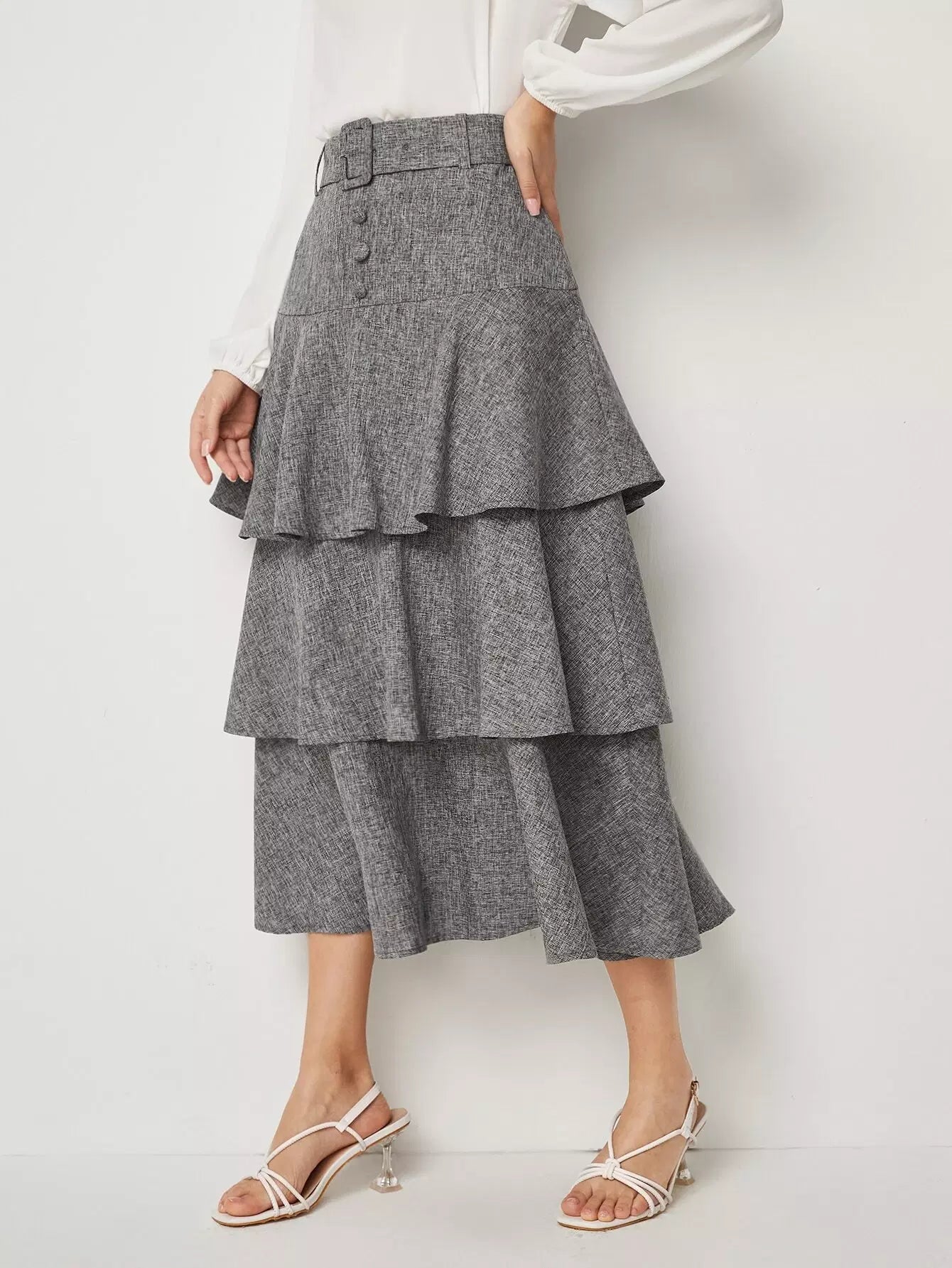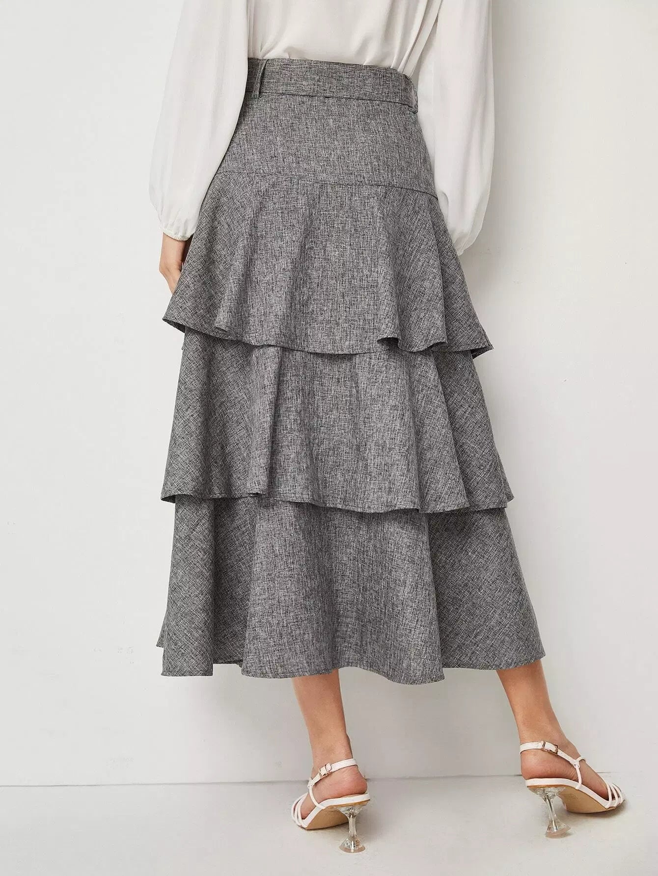 Buckle Layered Ruffle Hem Skirt Without Belt