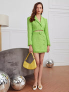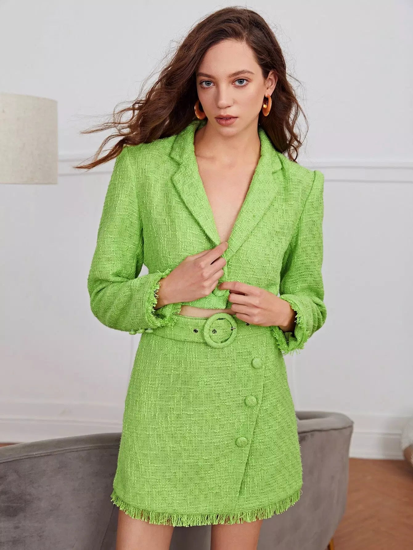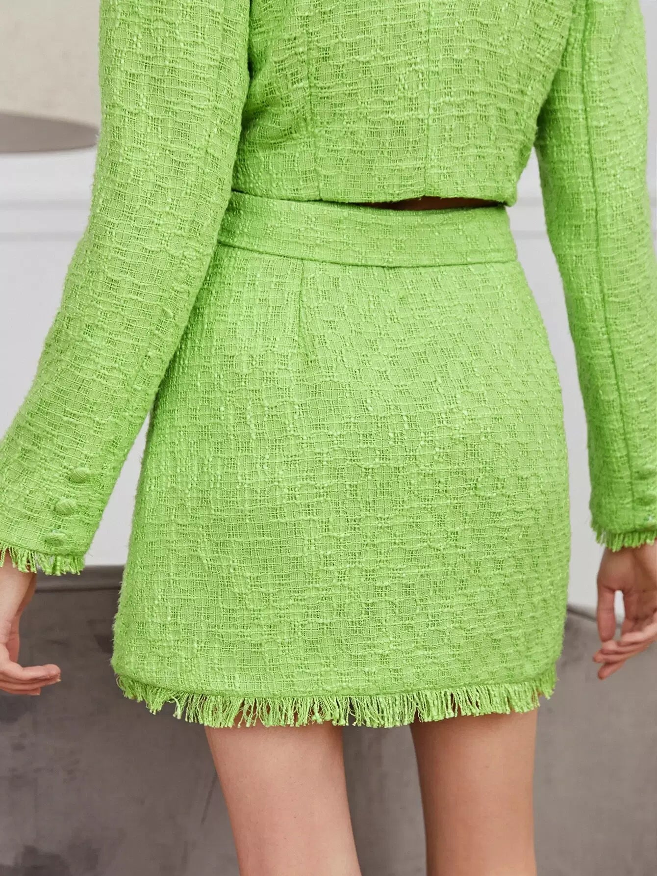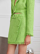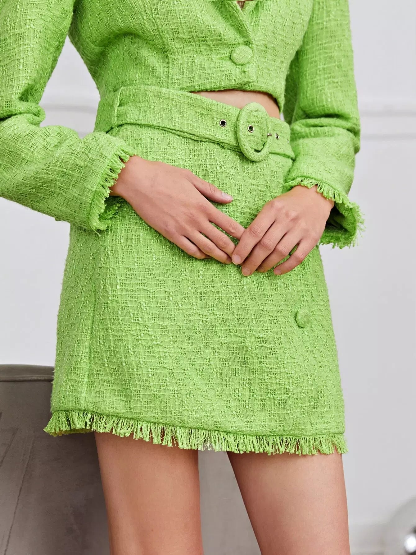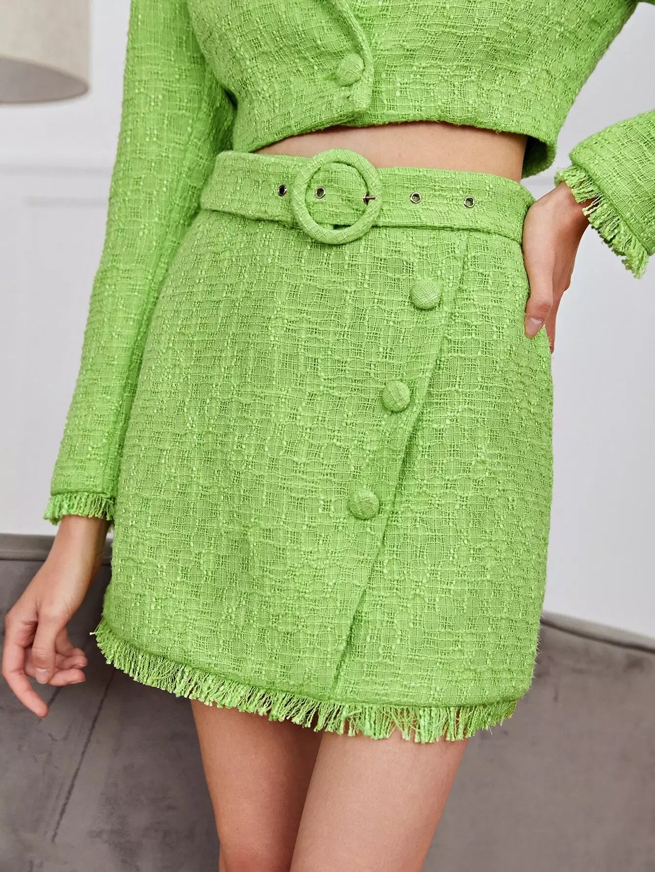 Button Detail Raw Hem Buckled Tweed Skirt Without Belt