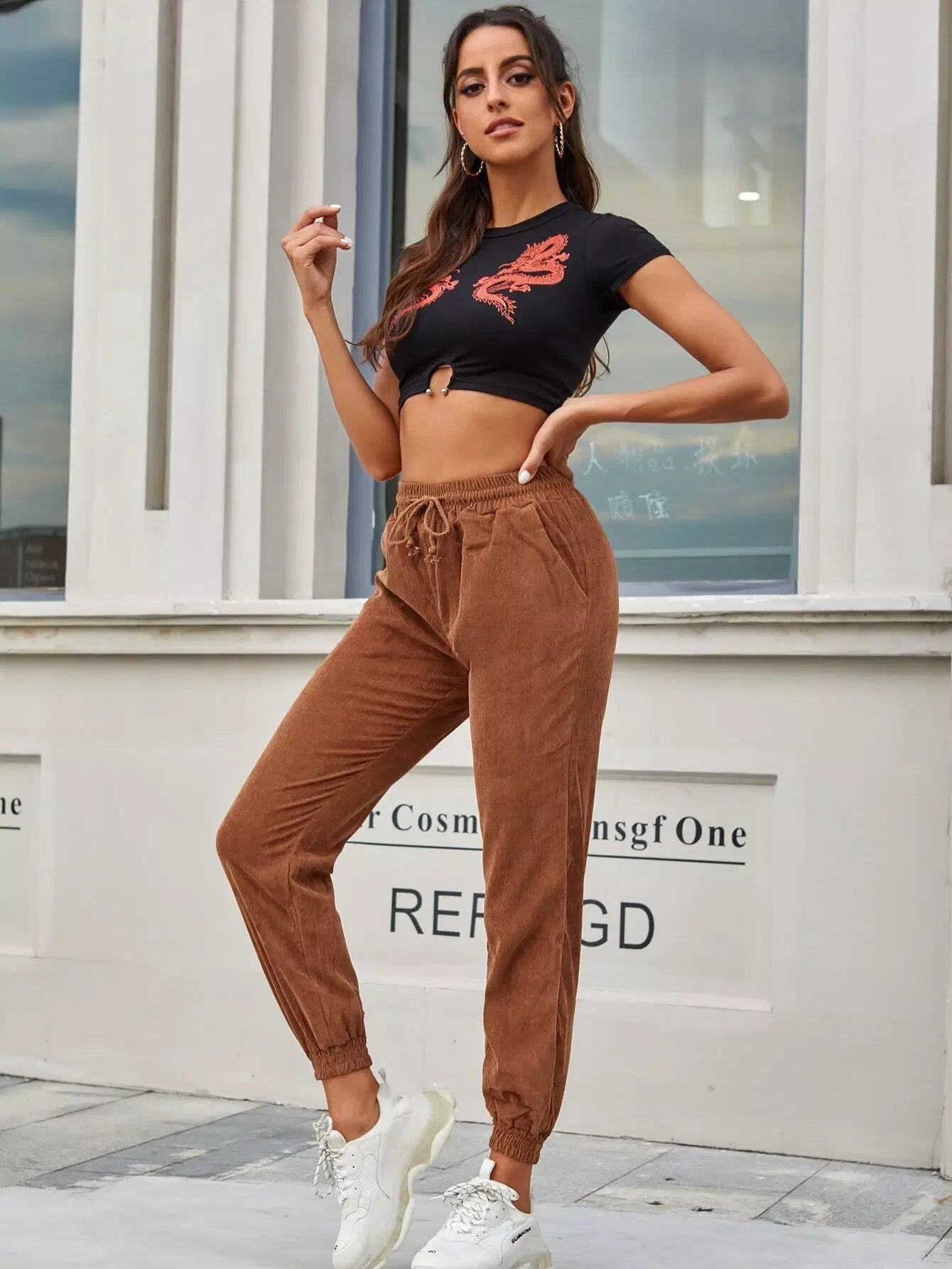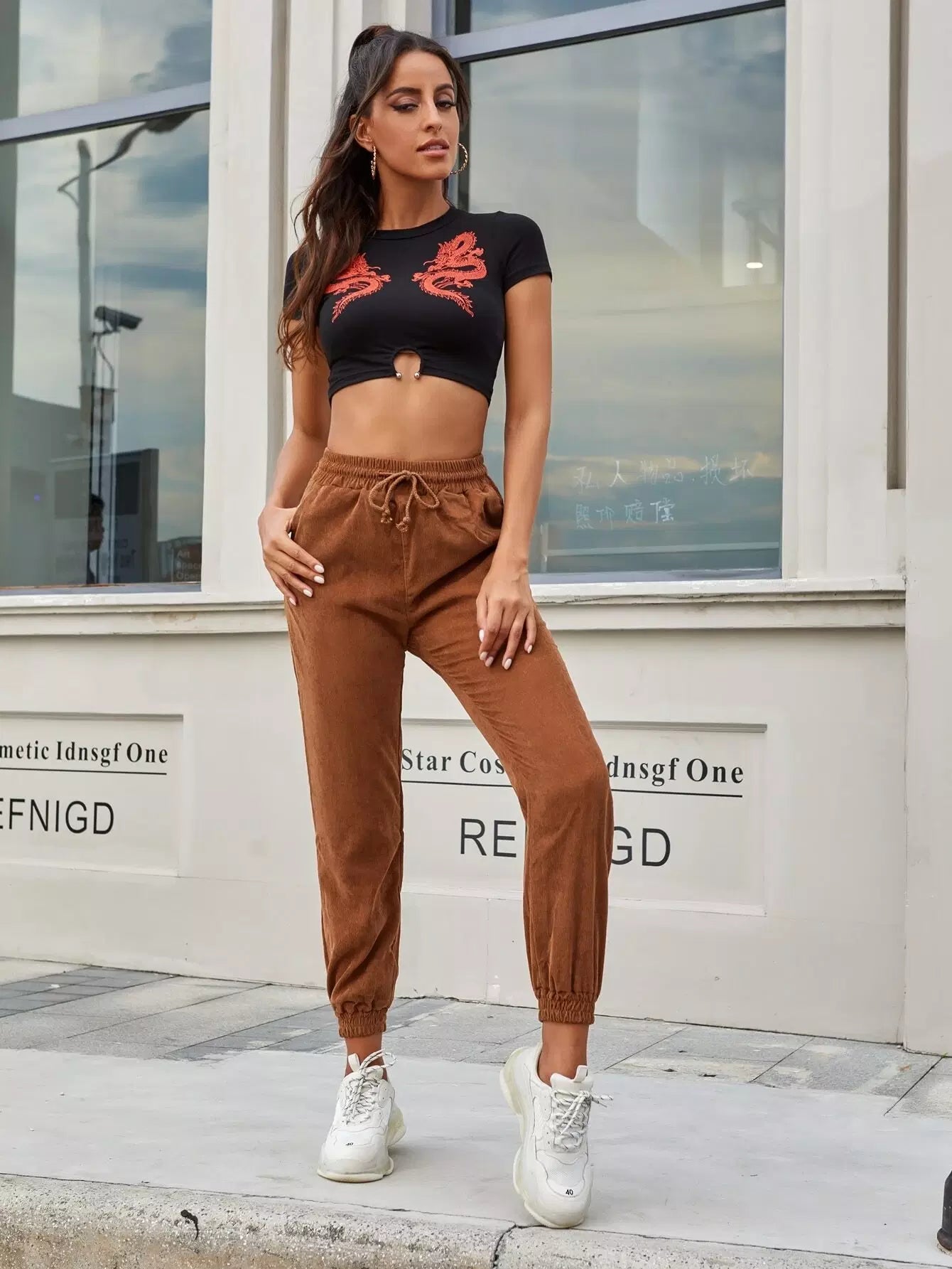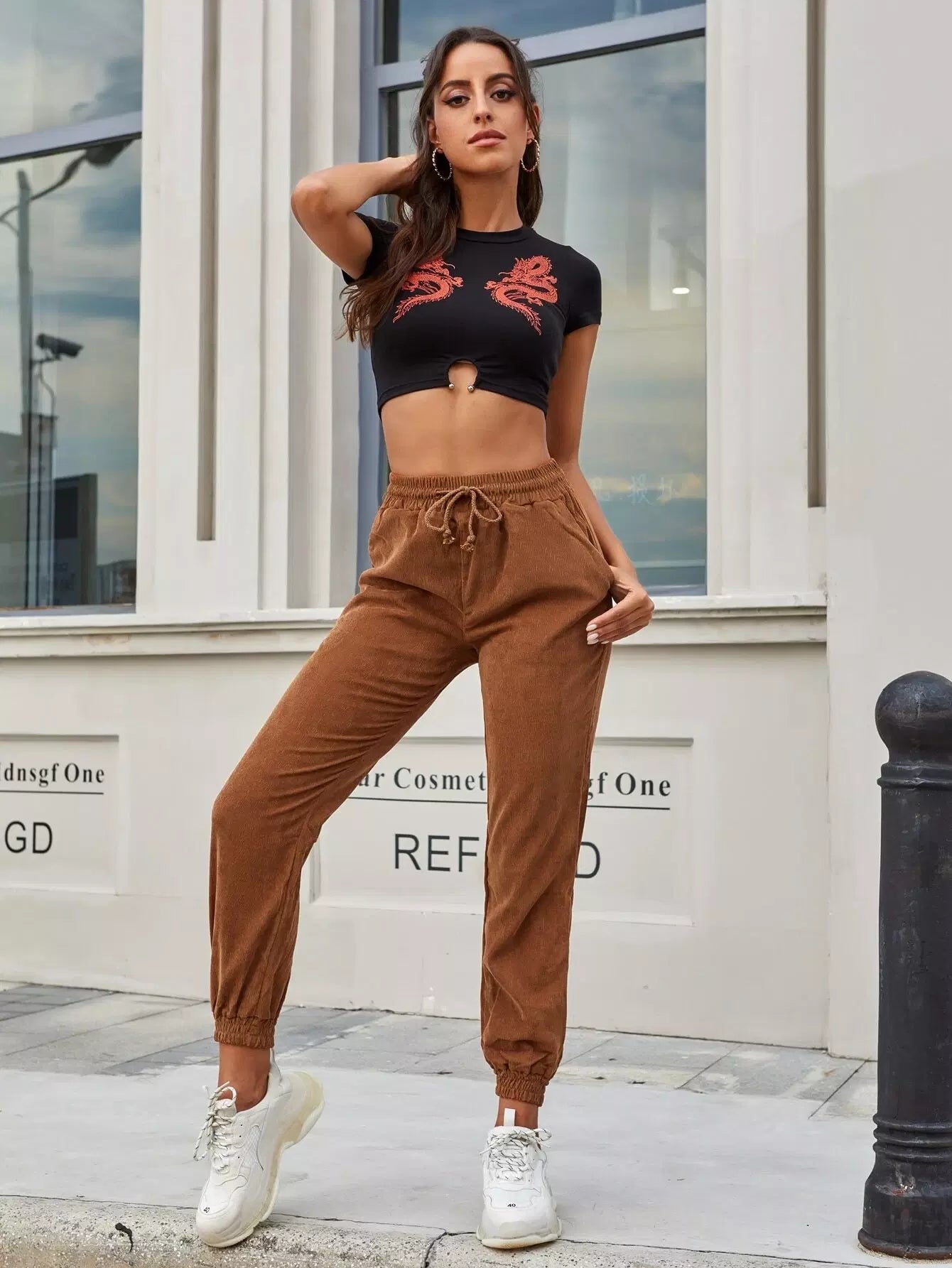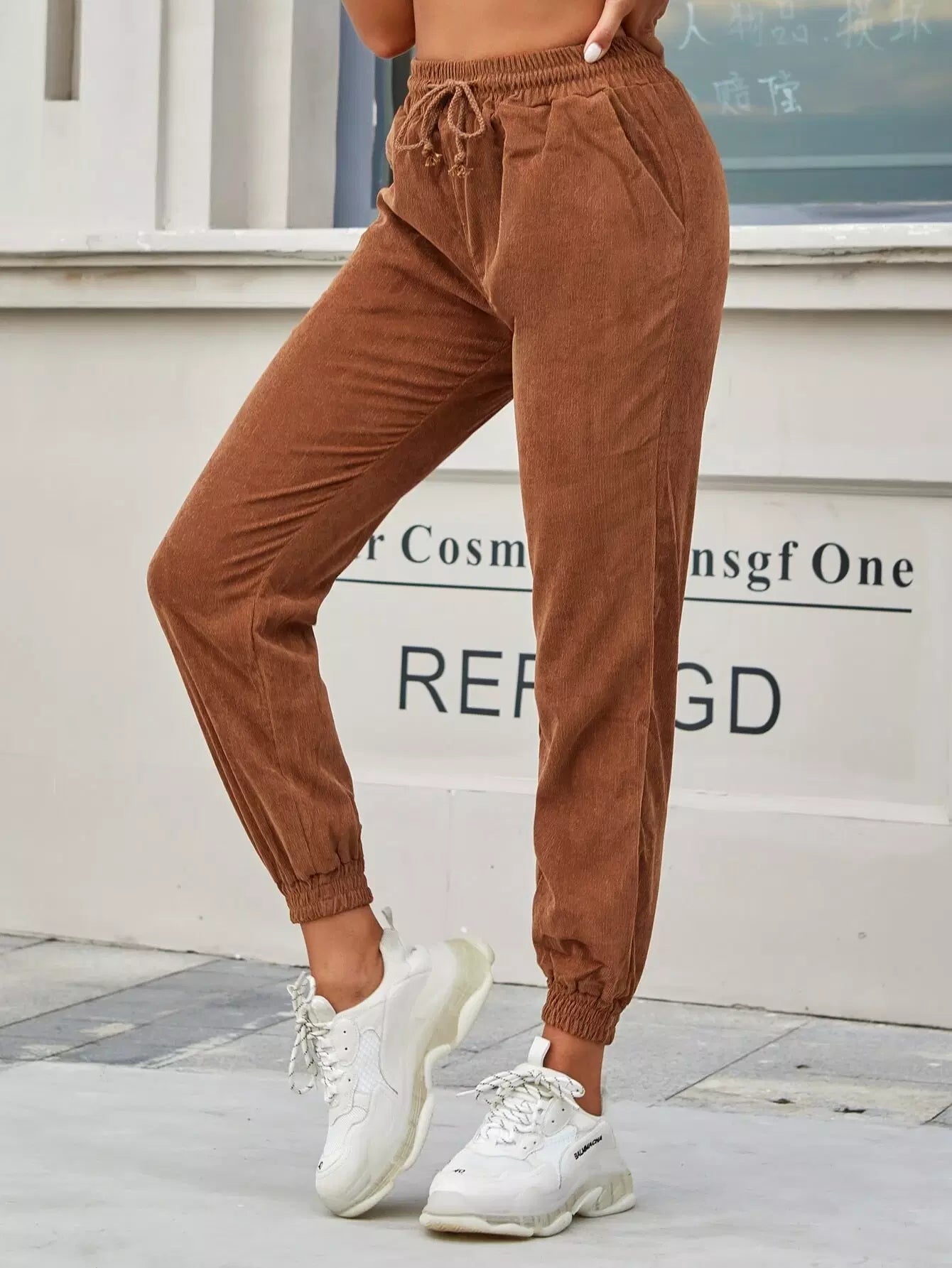 Drawstring Pocket Corduroy Carrot Pants