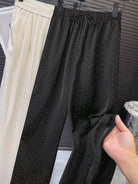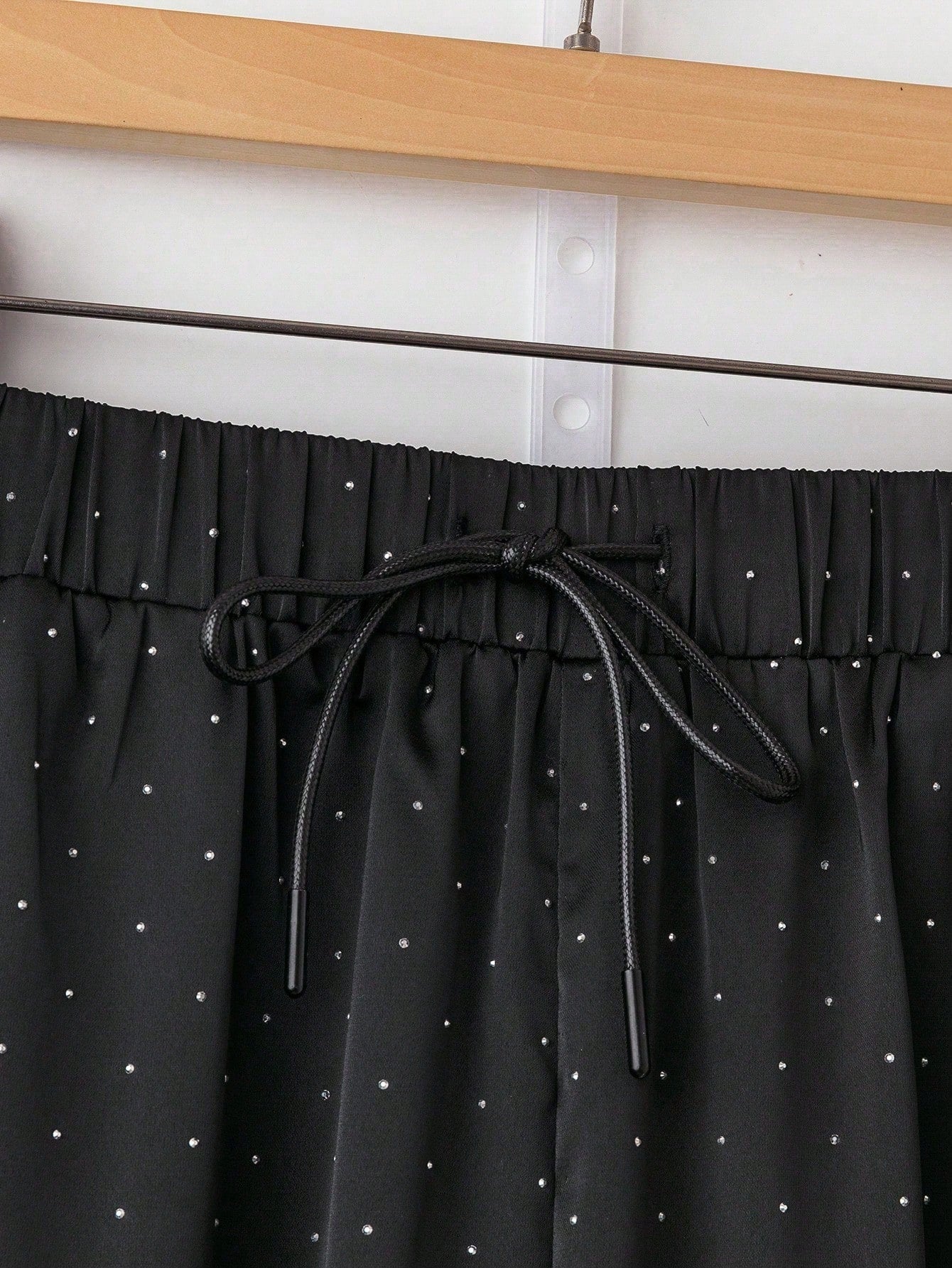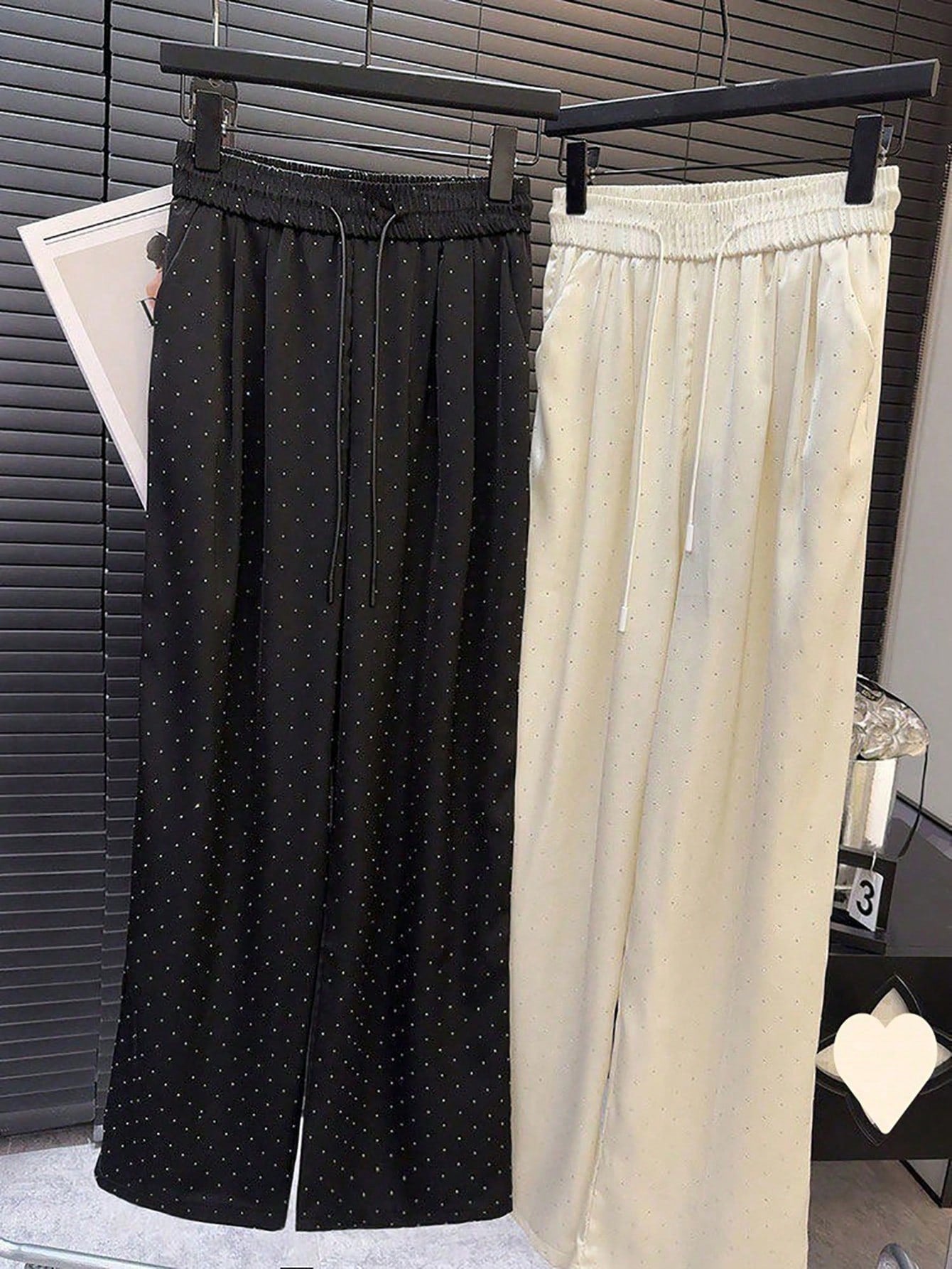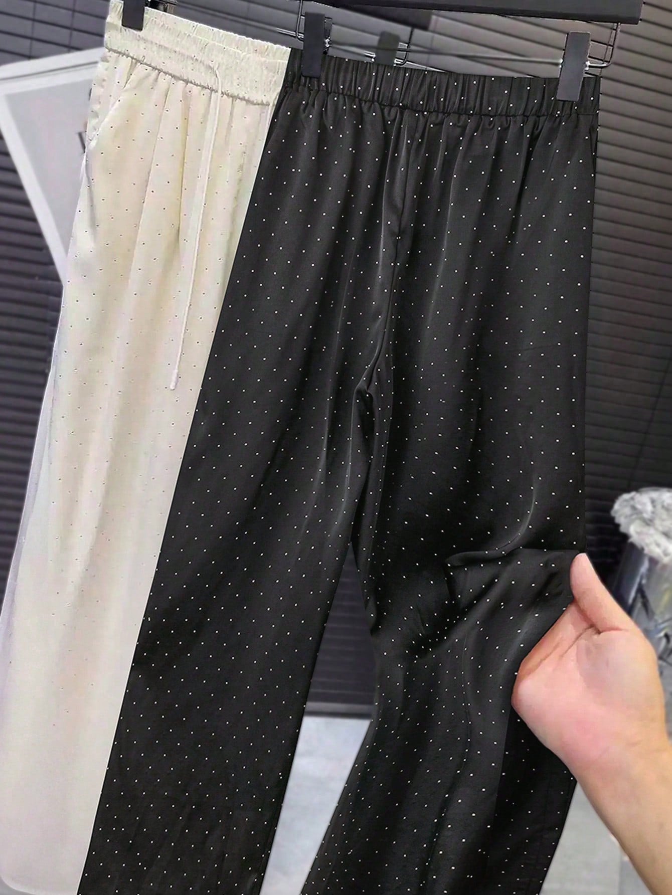 Franclia 1pc Ladies High Waist Rhinestone Satin Elastic Waist Drawstring Loose Straight Leg Pants Fall