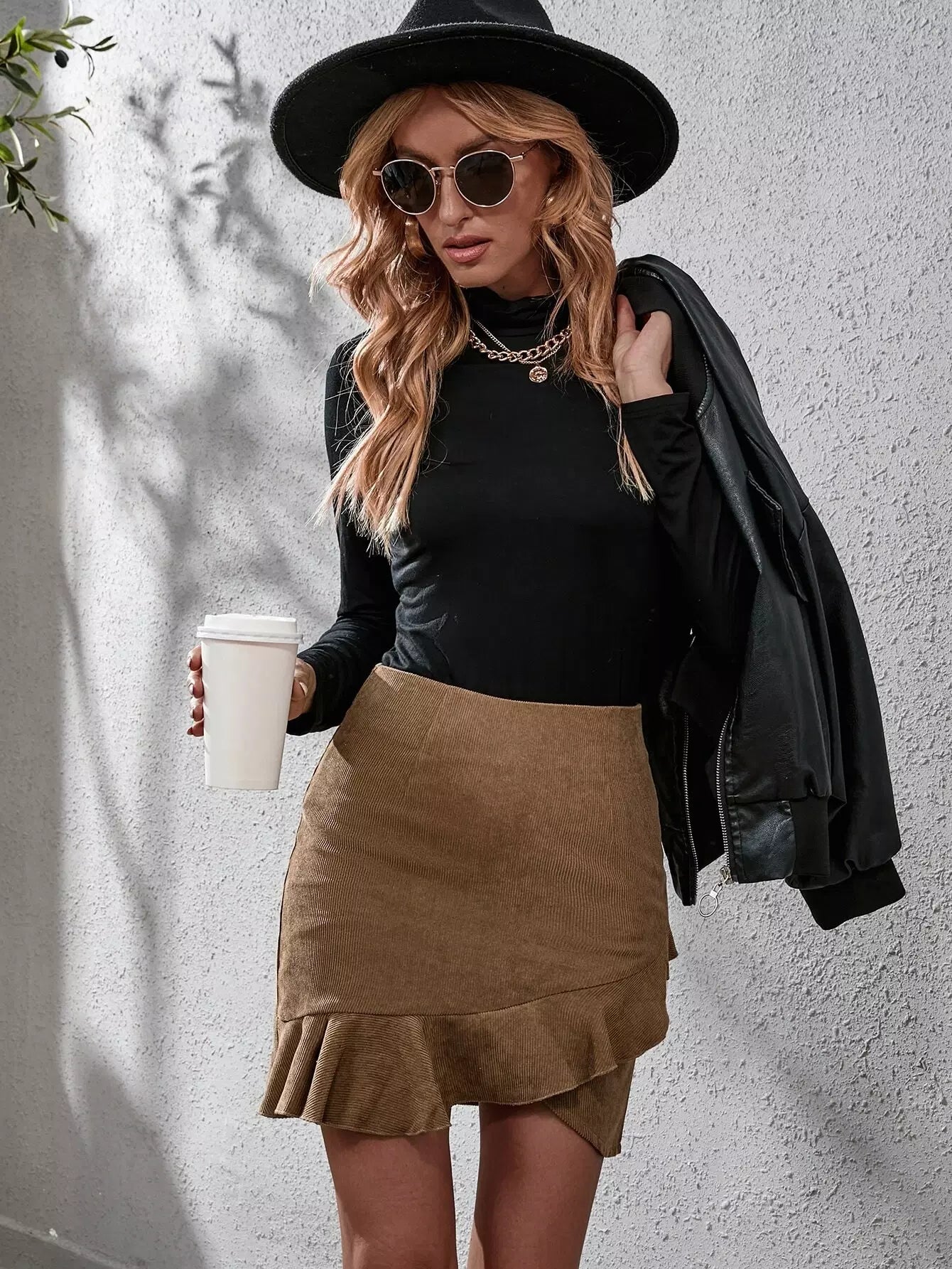 High Waist Asymmetrical Ruffle Hem Corduroy Skirt