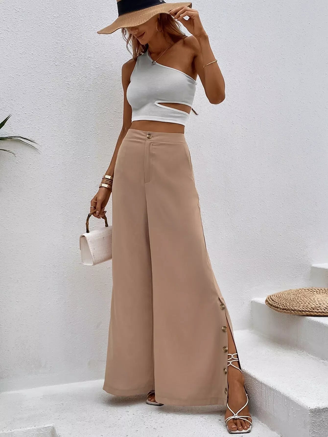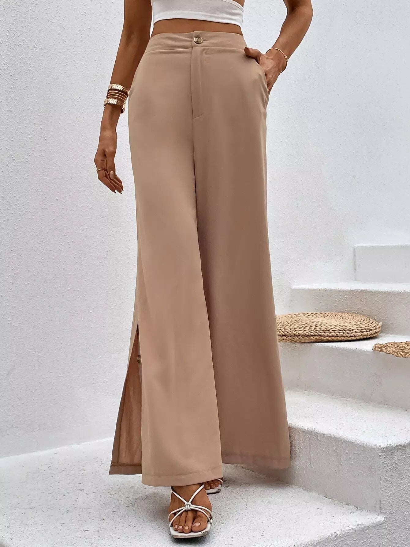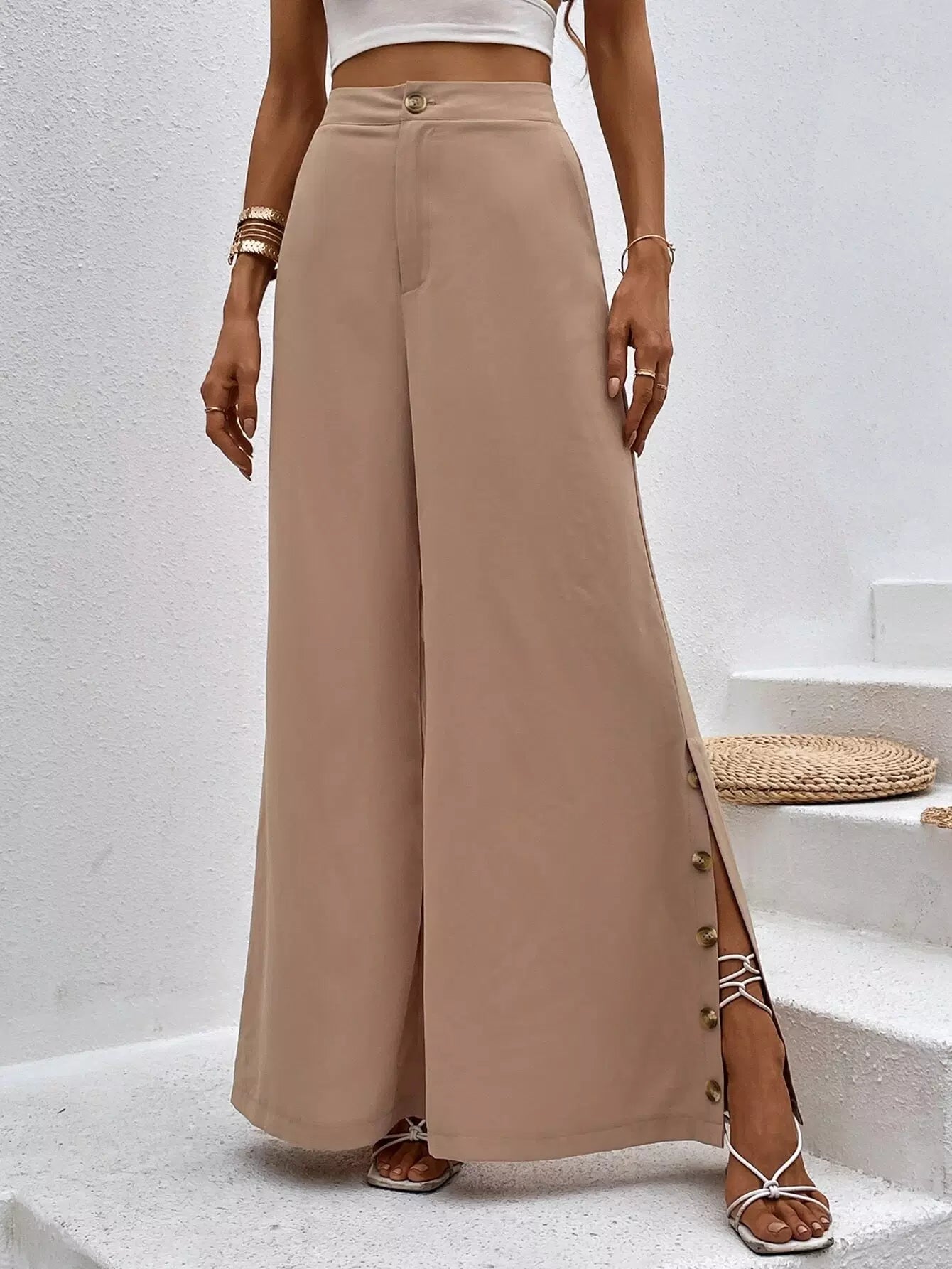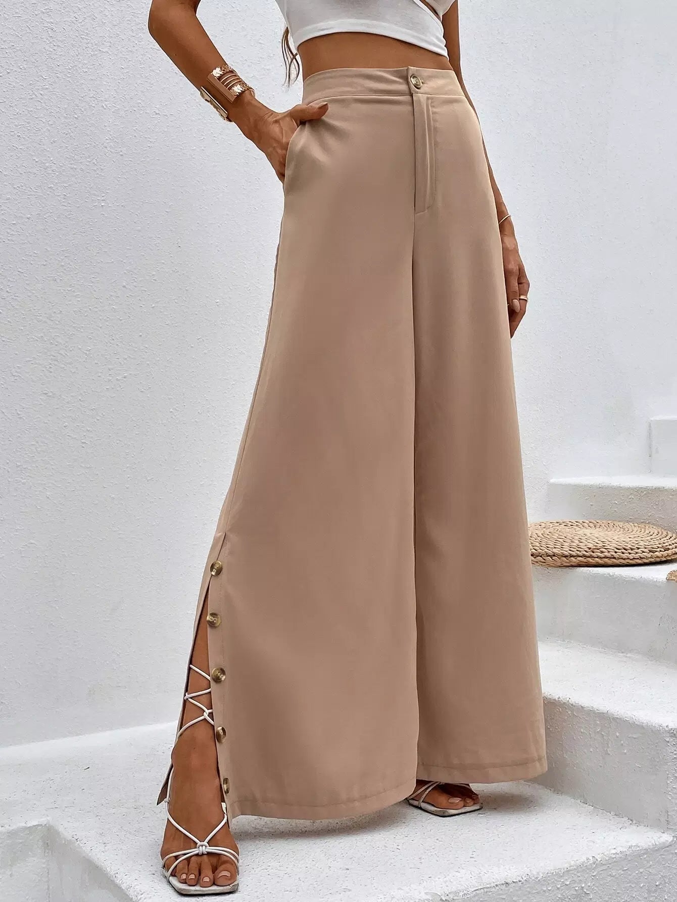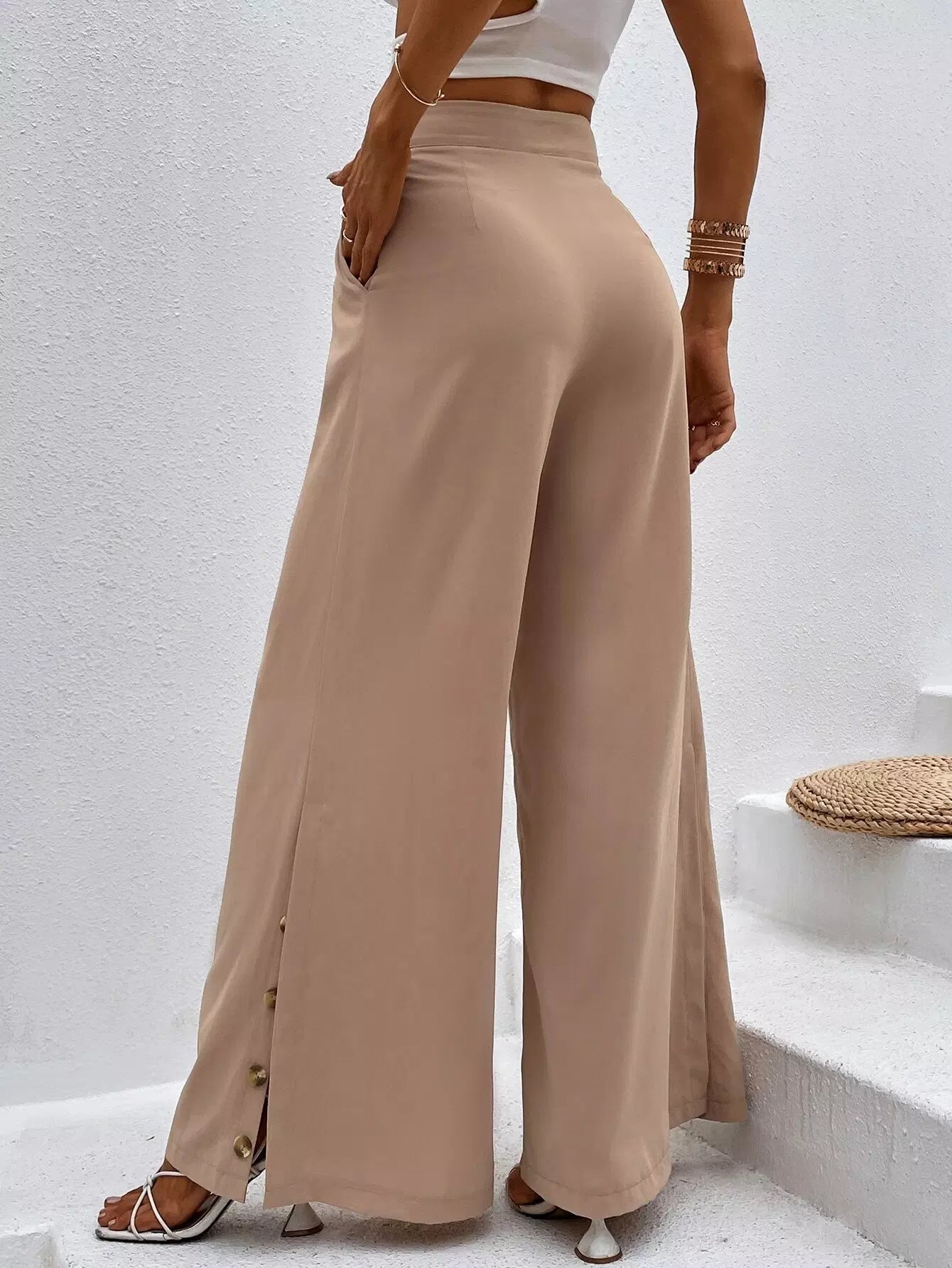 High Waist Button Detail Slit Hem Wide Leg Pants