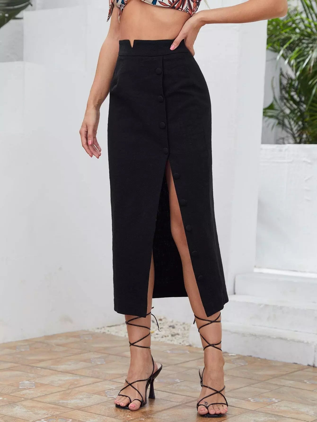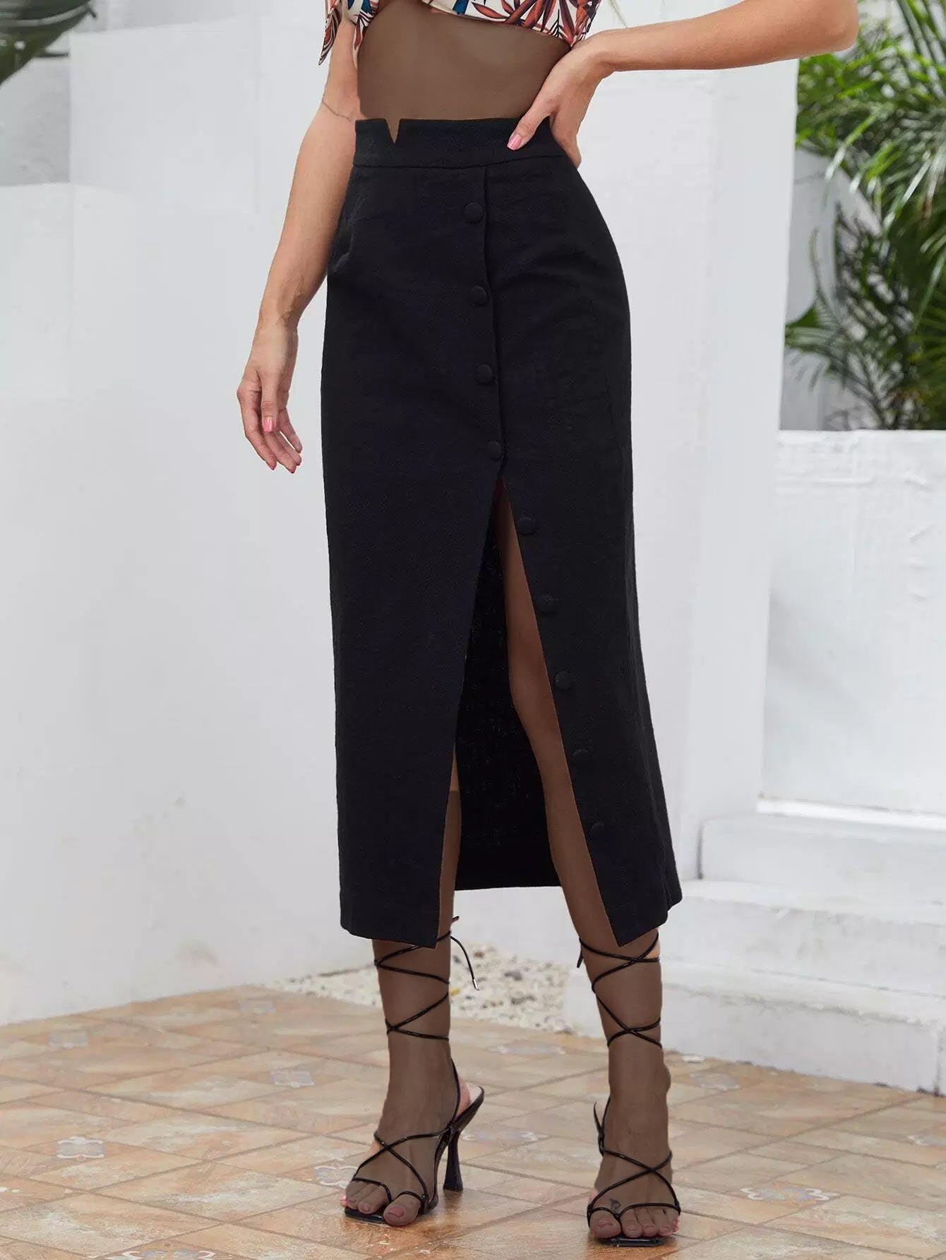 Notched Waistband Buttoned Front Split Thigh Skirt
