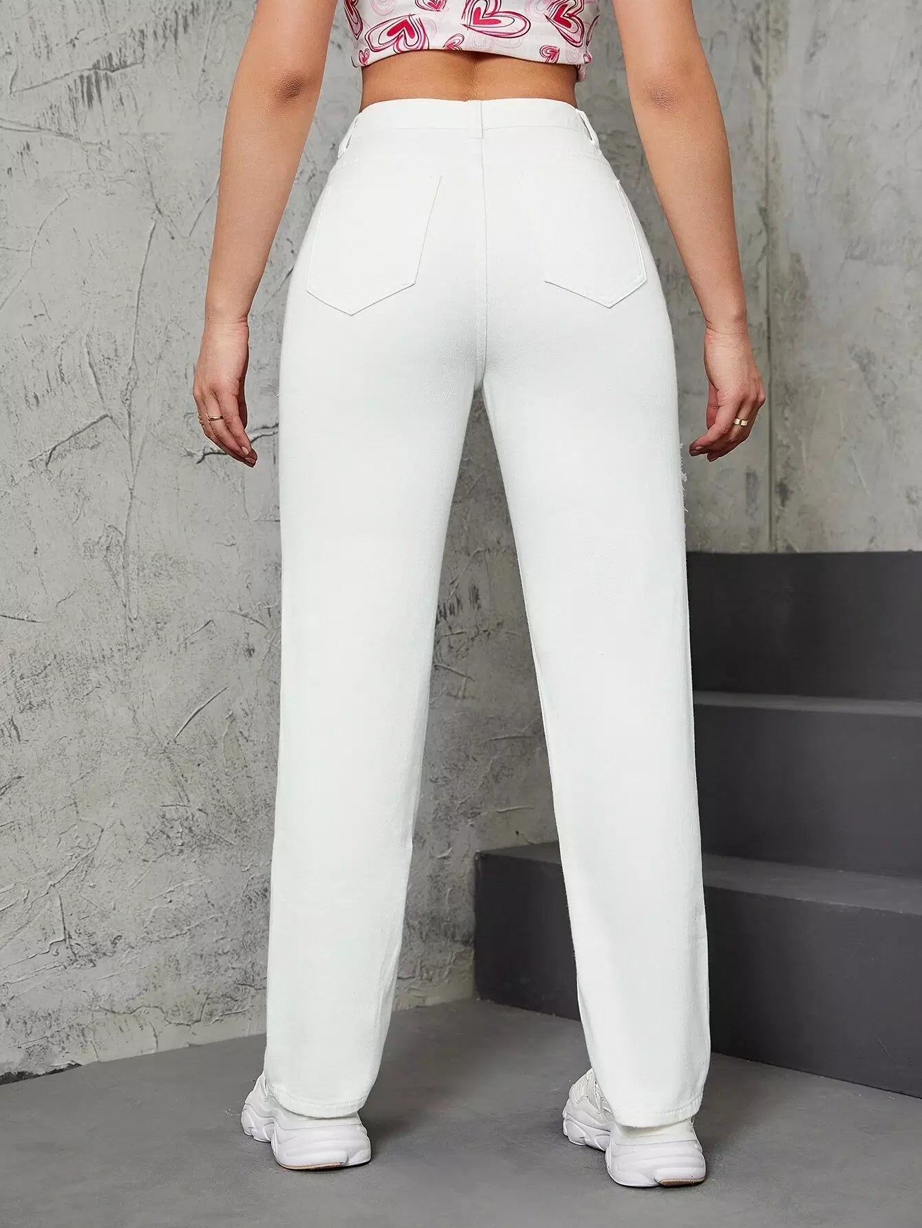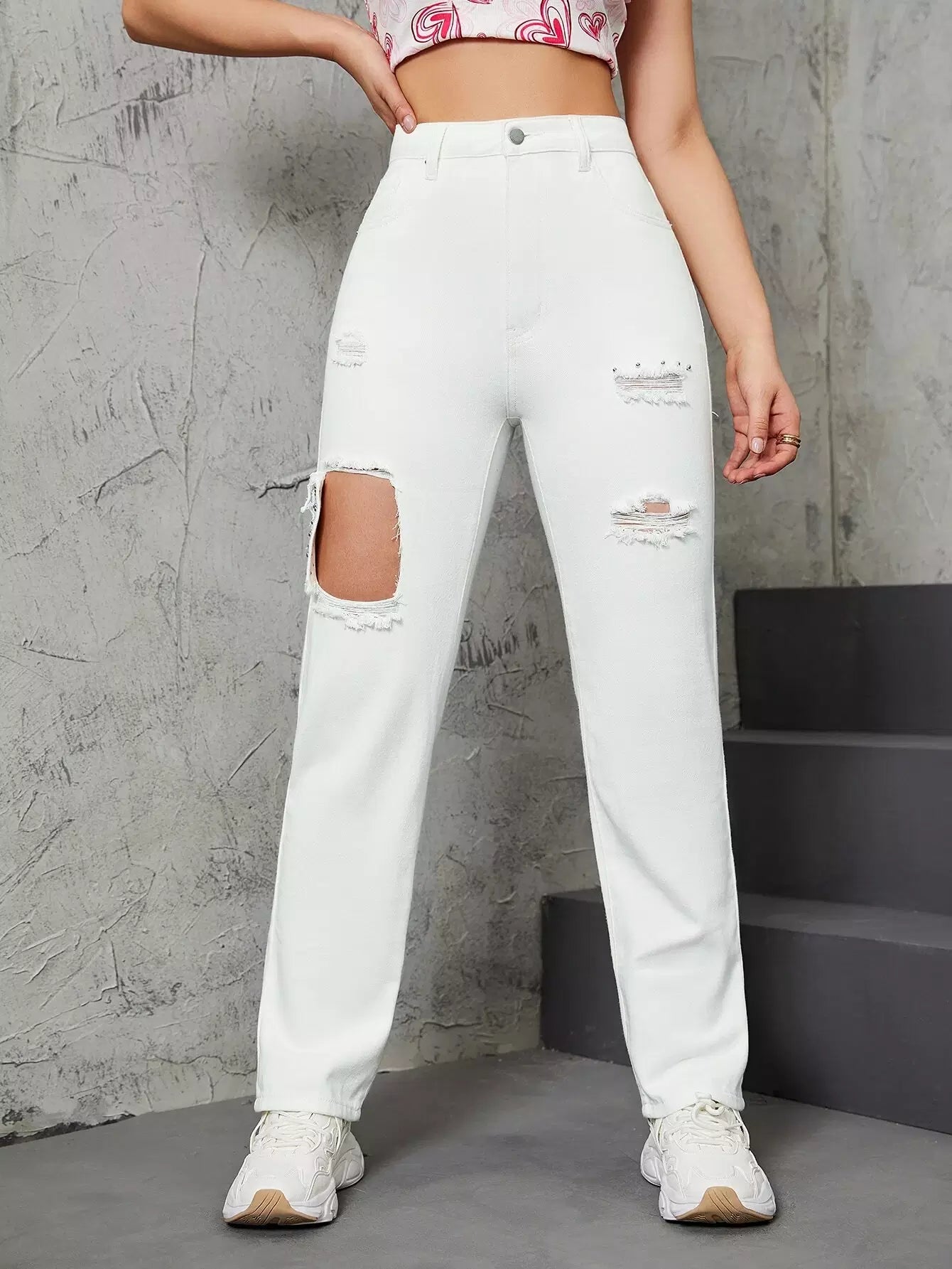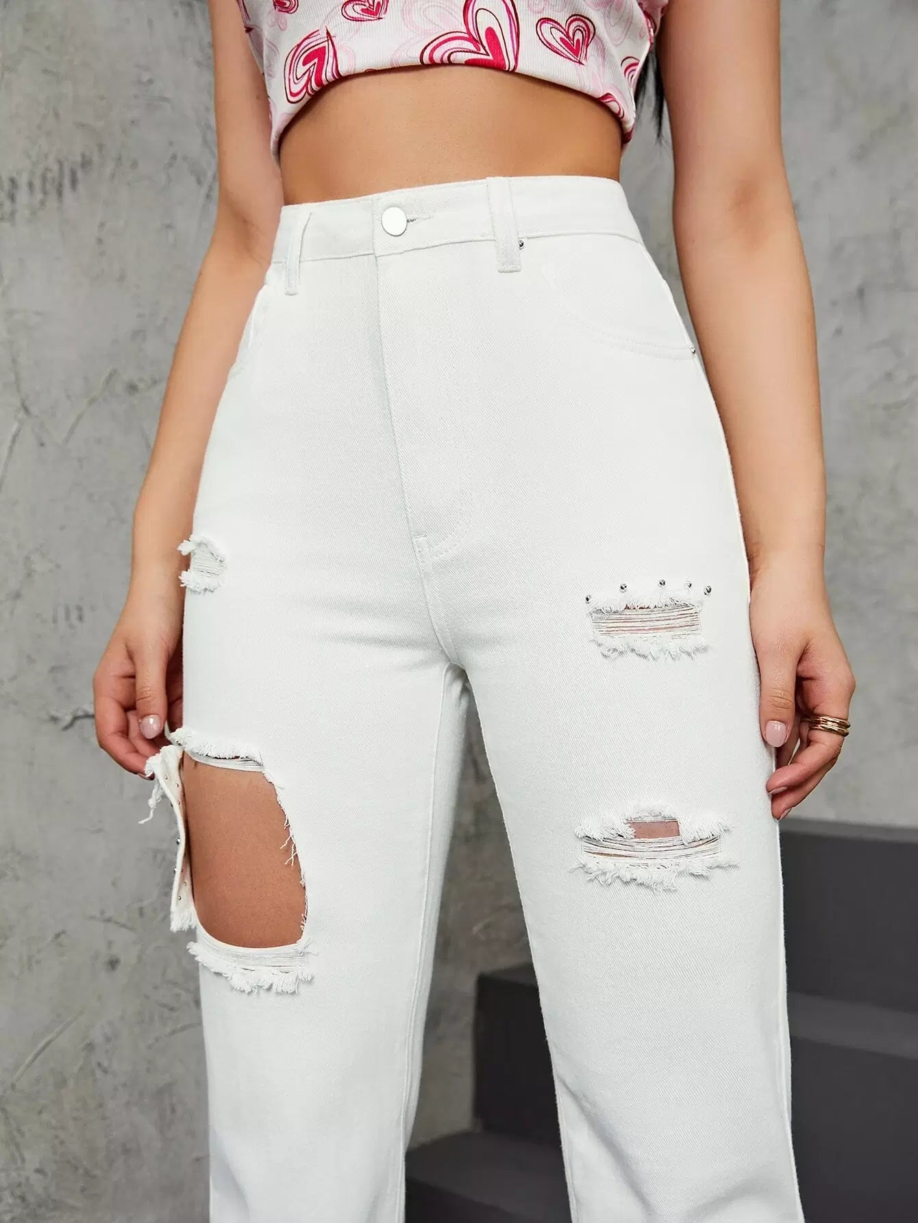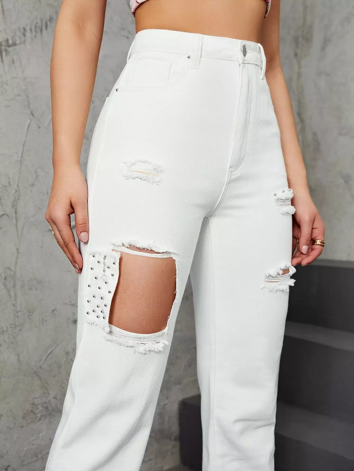 Studded Decor Ripped High Waisted Straight Leg Pants