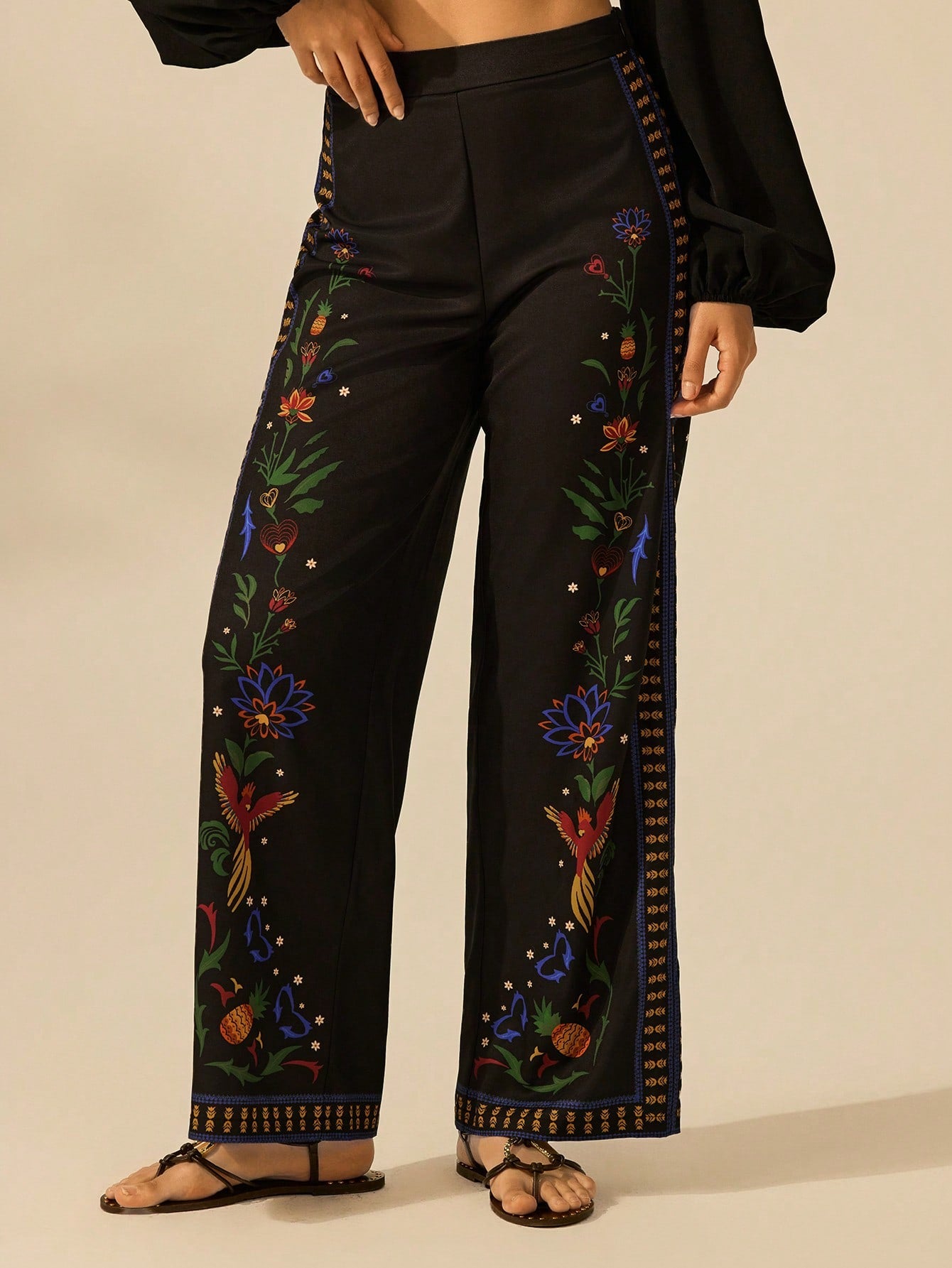 CAJUNI Women's Boho Tropical Flower & Parrot Print Casual Loose Wide Leg Palazzo Pants, For Summer Beach