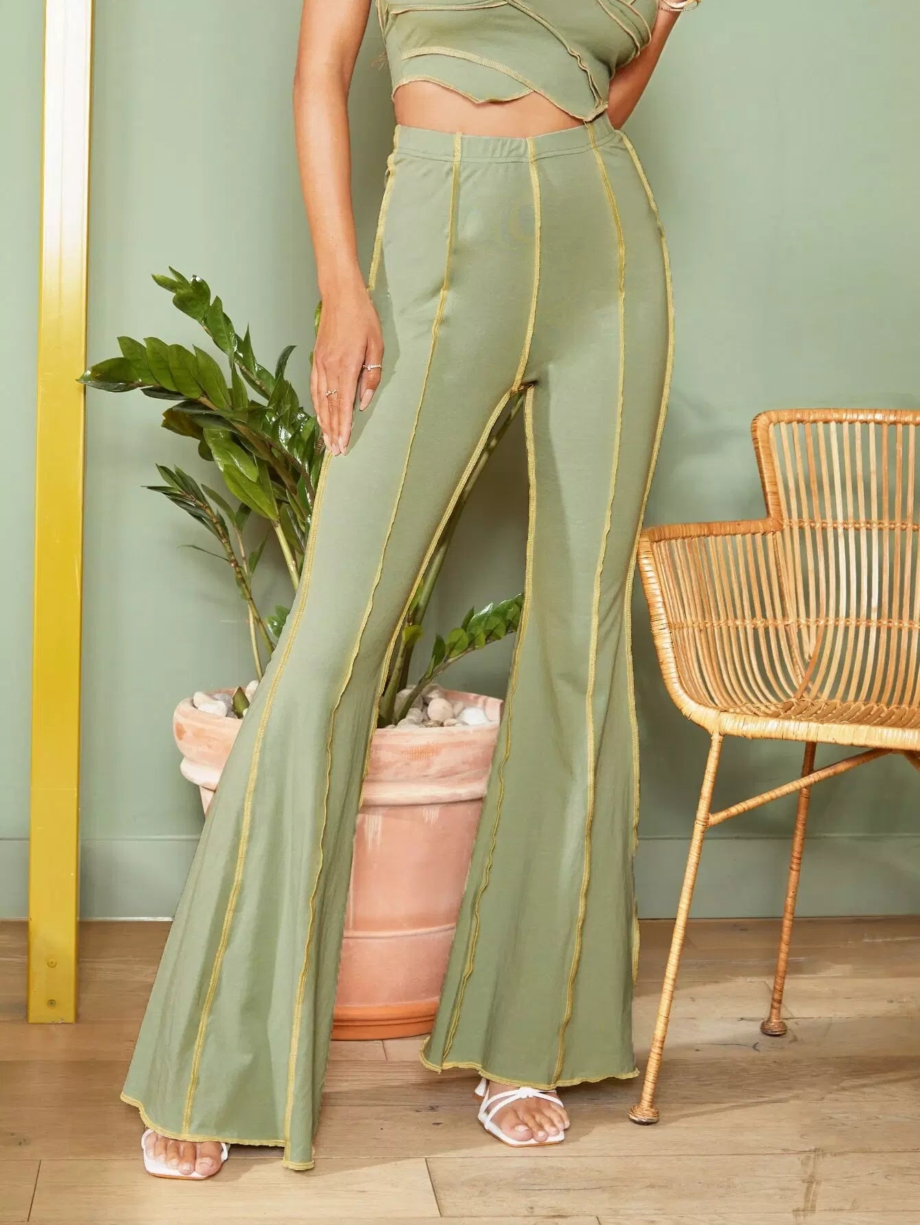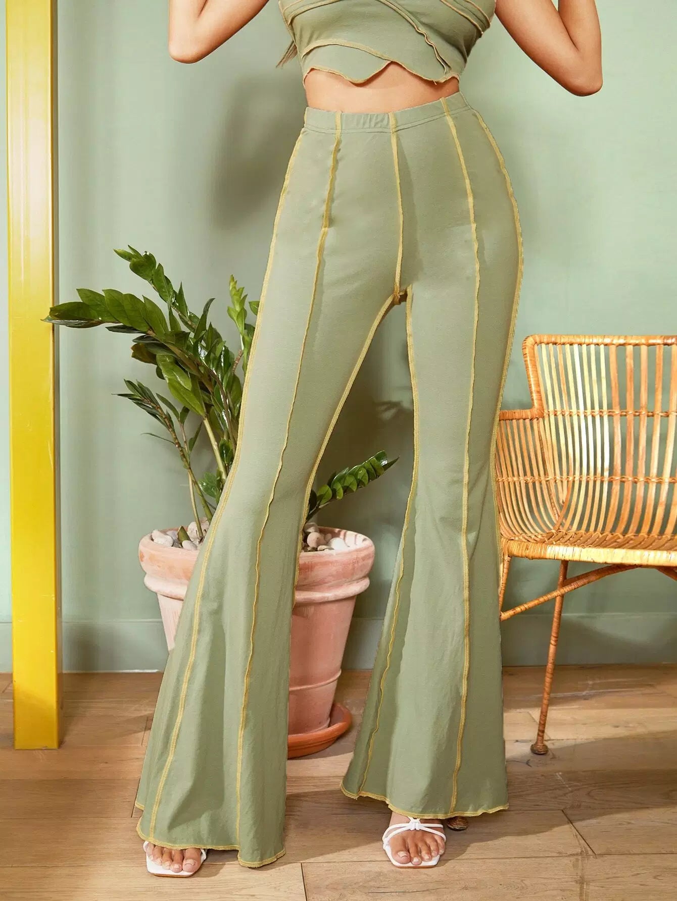 Elastic Waist Stitch Trim Flare Leg Pants