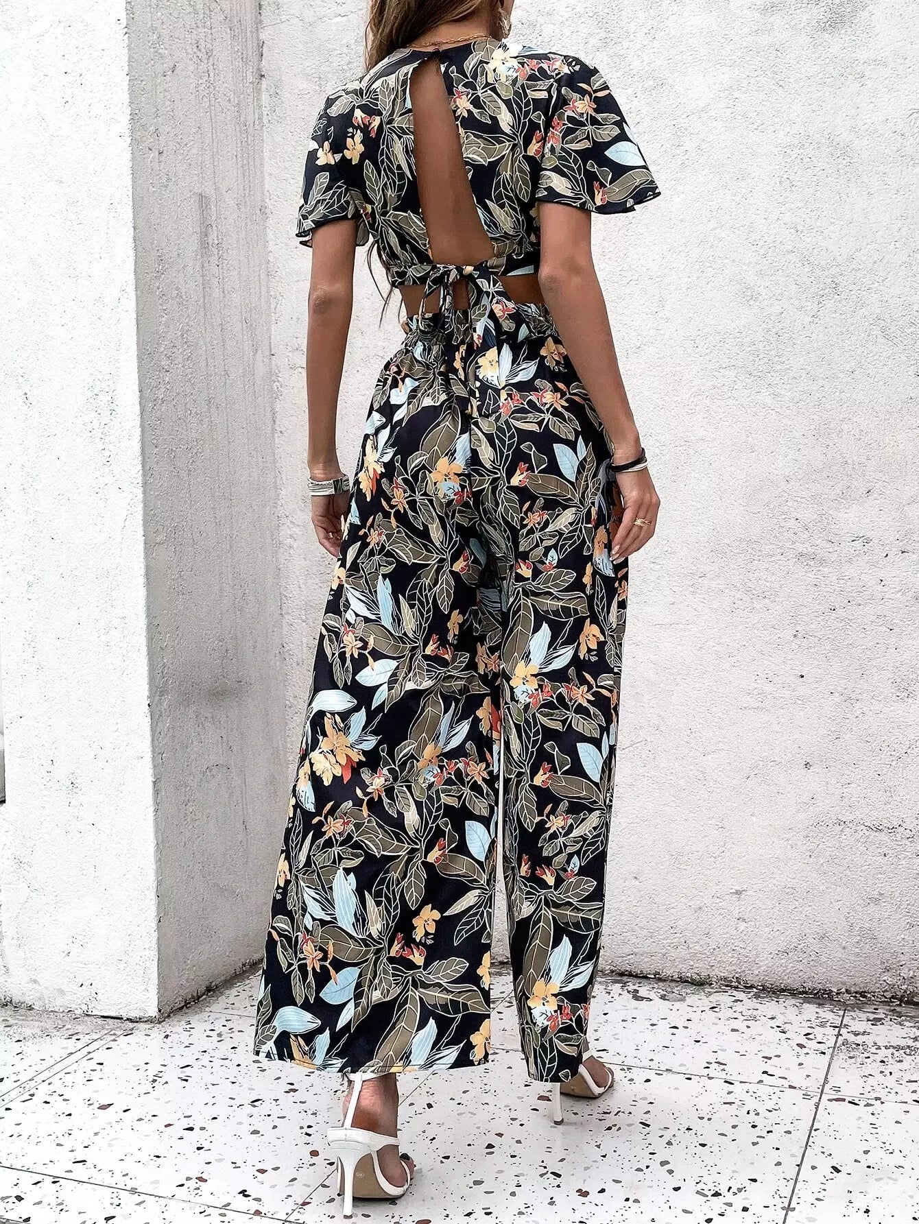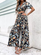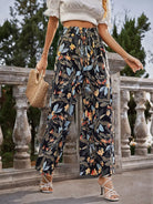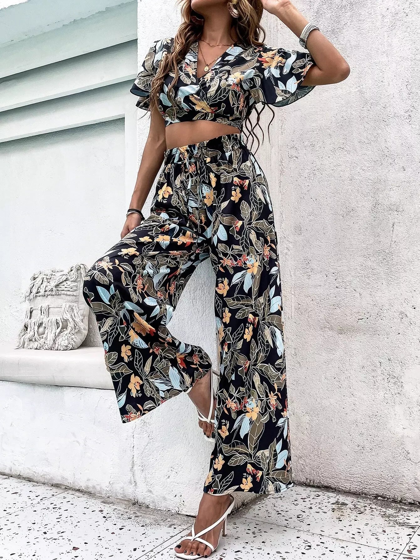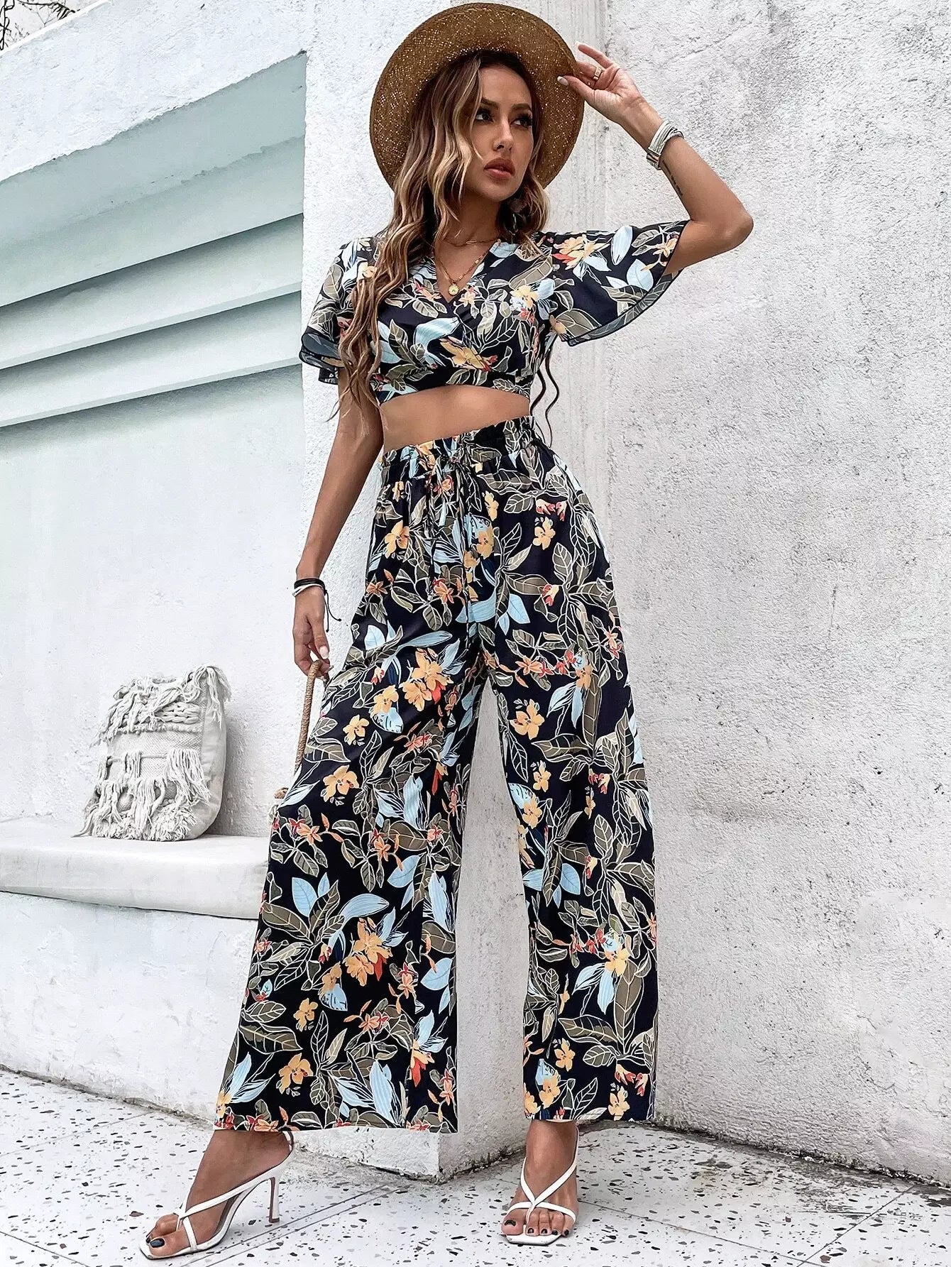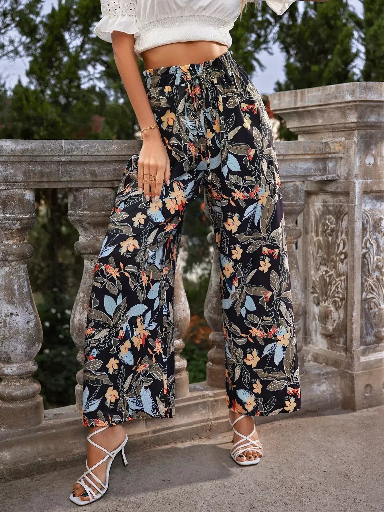 Floral Knot Front Paperbag Waist Wide Leg Pants