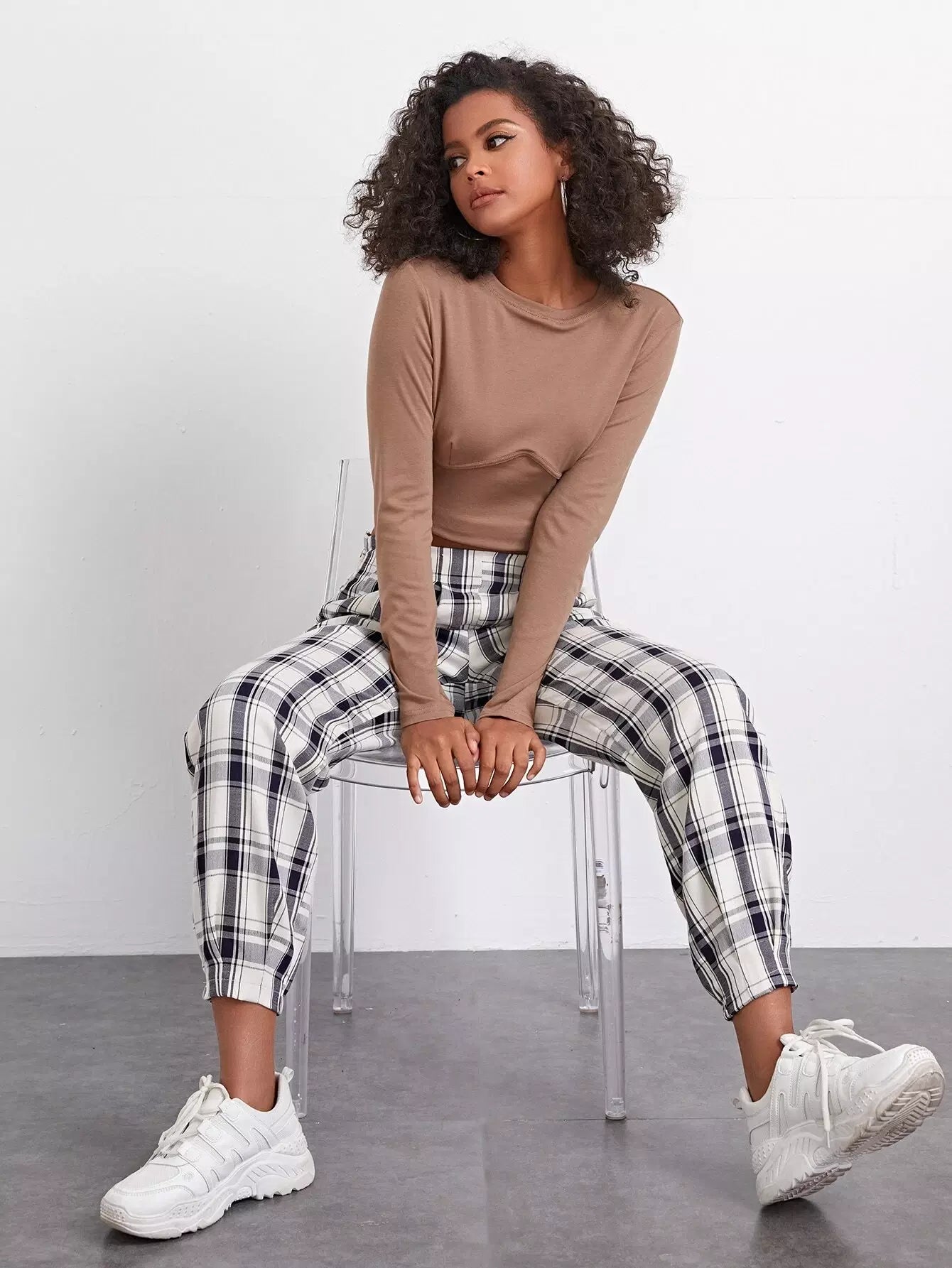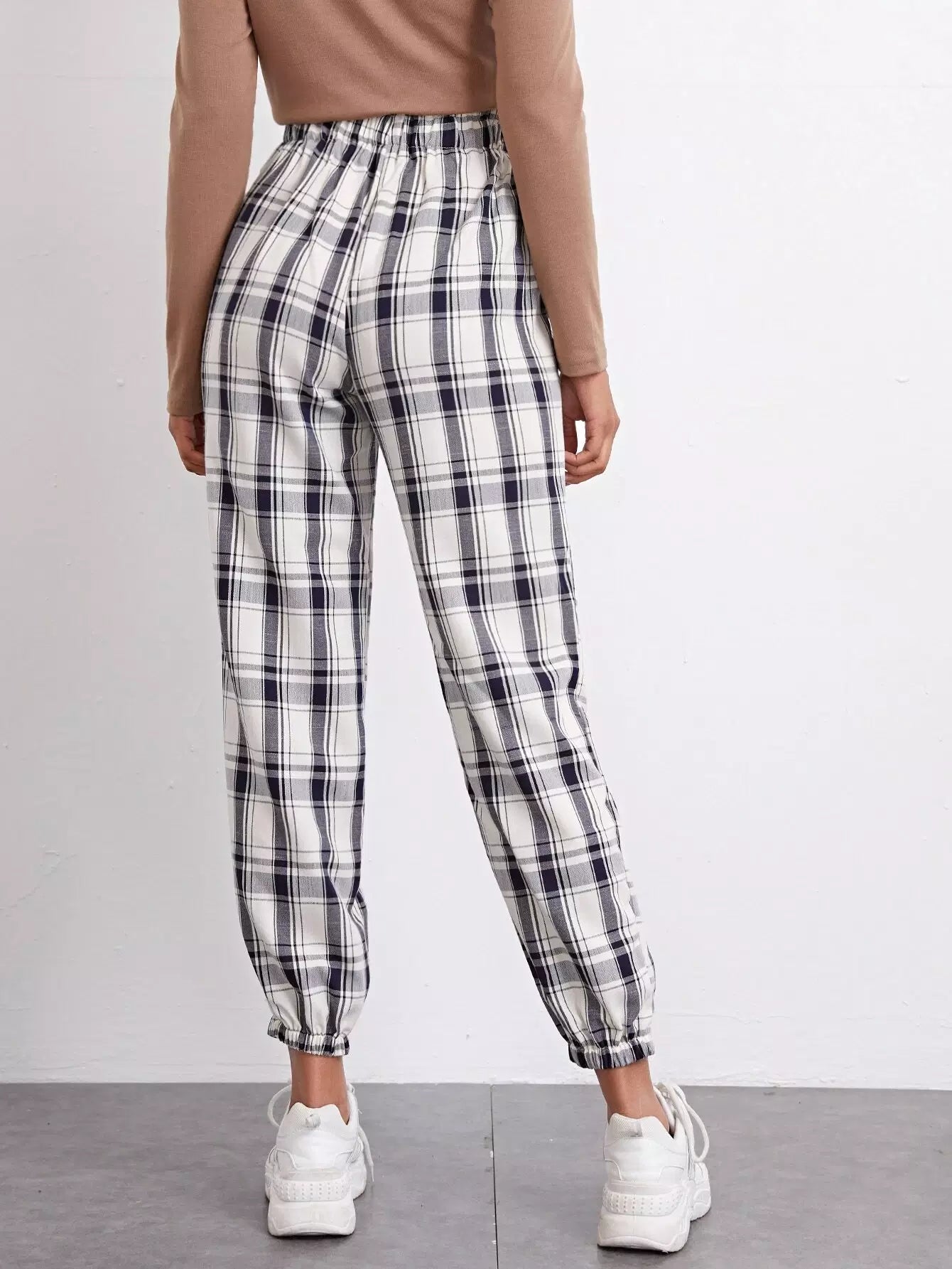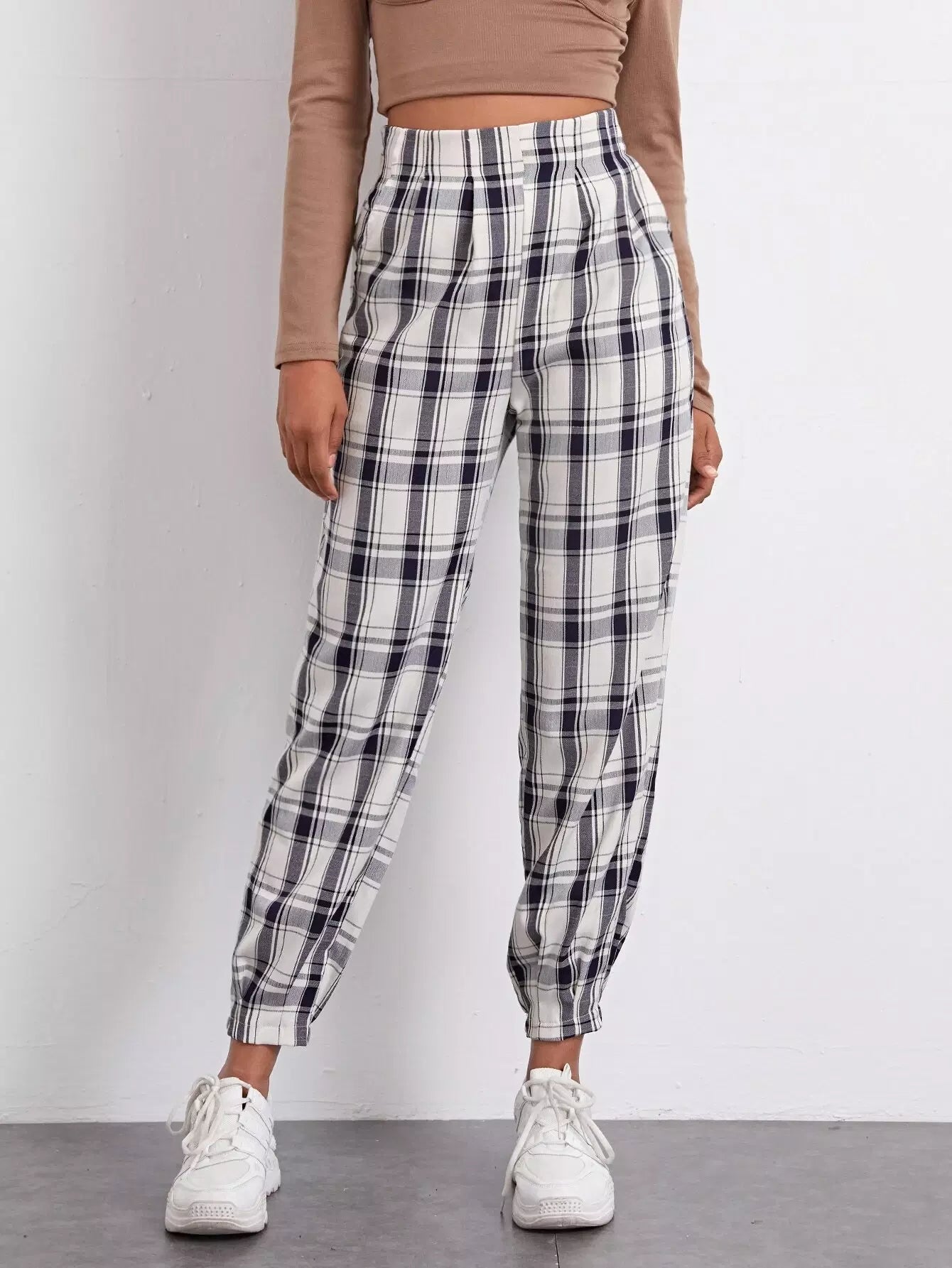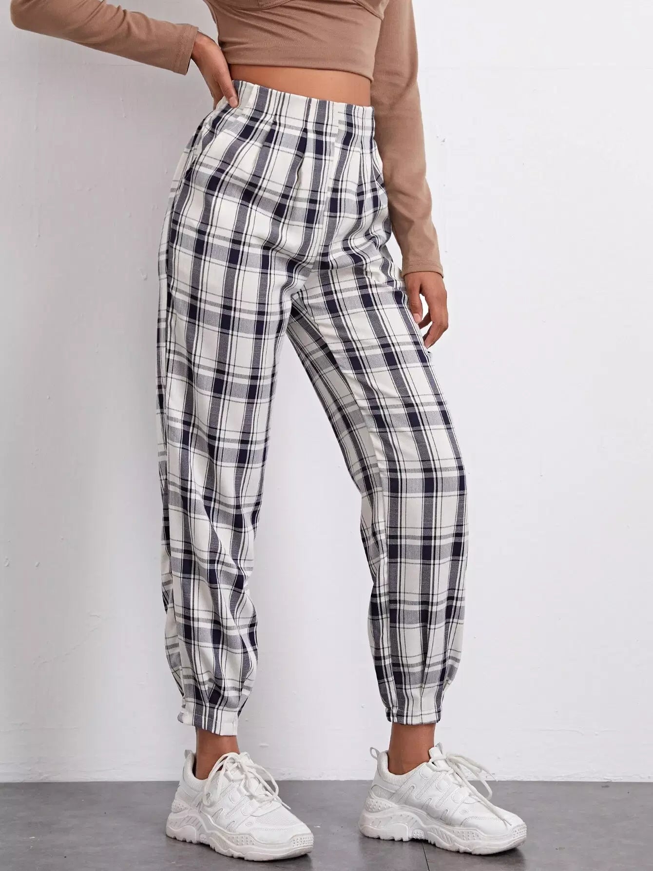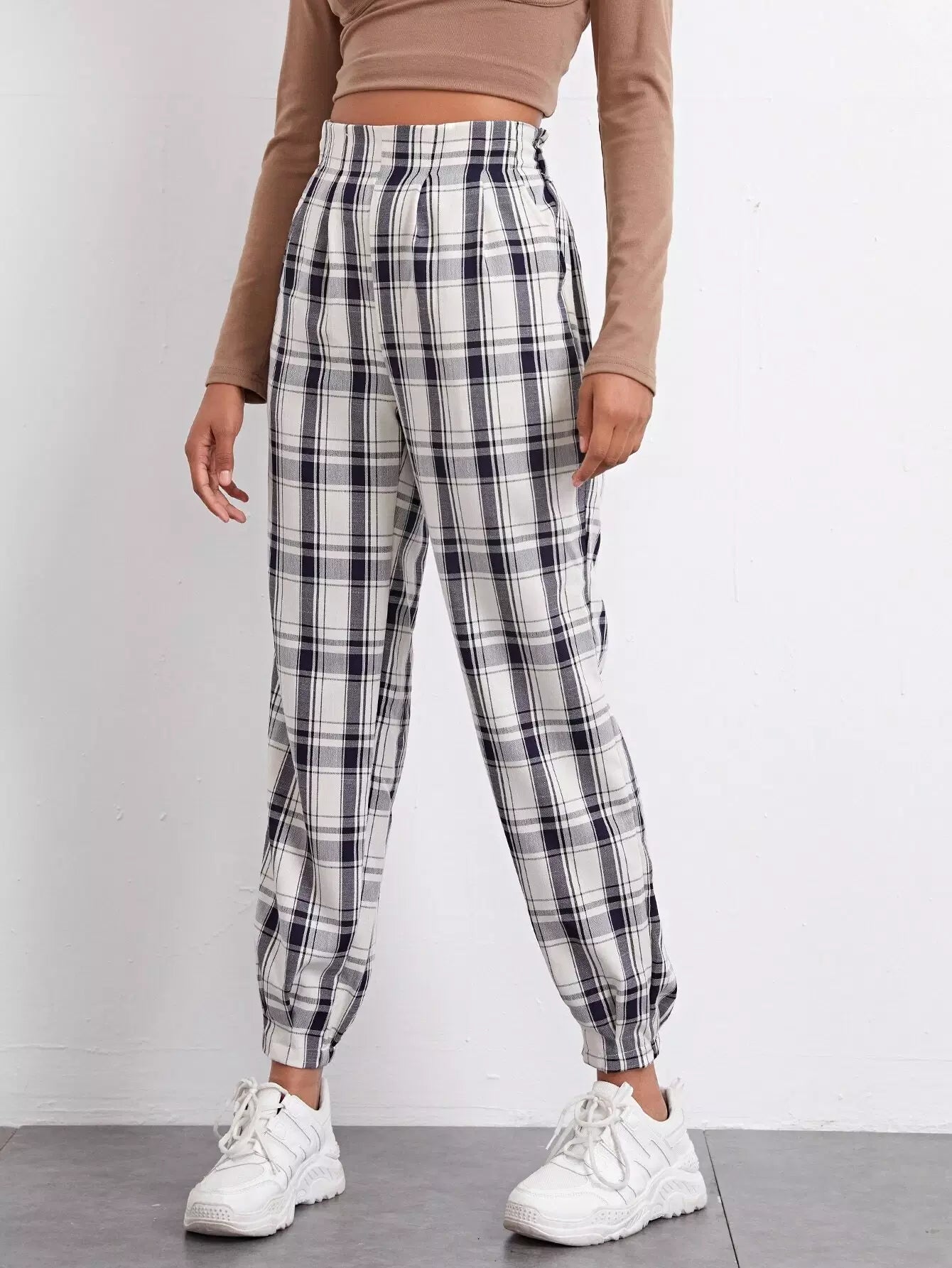 High Waist Fold Pleat Tartan Pants