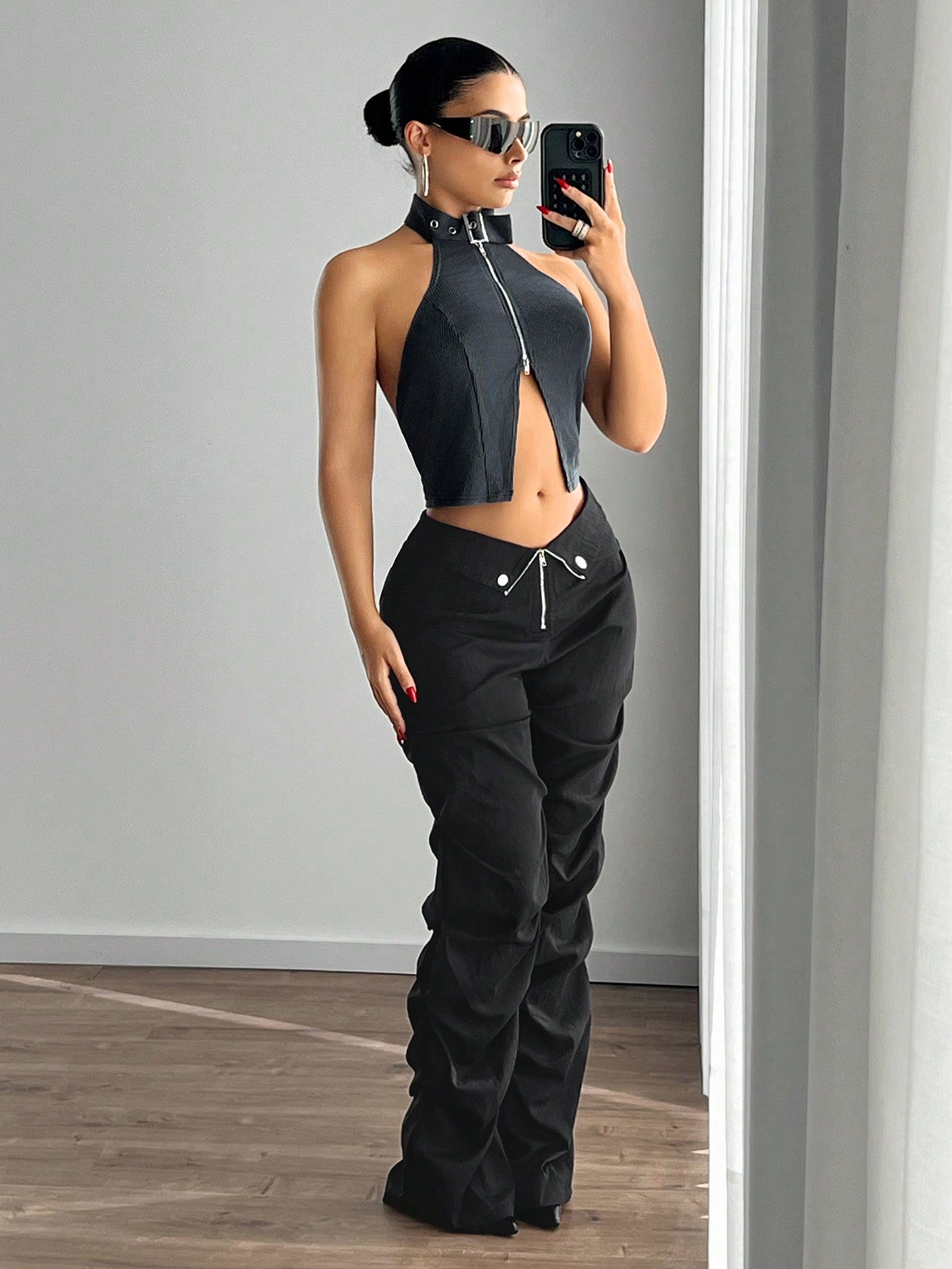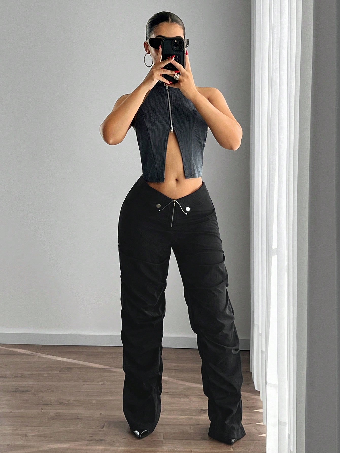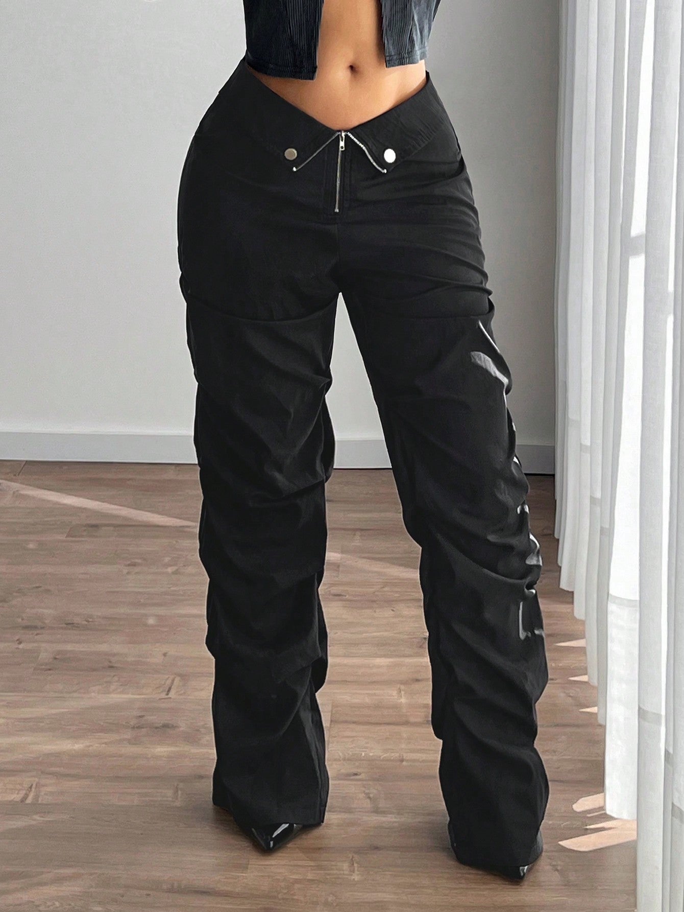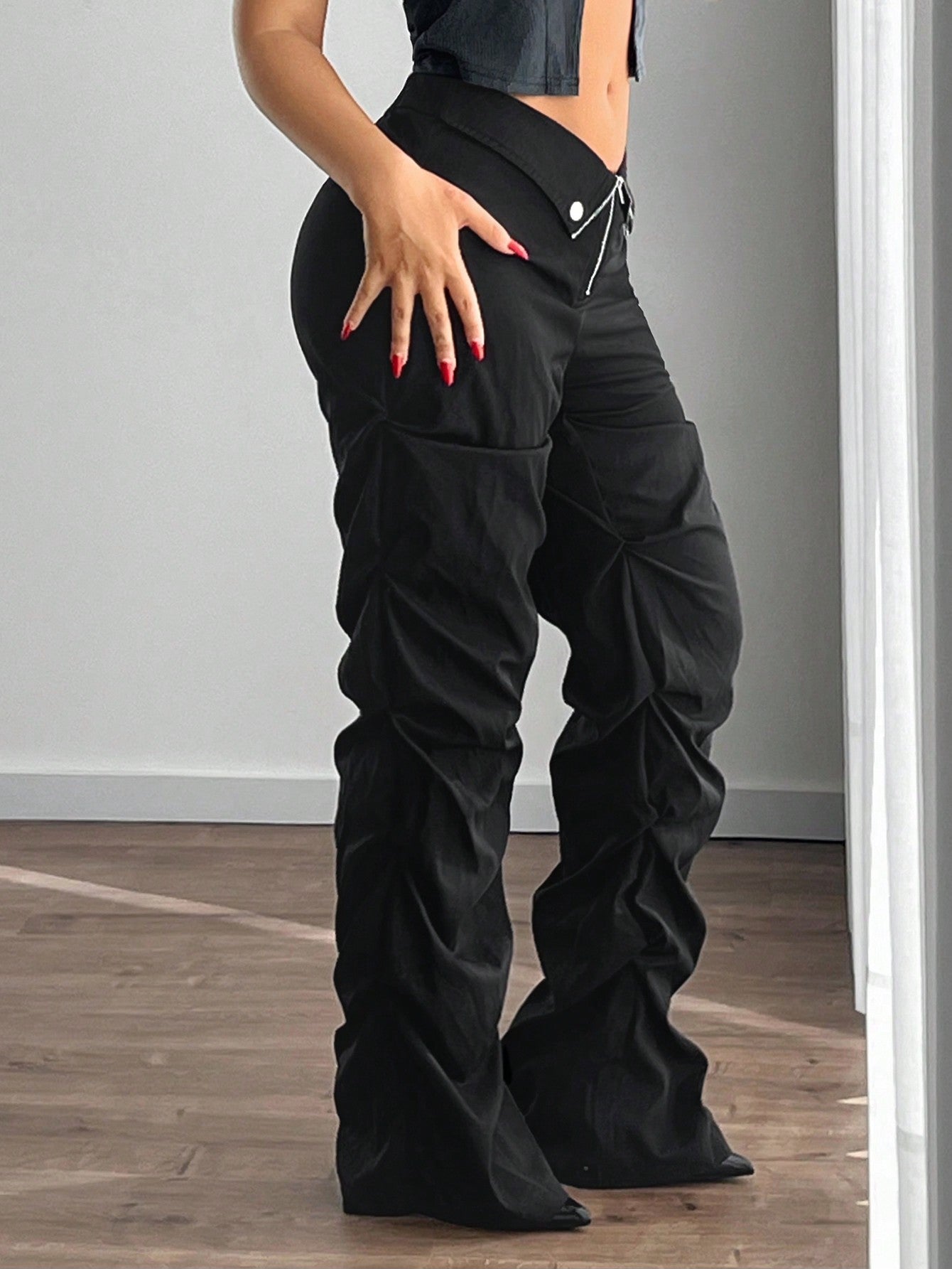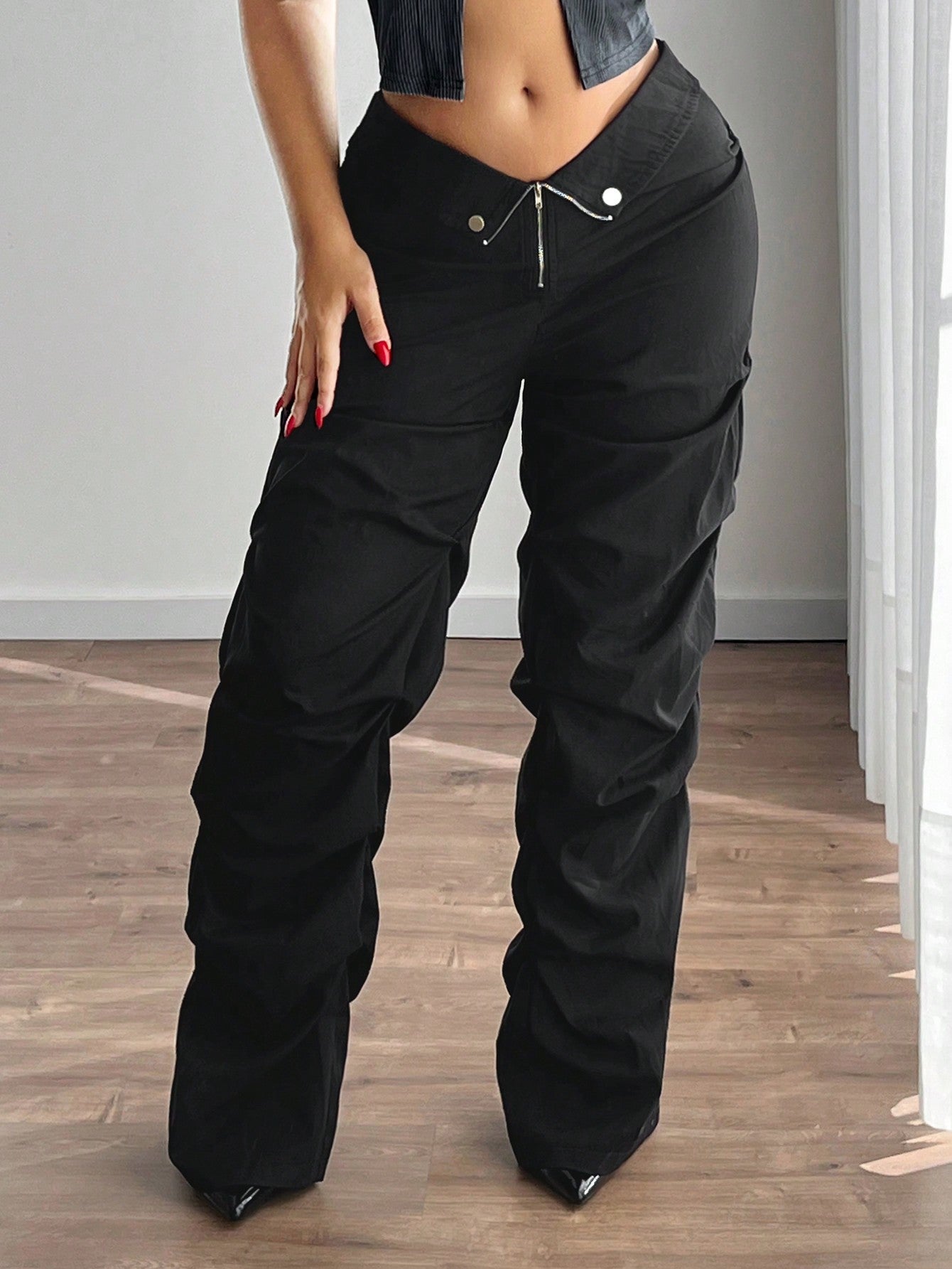 ICON Women's Ultra Low Rise Waist V-Neck Pleated Loose Pants