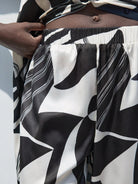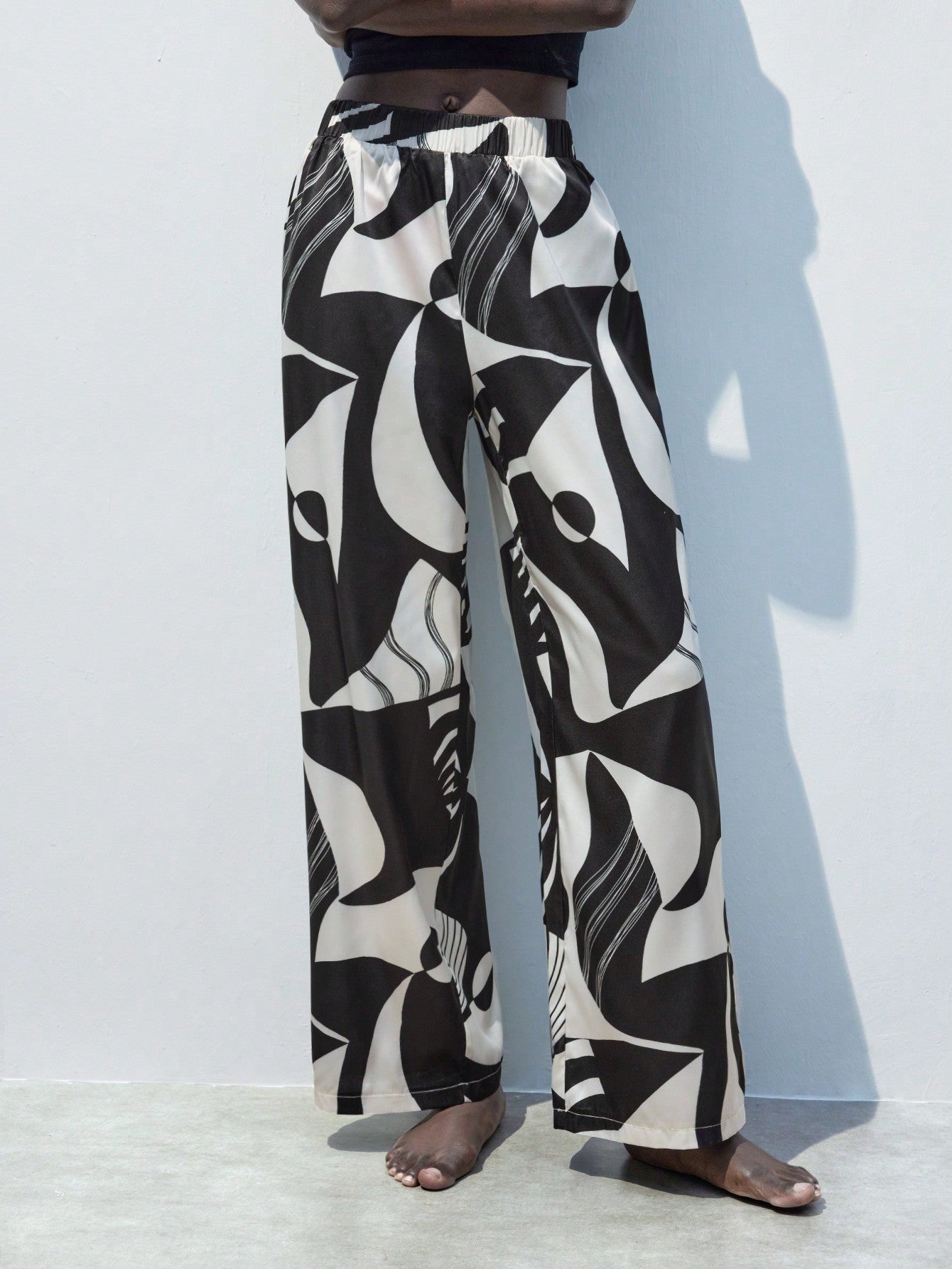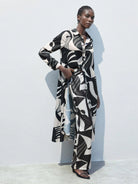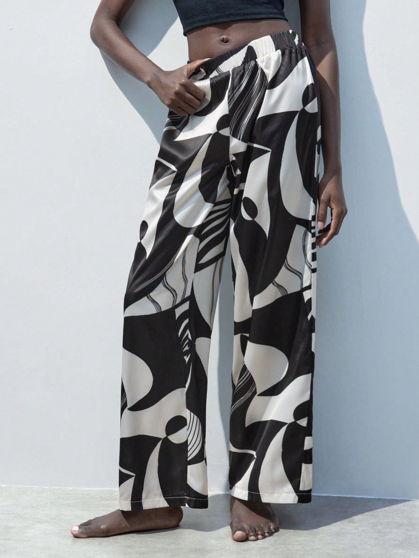 Maija Urban Chic Elegant Vacation & Casual Black & White Artistic Print Pants For Women, Autumn Winter