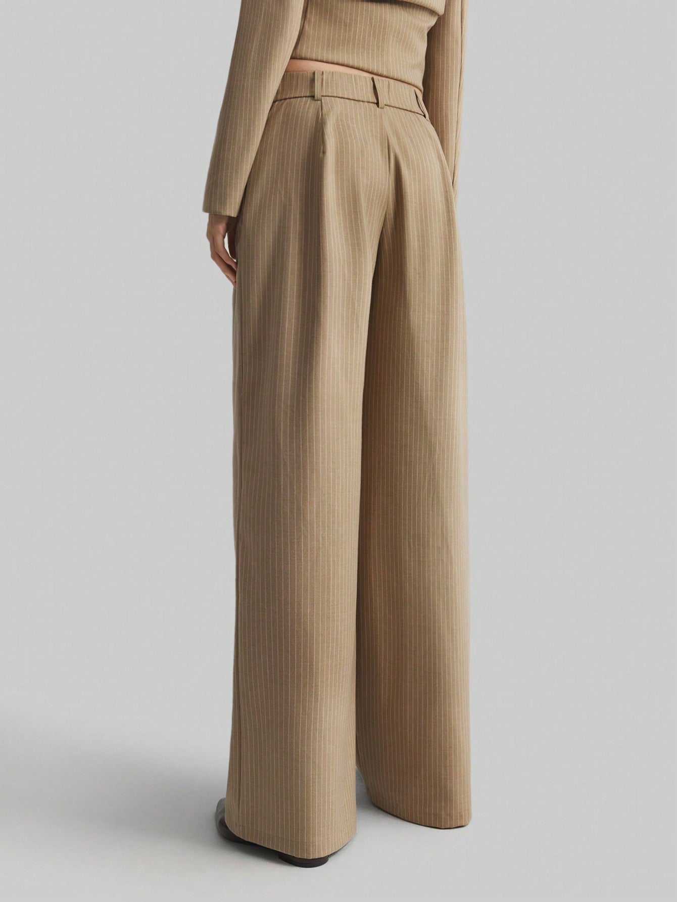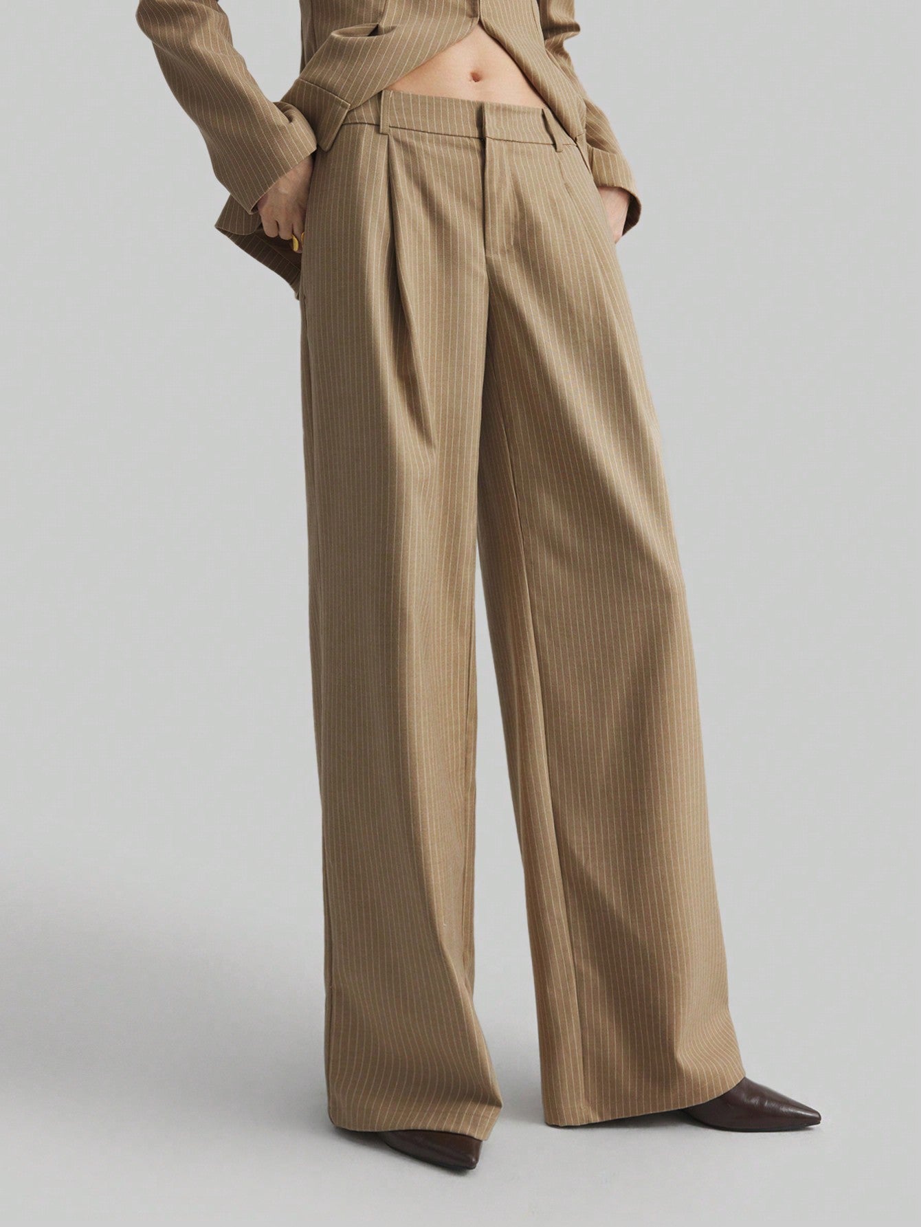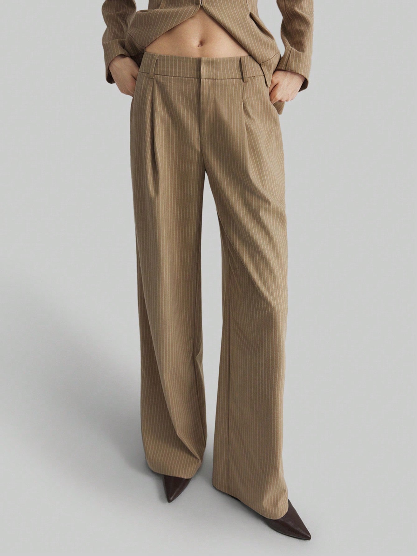 Ontre 2025 Women's Khaki Woven Striped Loose Straight Leg Pants, Suitable For Daily Commute