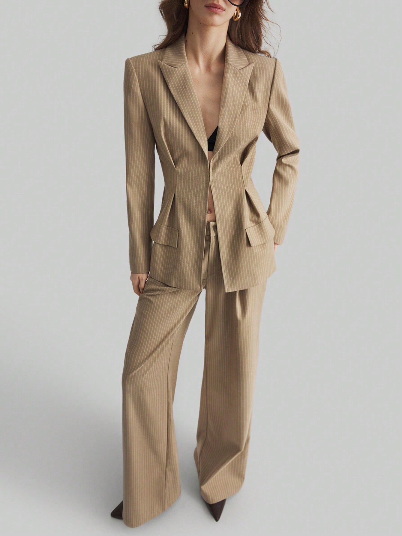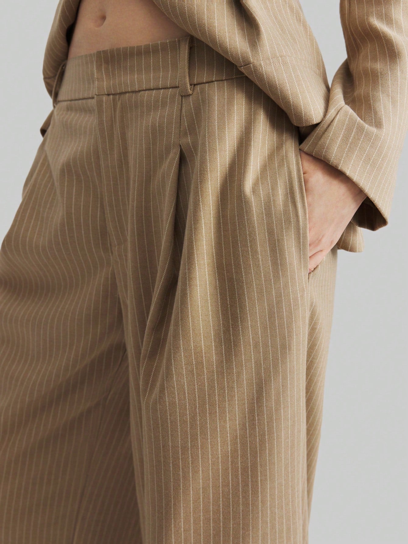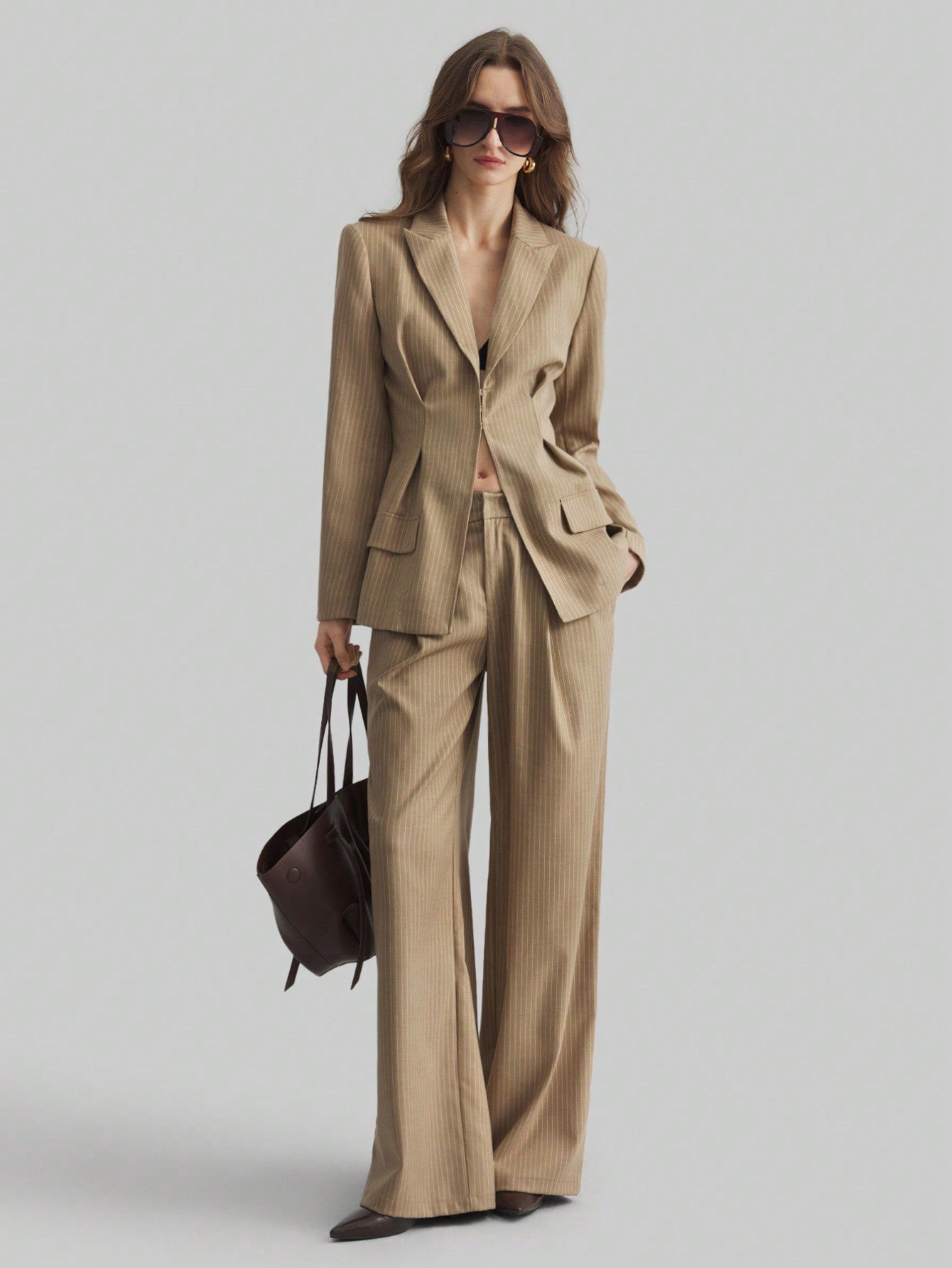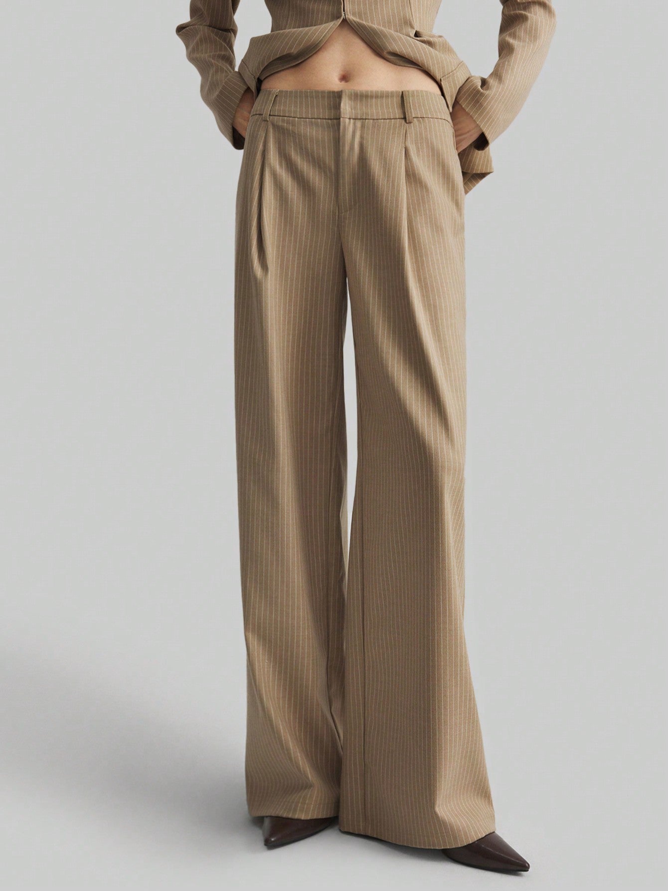Ontre 2025 Women's Khaki Woven Striped Loose Straight Leg Pants, Suitable For Daily Commute