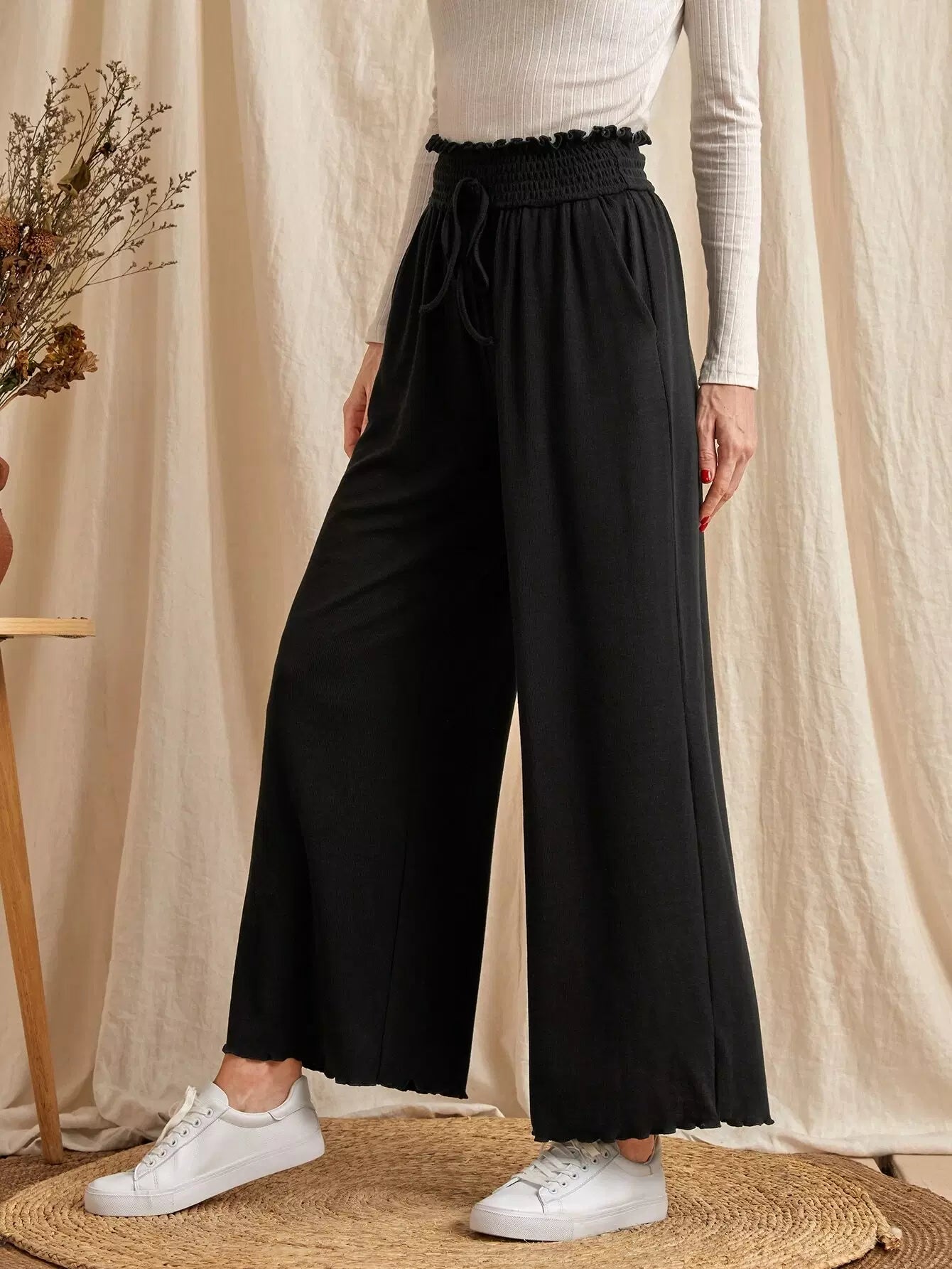 Shirred Waist Lettuce Trim Tie Front Wide Leg Pants