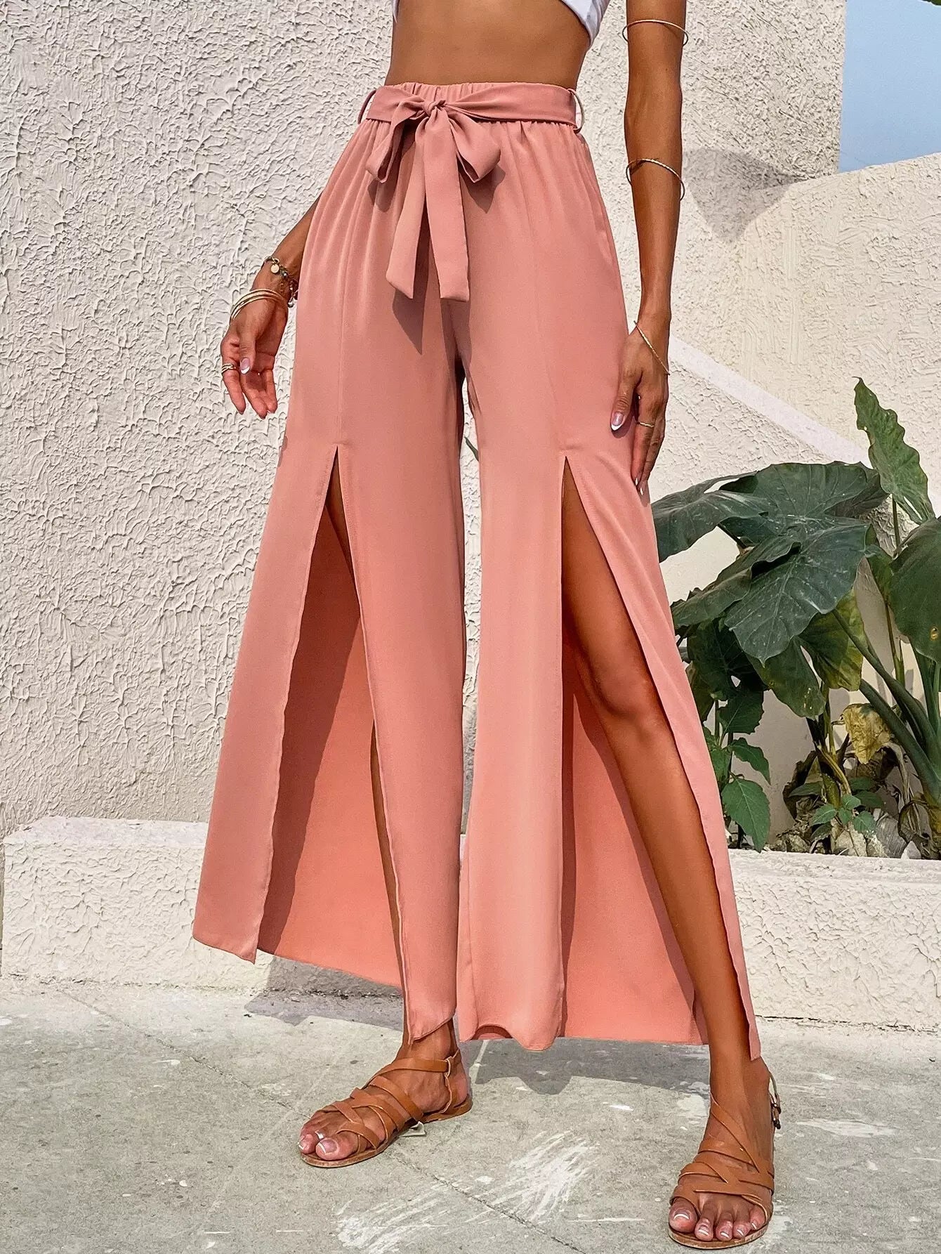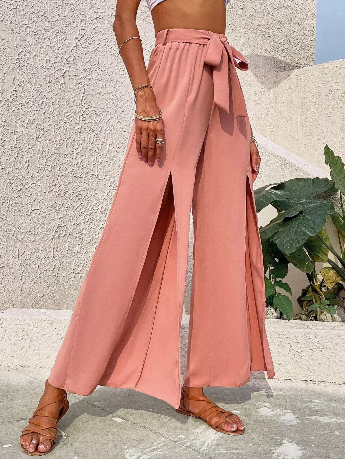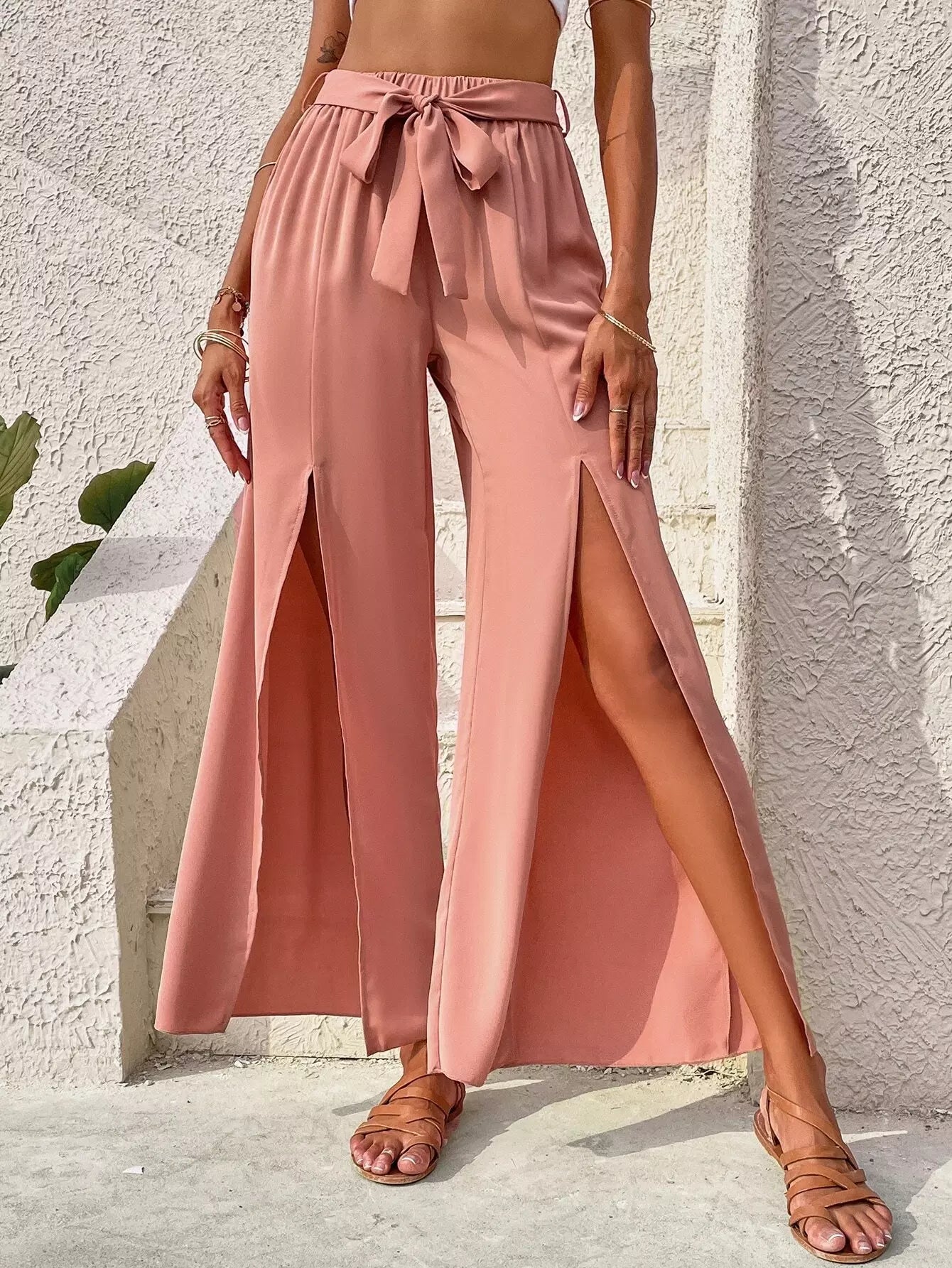 Split Thigh Wide Leg Pants Without Belt