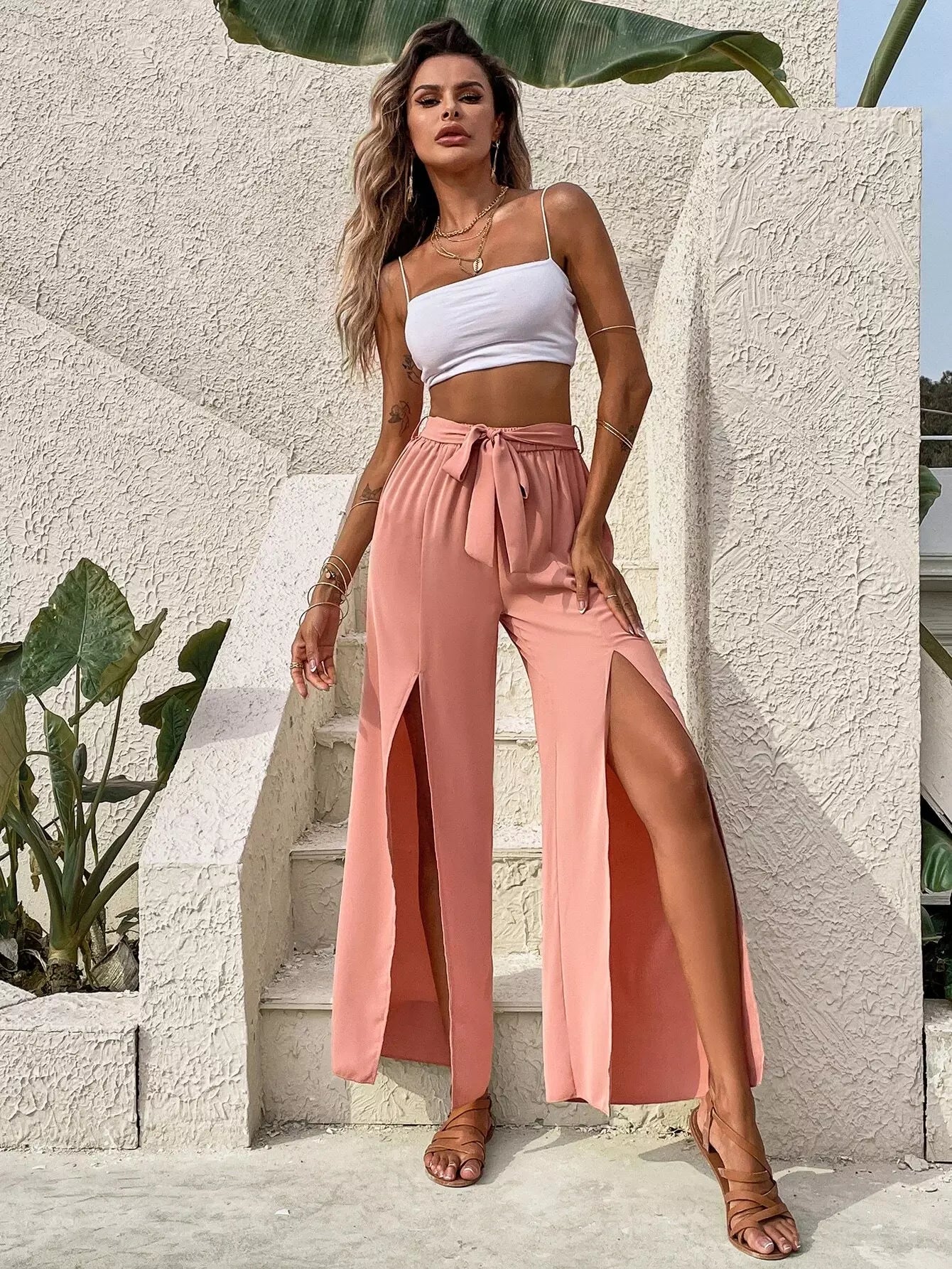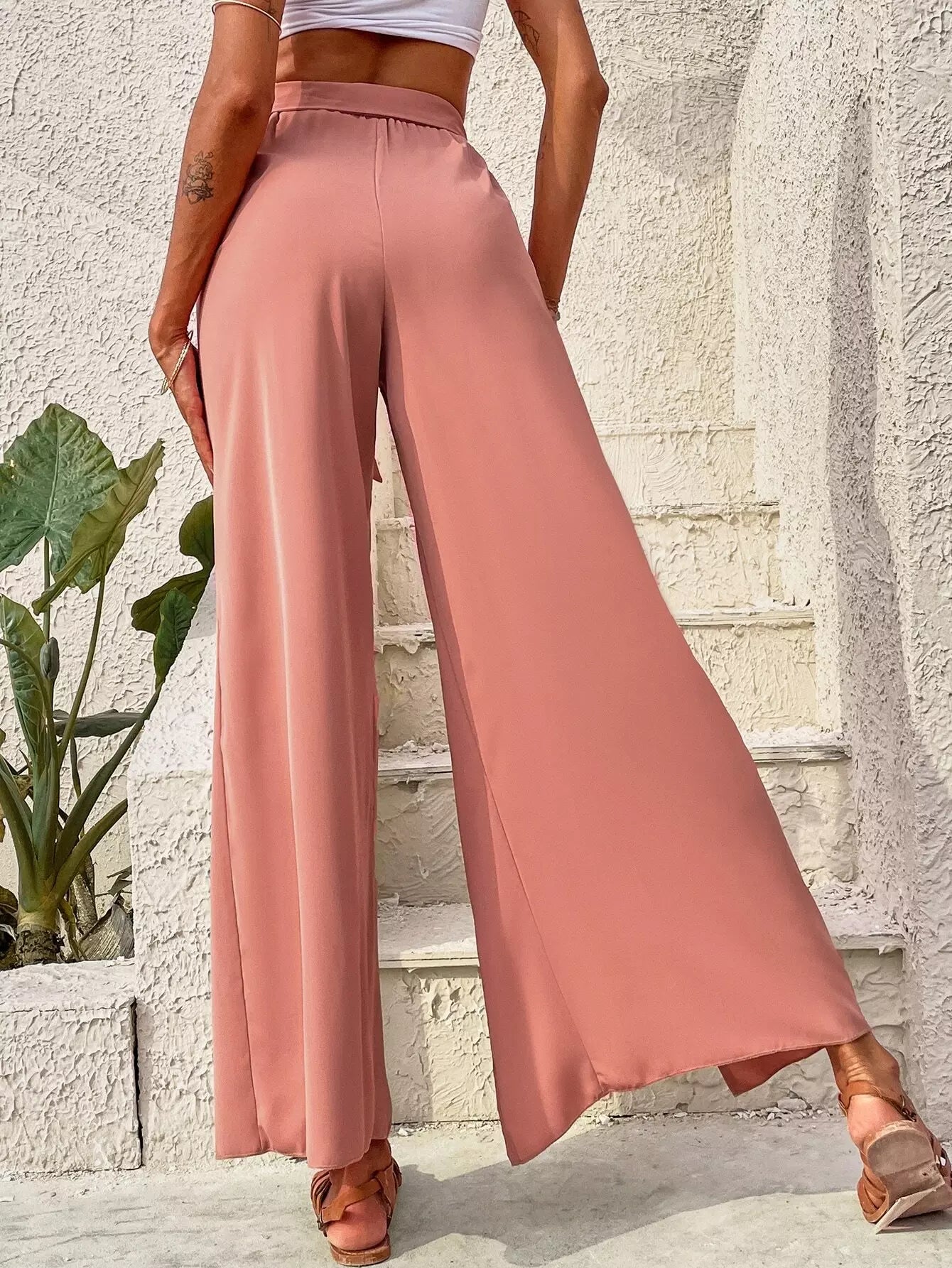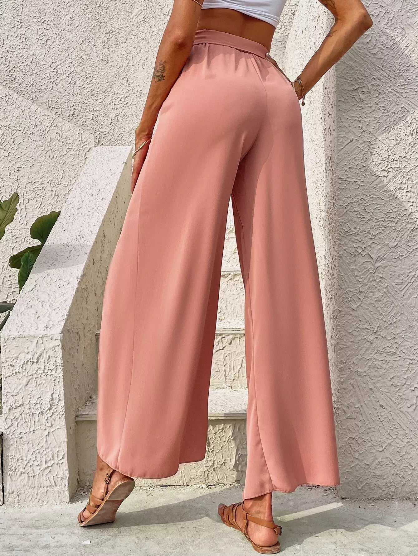 Split Thigh Wide Leg Pants Without Belt