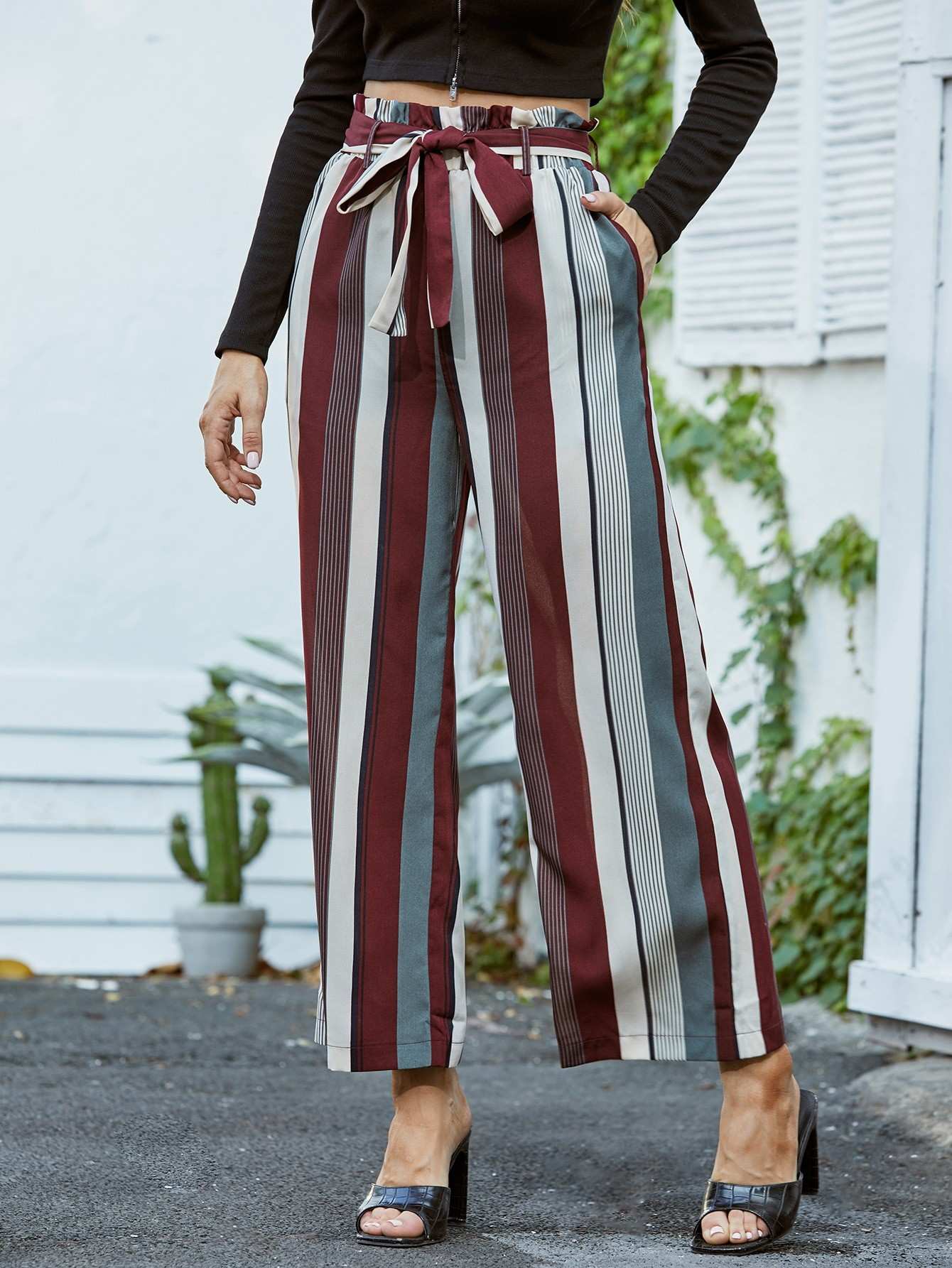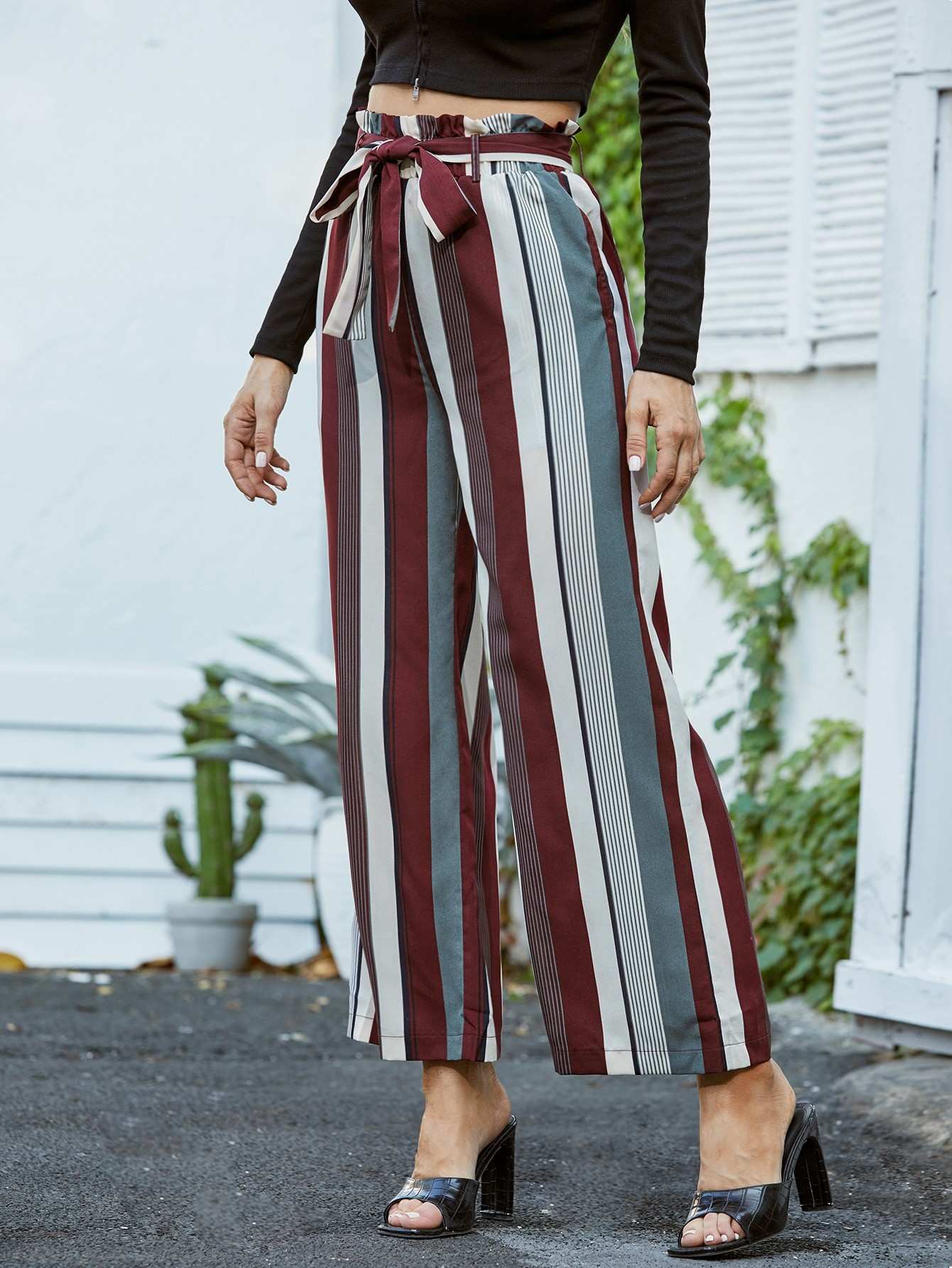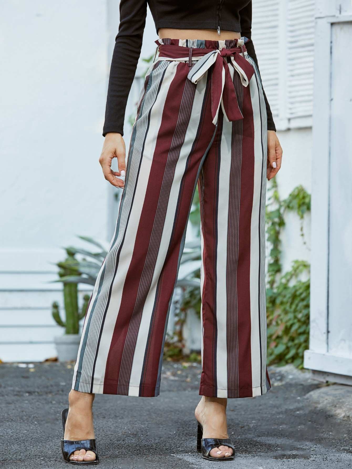 Striped Print Paper Bag Waist Pants Without Belt
