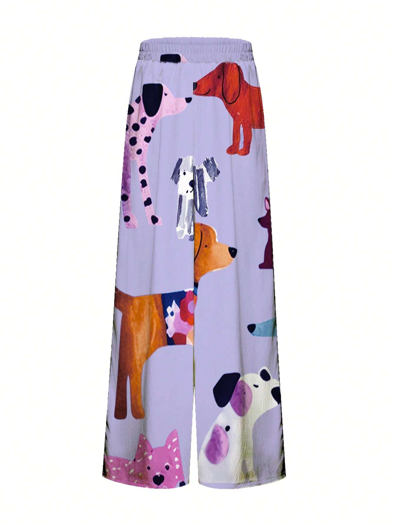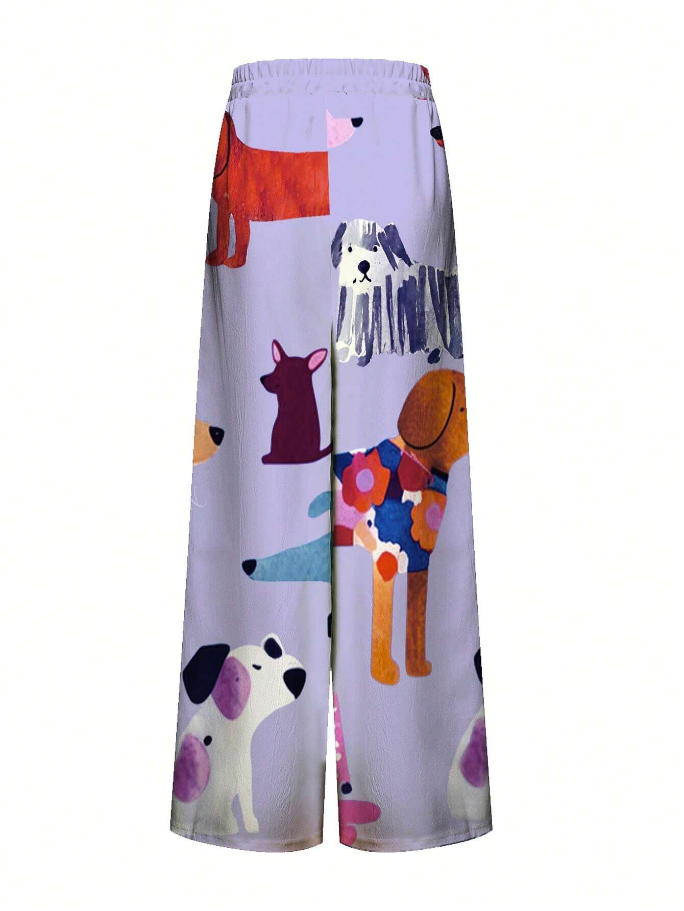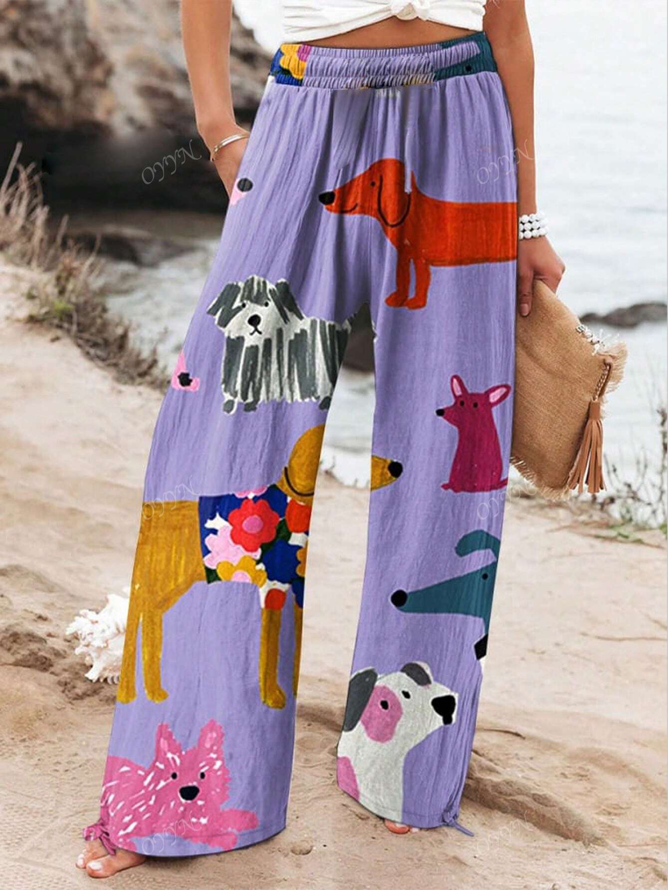 Women's Flowy Pants Summer Collection - Animal Print Boho Trousers With Elastic Waist & Drawstring, Tropical