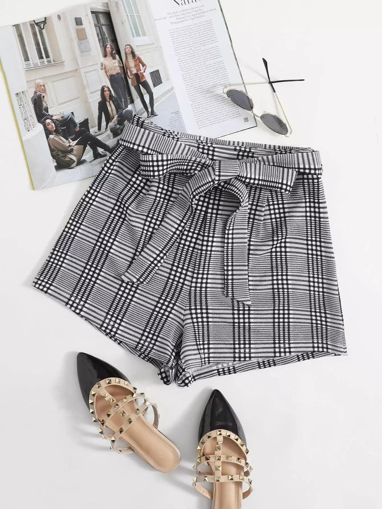 Women - Self Belted Plaid Shorts