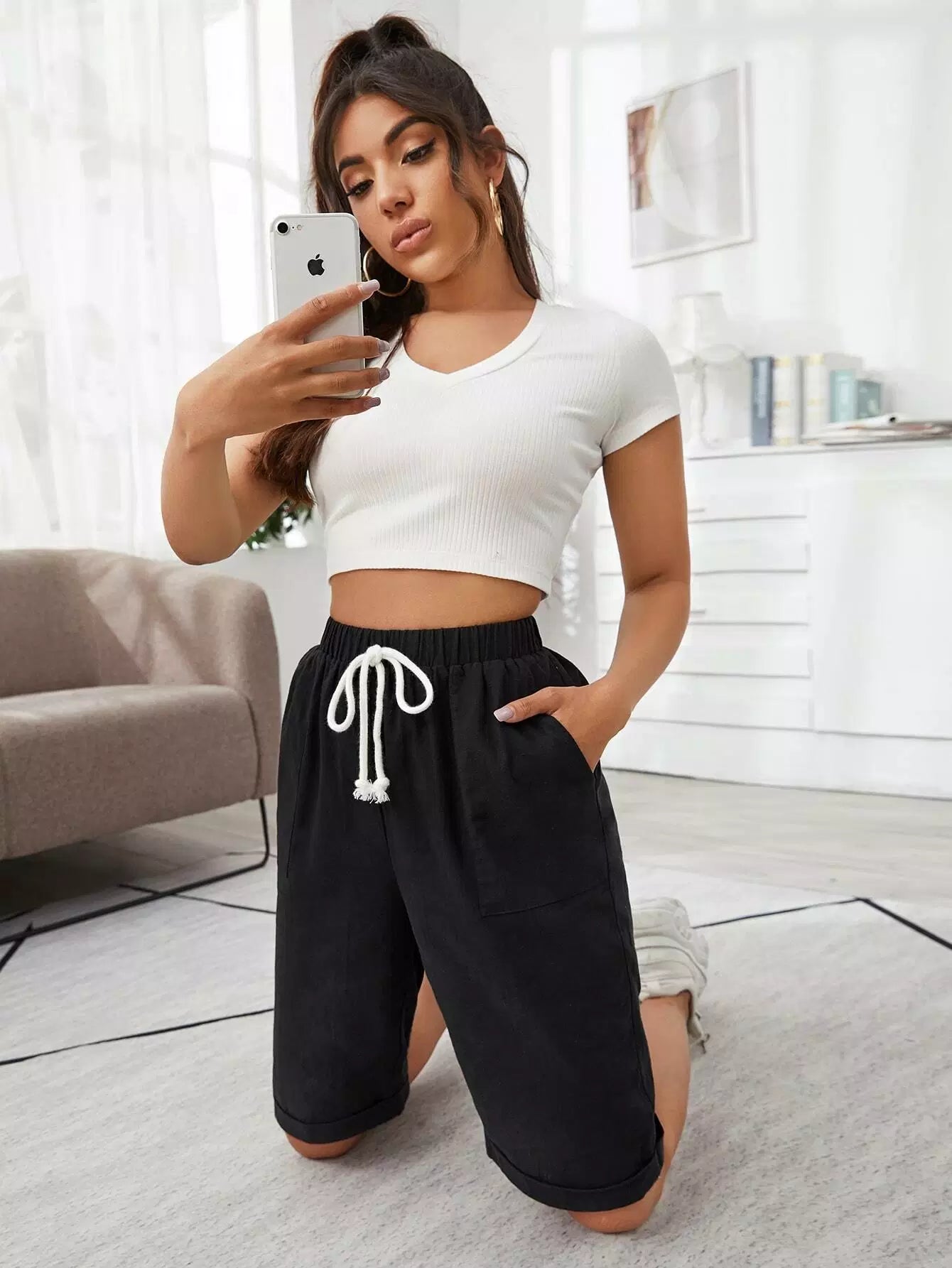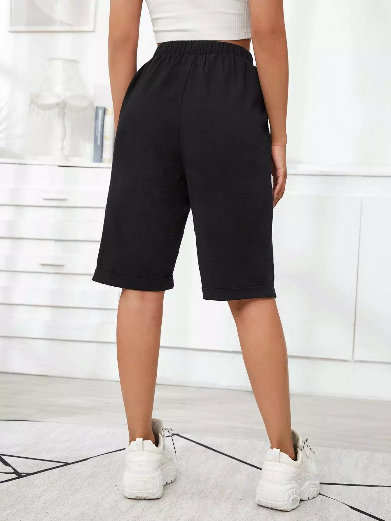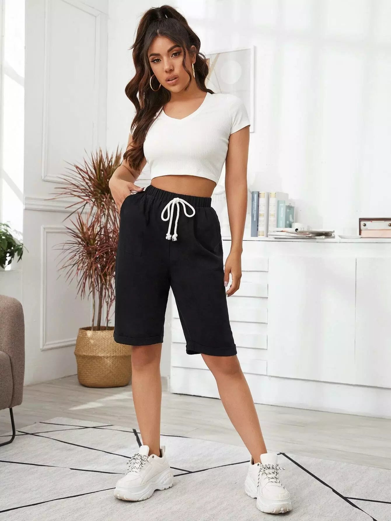Tie Front Slant Pocket Cuffed Bermuda Shorts