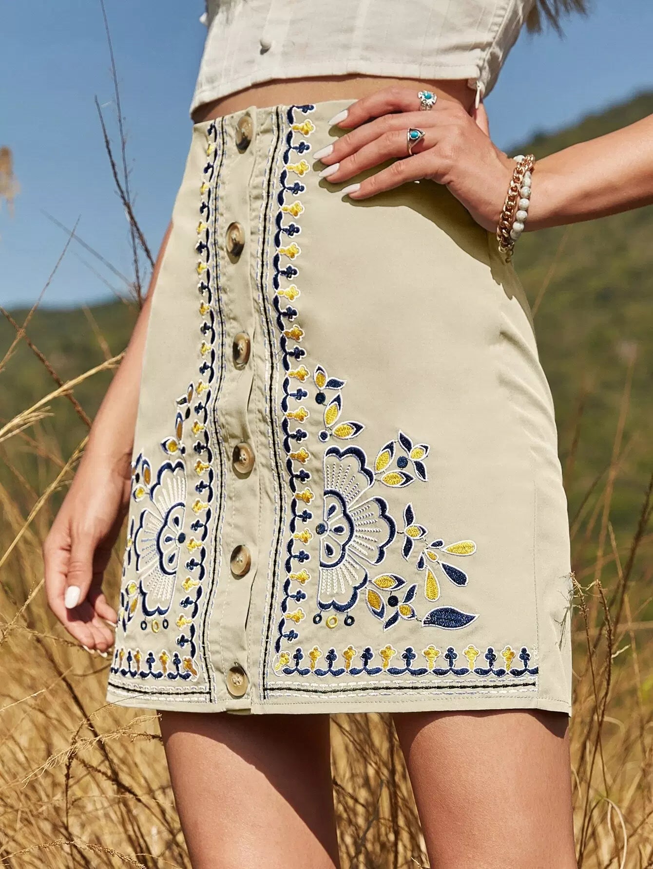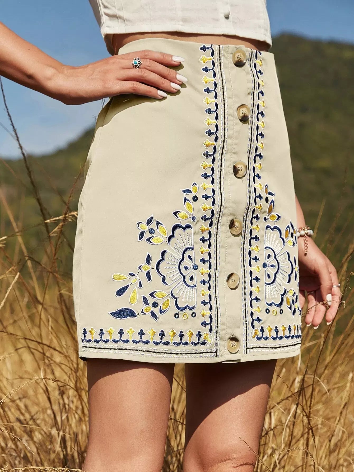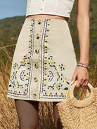 Button Front Floral Embroidery Skirt
