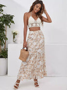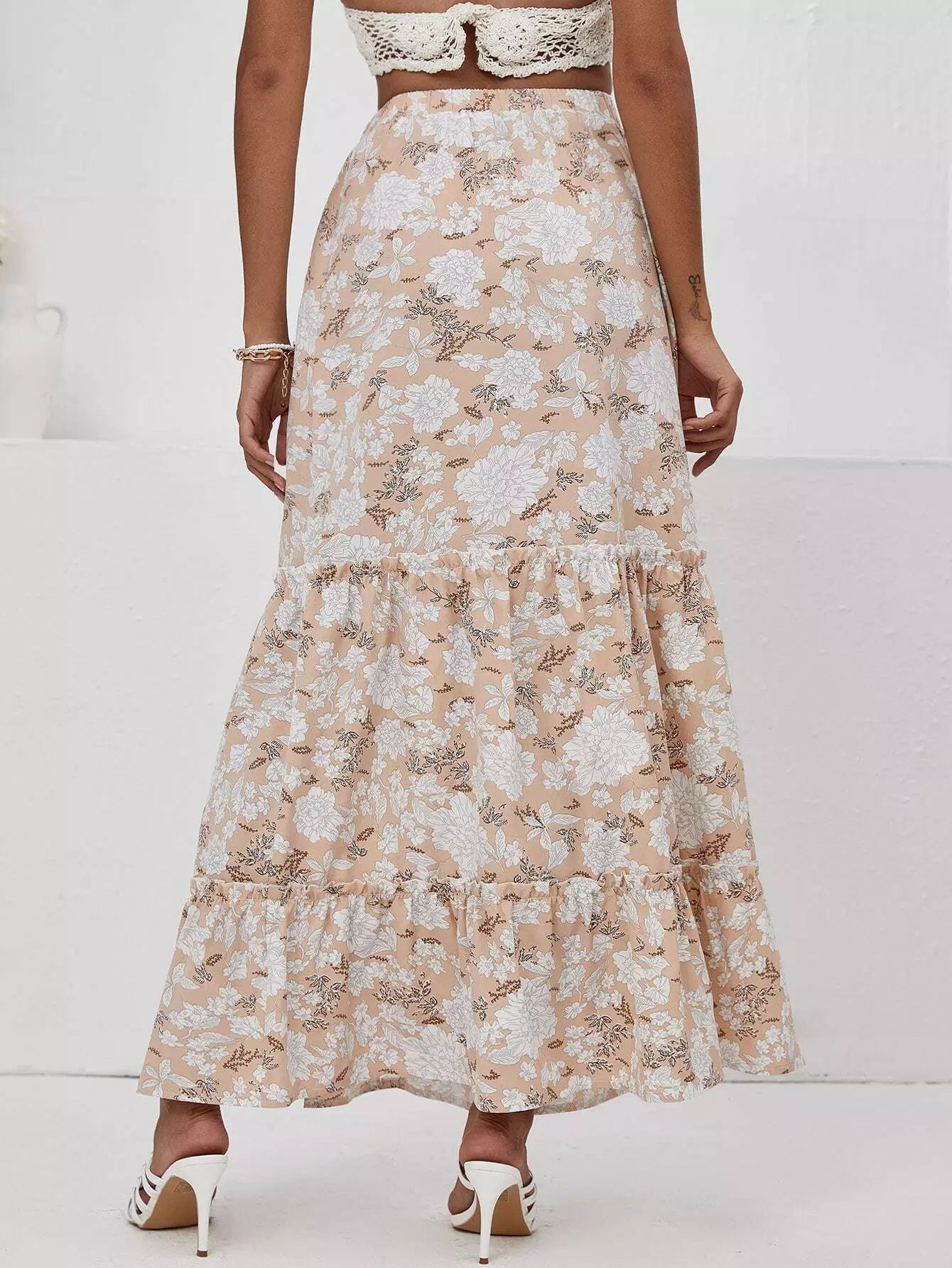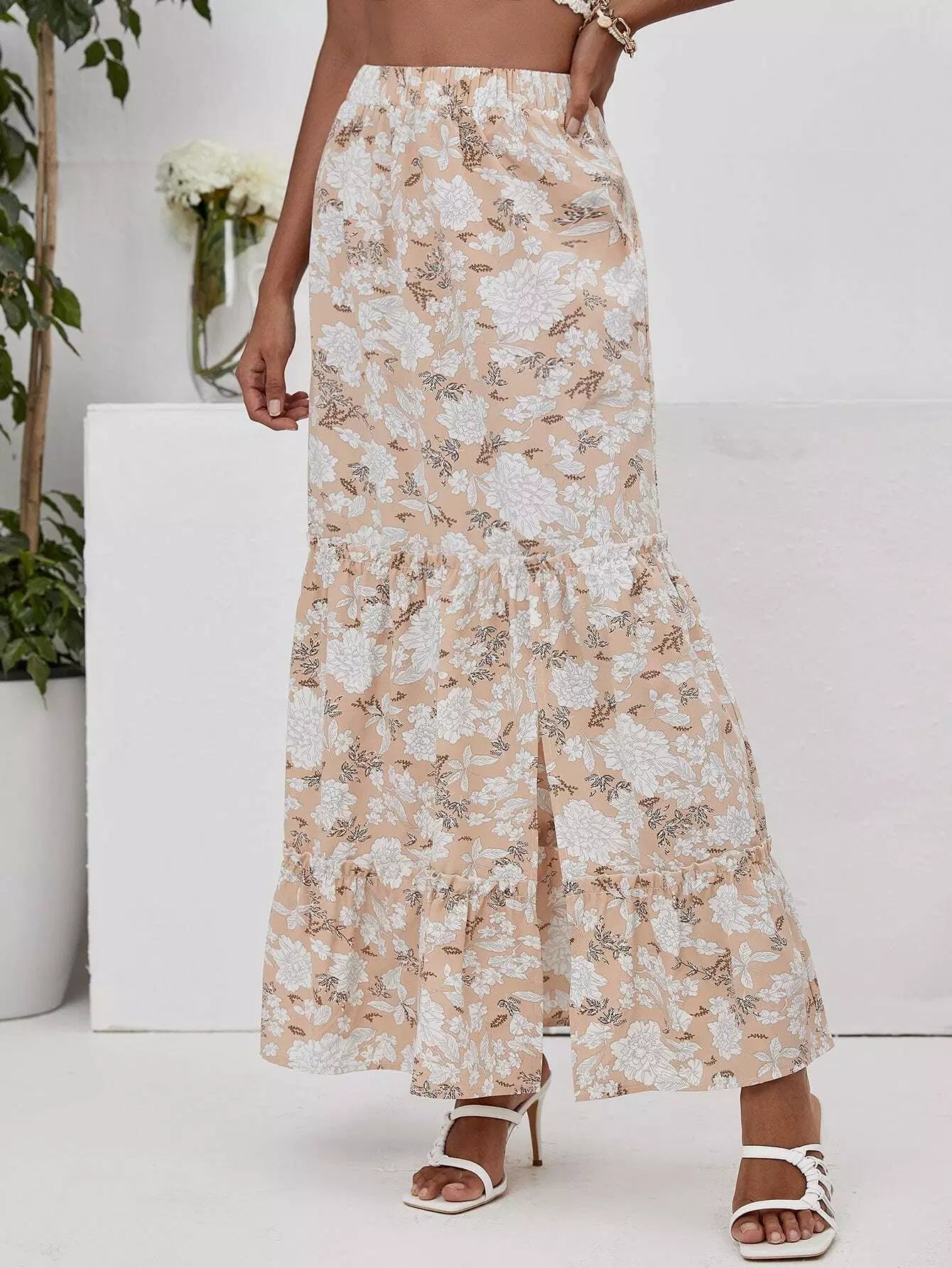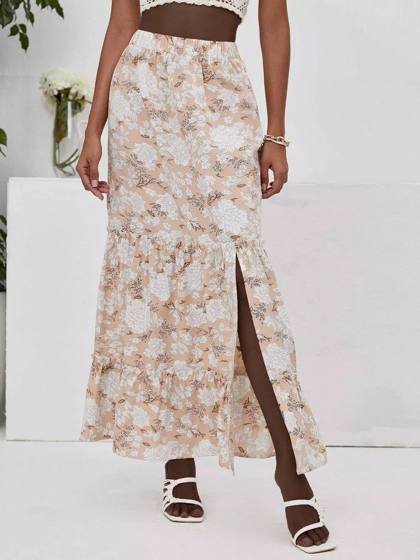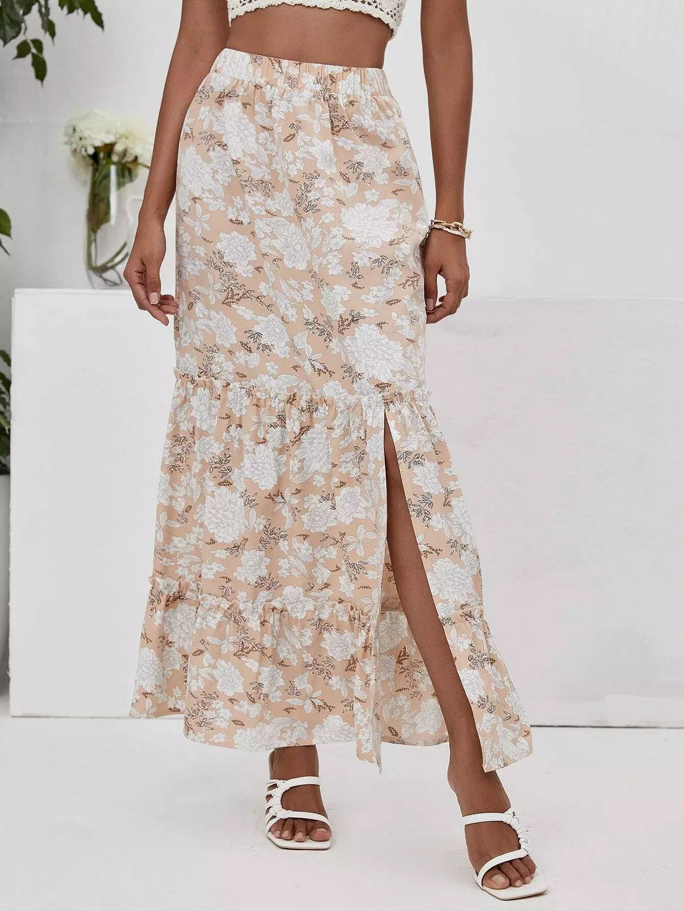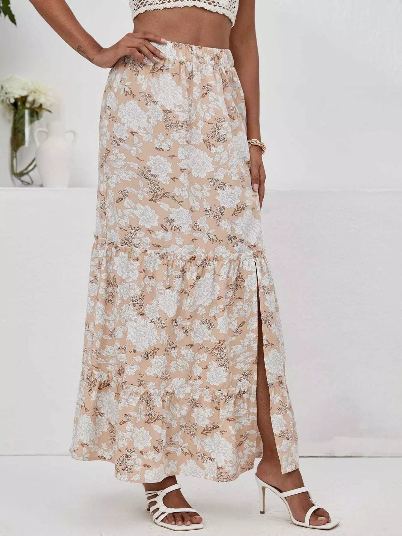 Floral Elastic Waist Slit Ruffle Hem Skirt