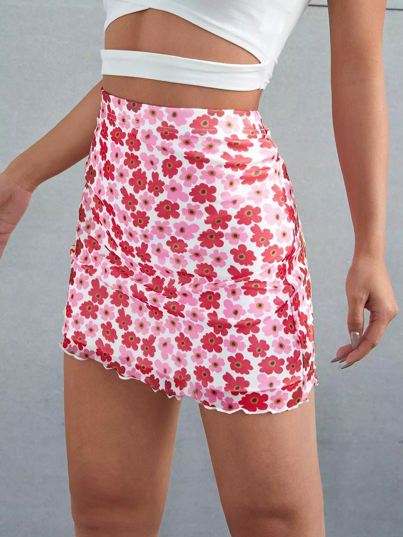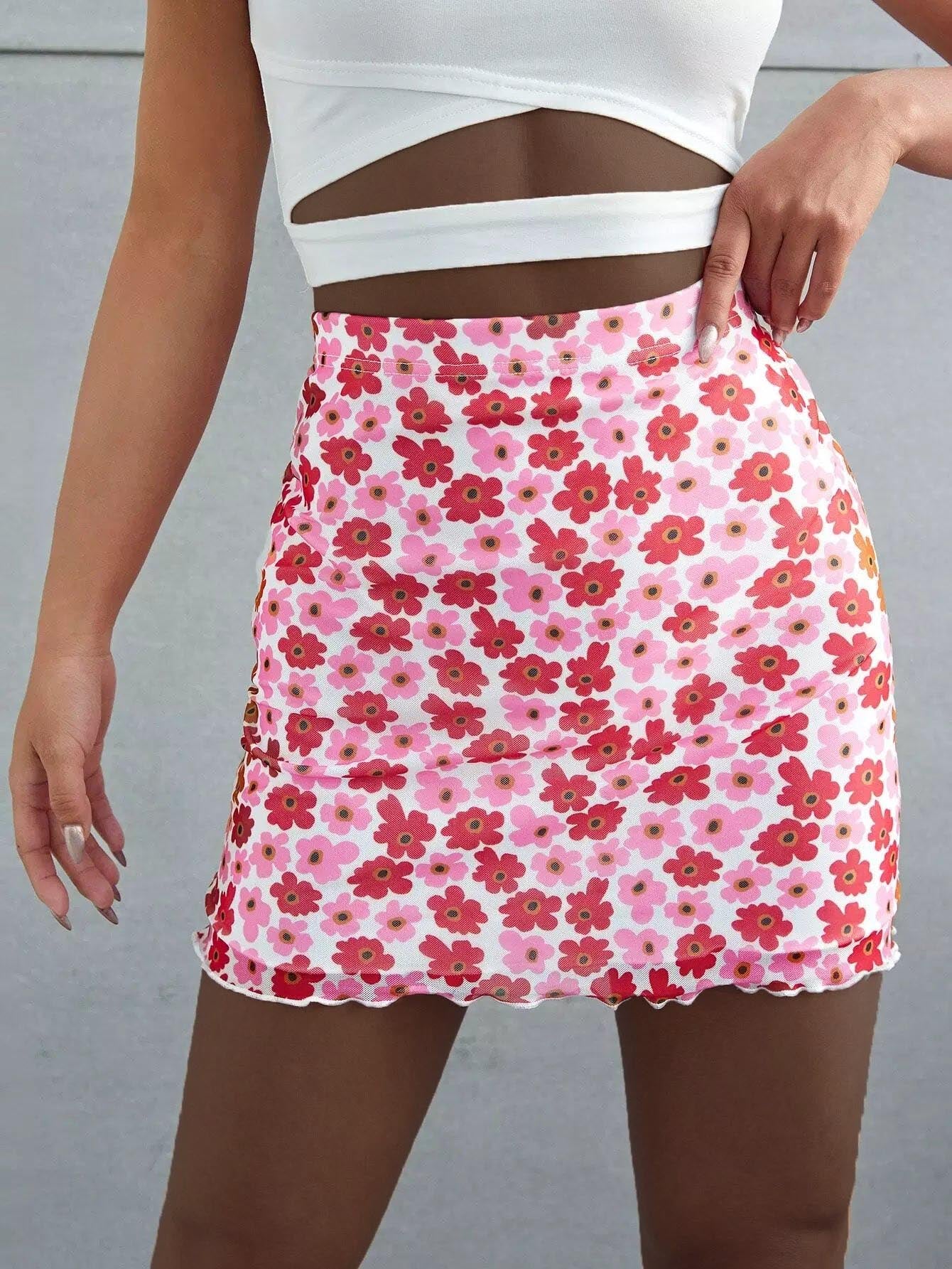 Floral Lettuce Trim Elastic Waist Skirt