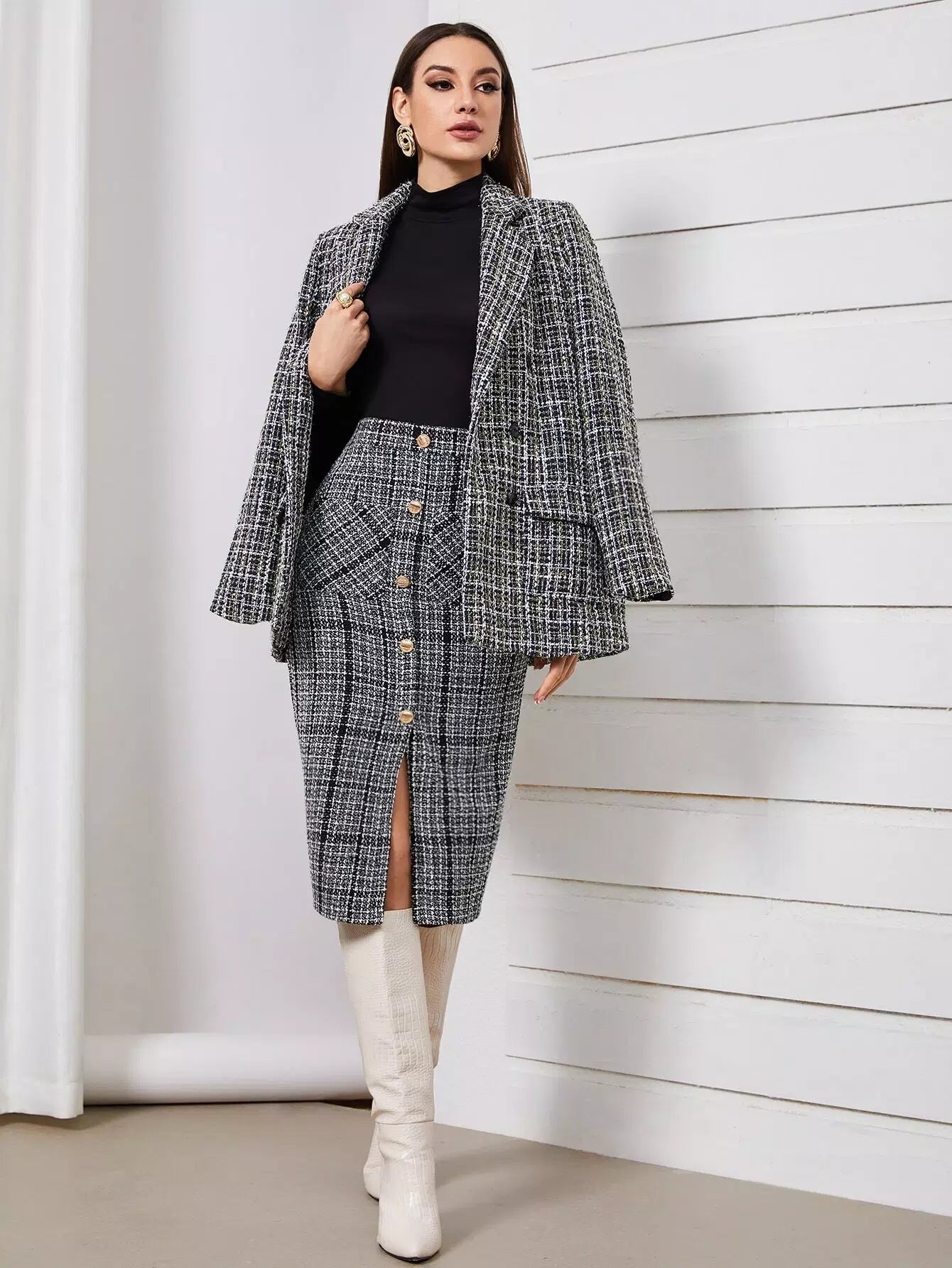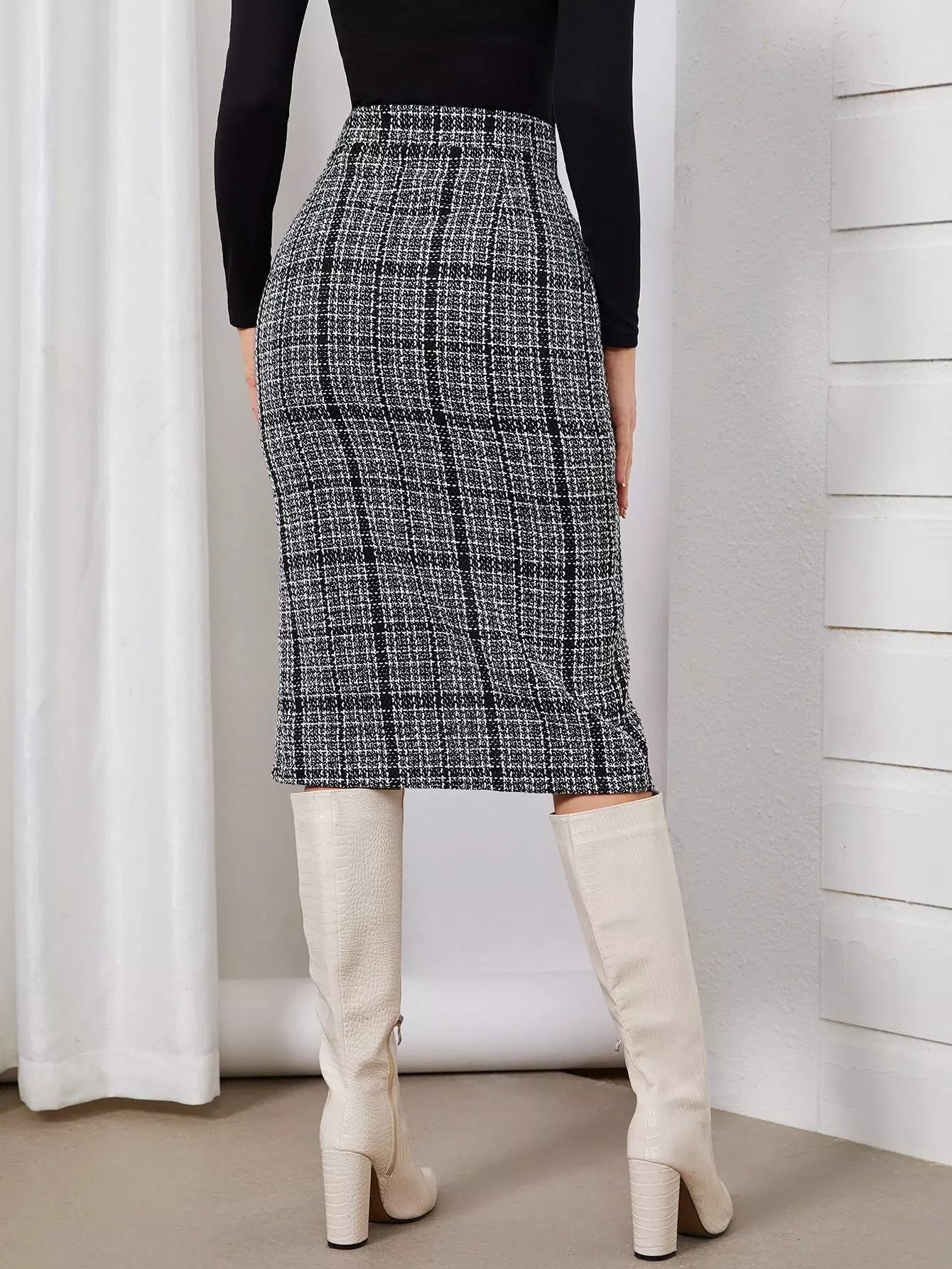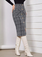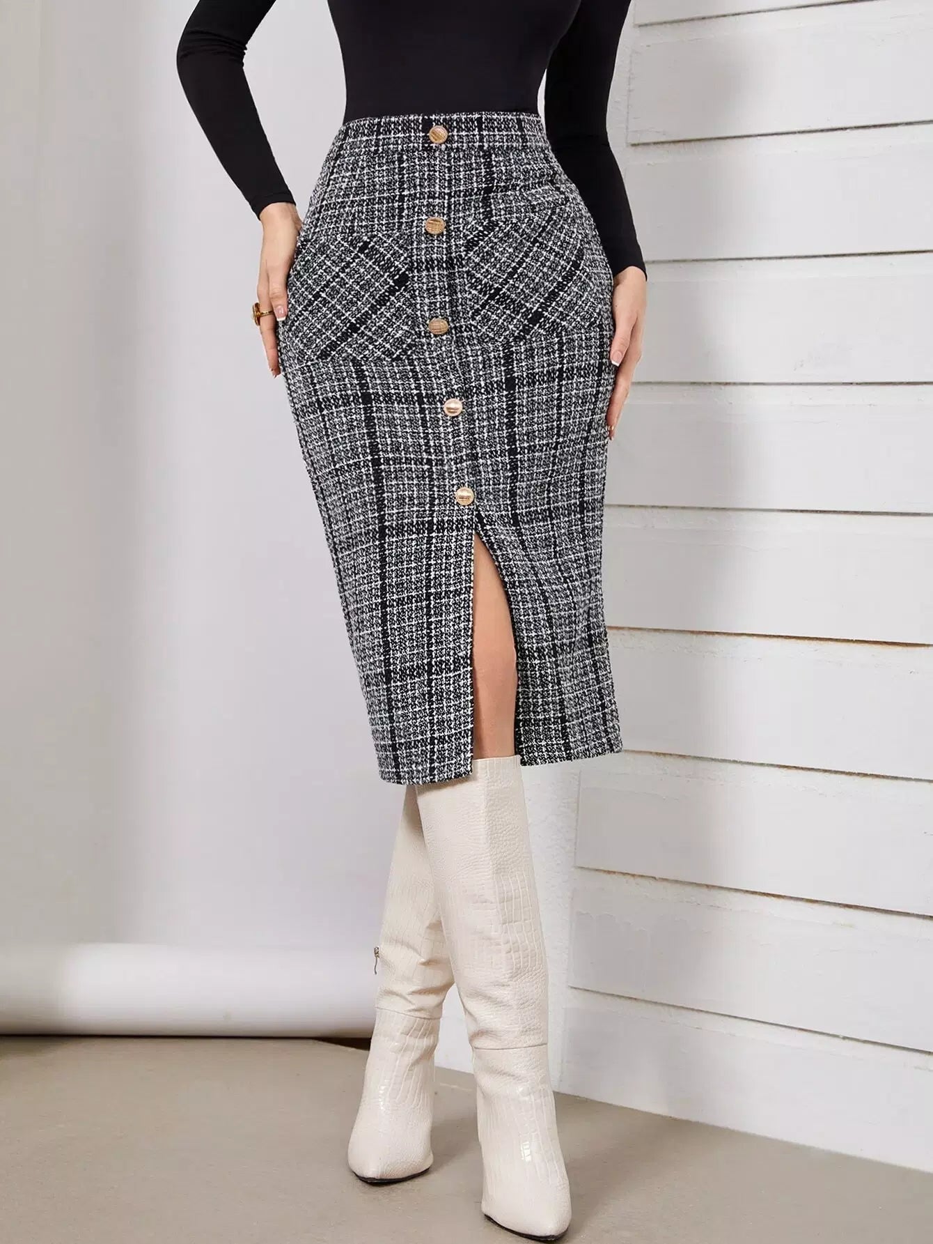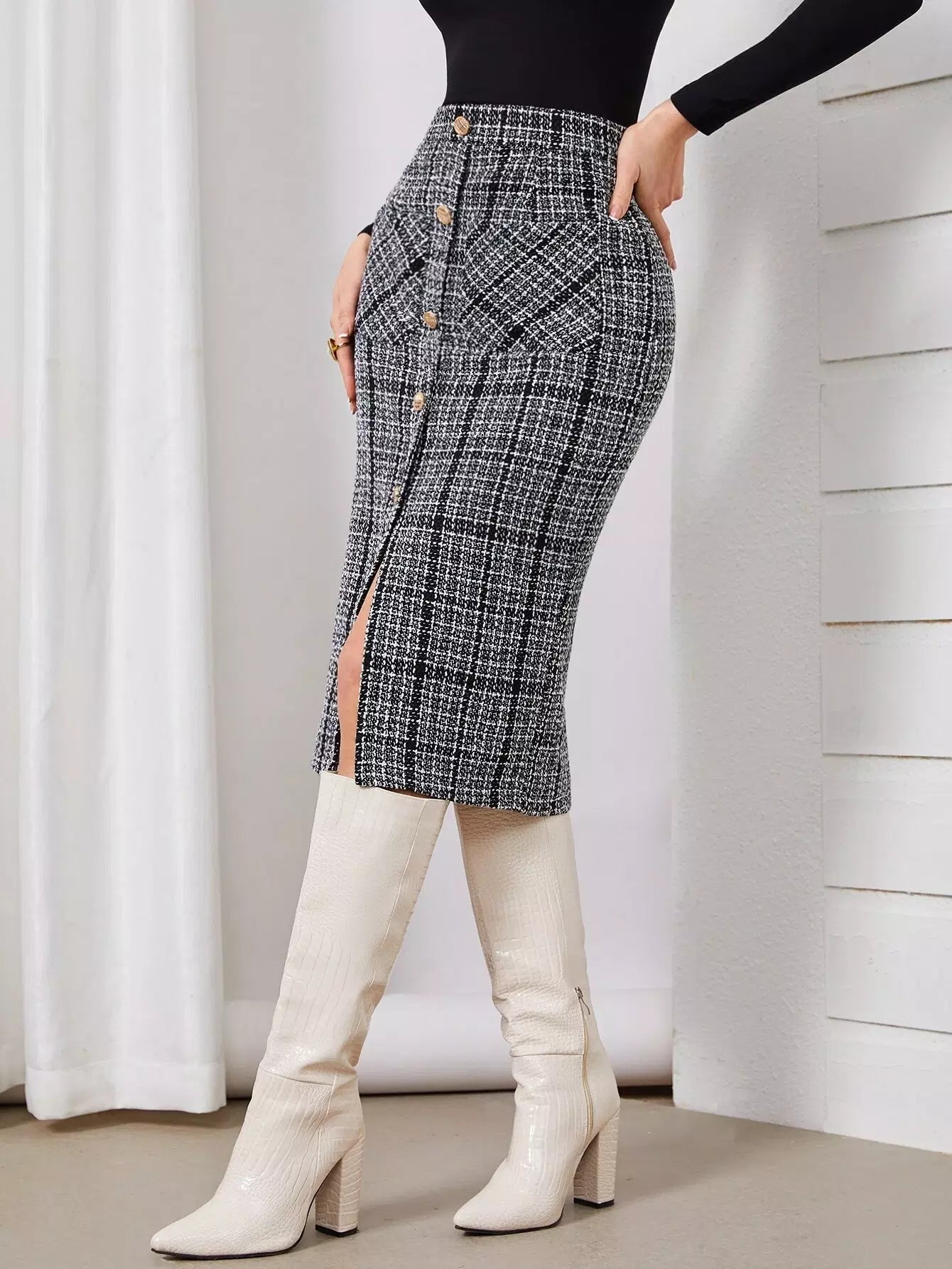 High Waist Plaid Pattern Single Breasted Dual Pocket Tweed Skirt