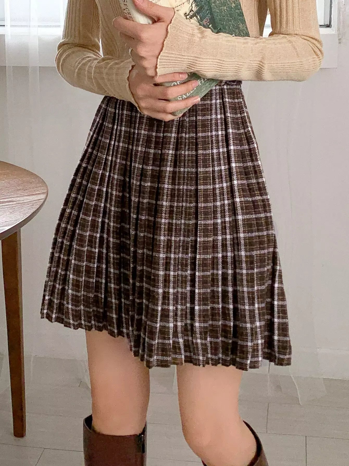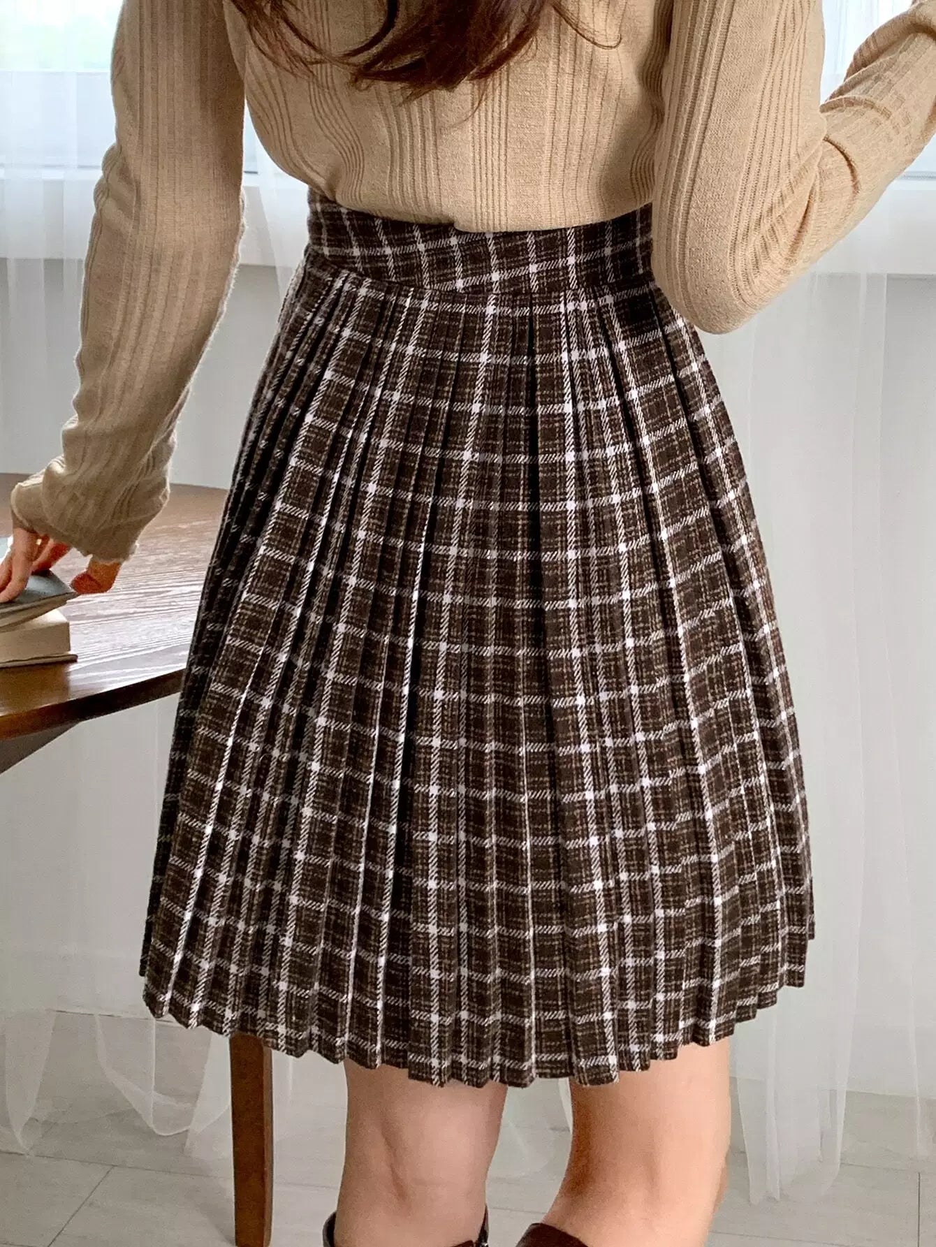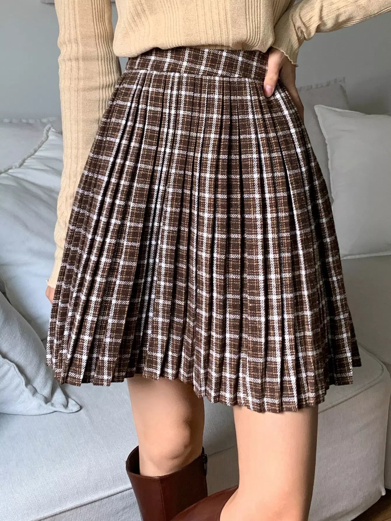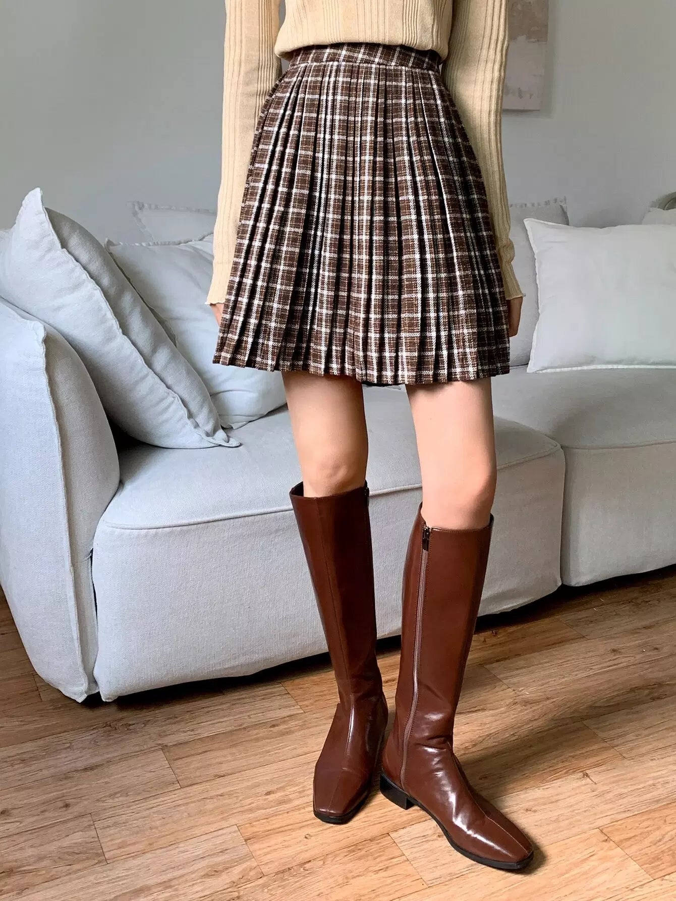 High Waist Plaid Zip Side Pleated Skirt