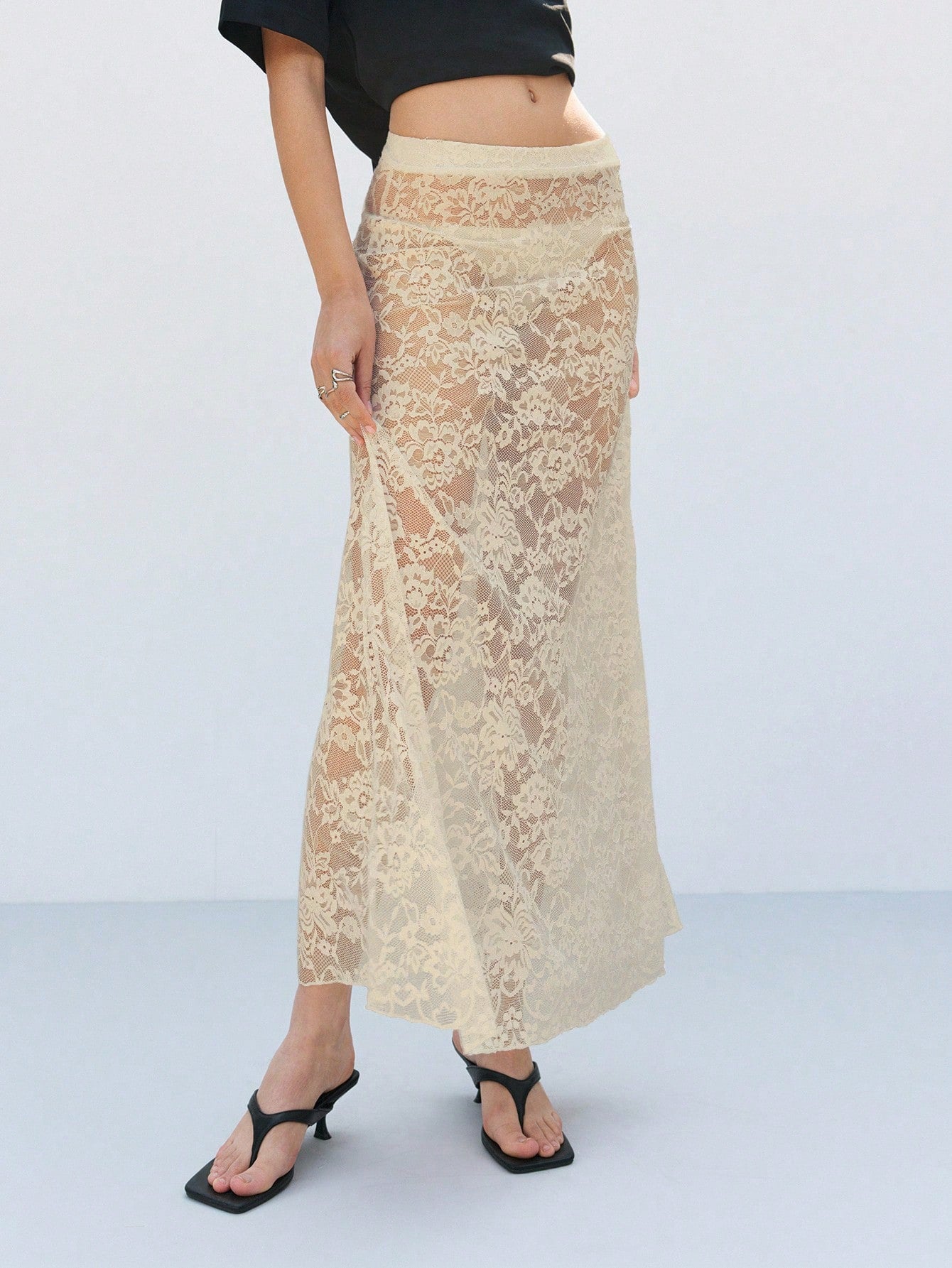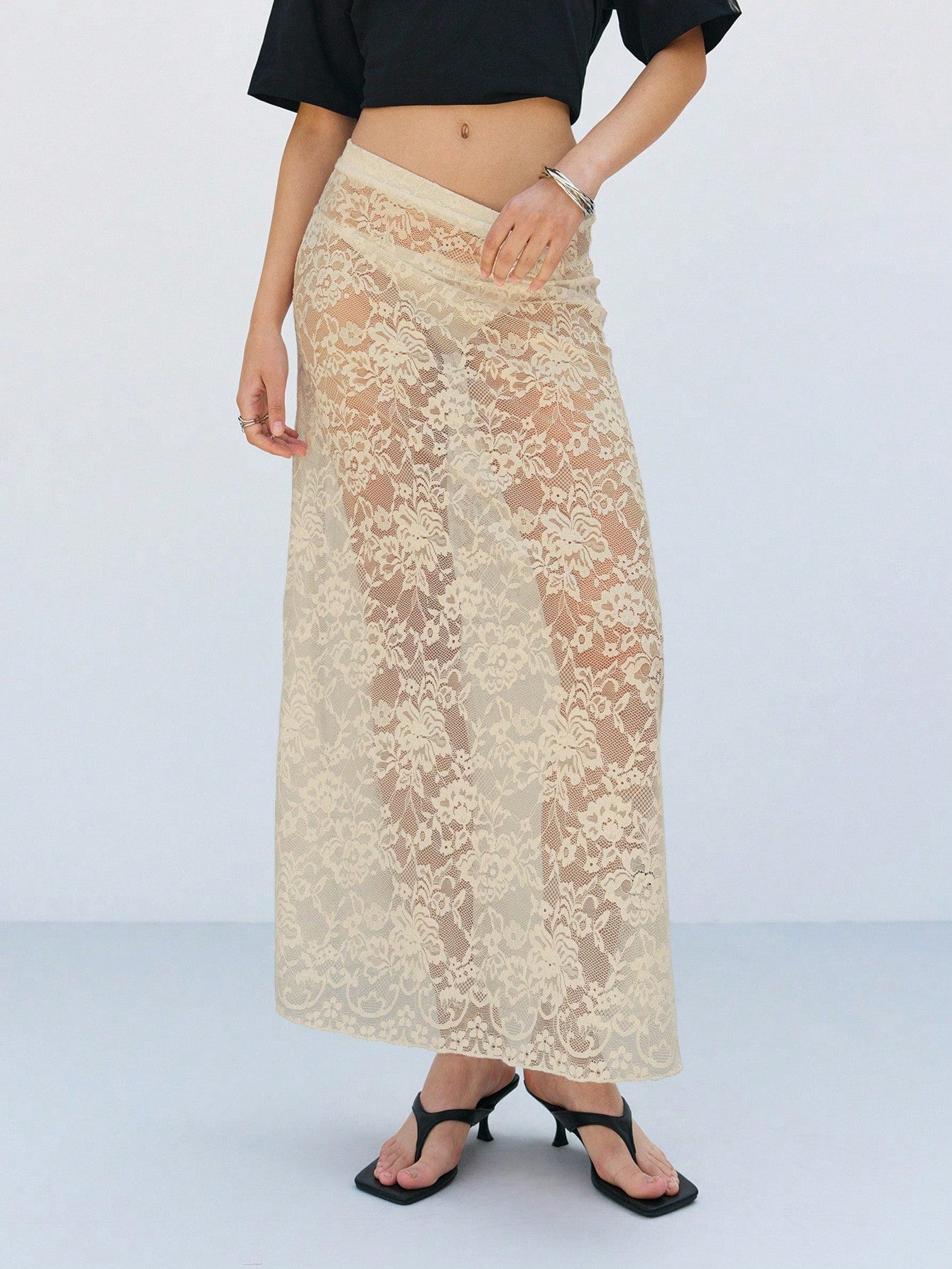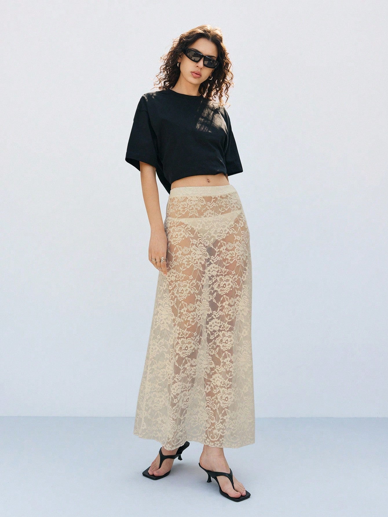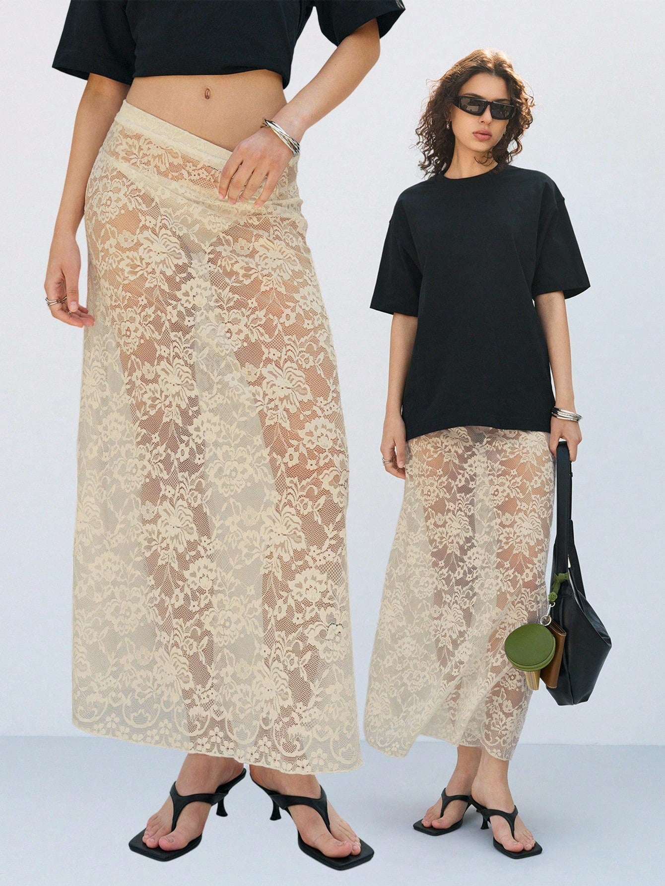 LYSMO 2025 New Arrival Women's Floral Lace Long Fashionable Sheer Midi Skirt