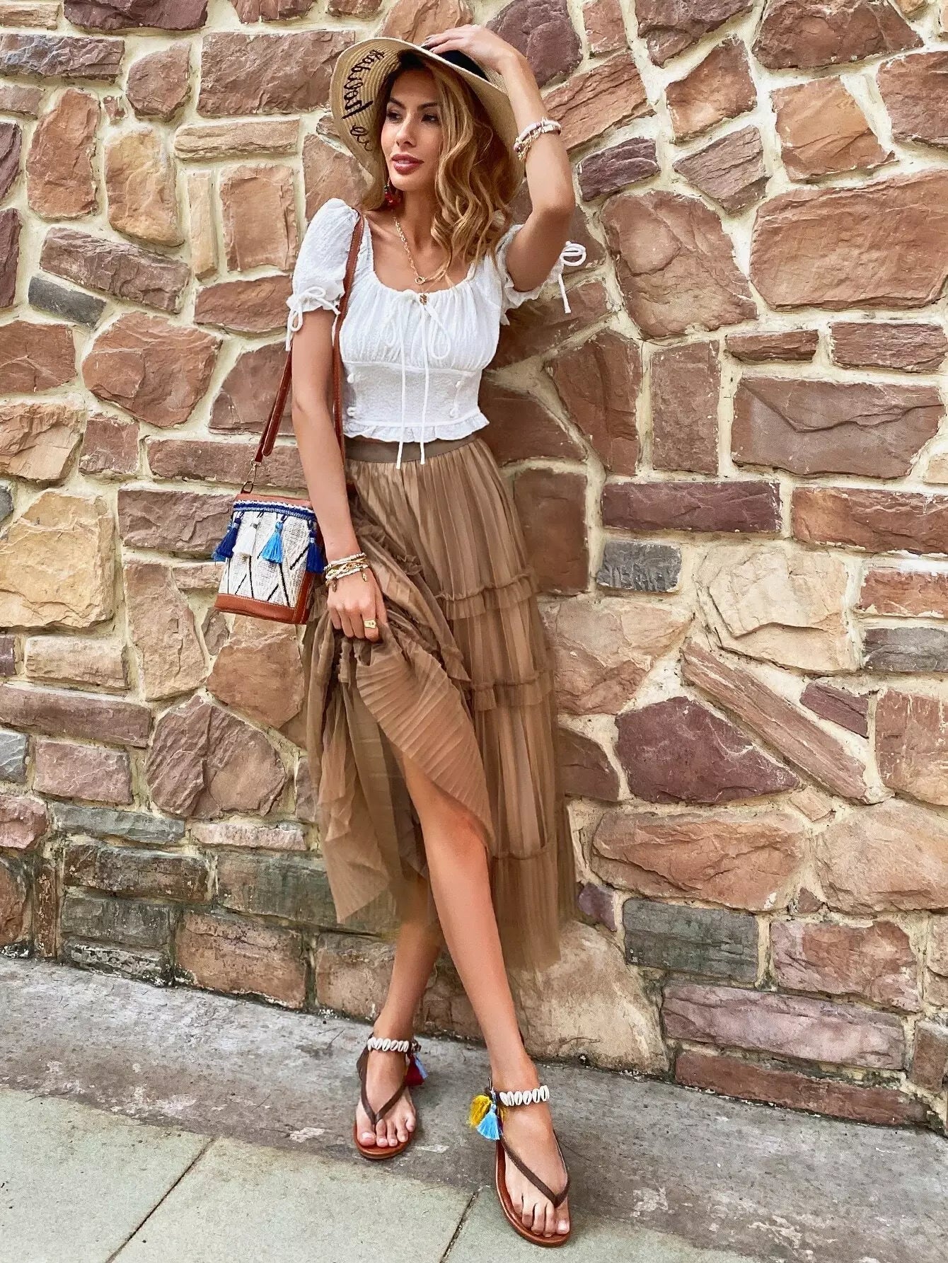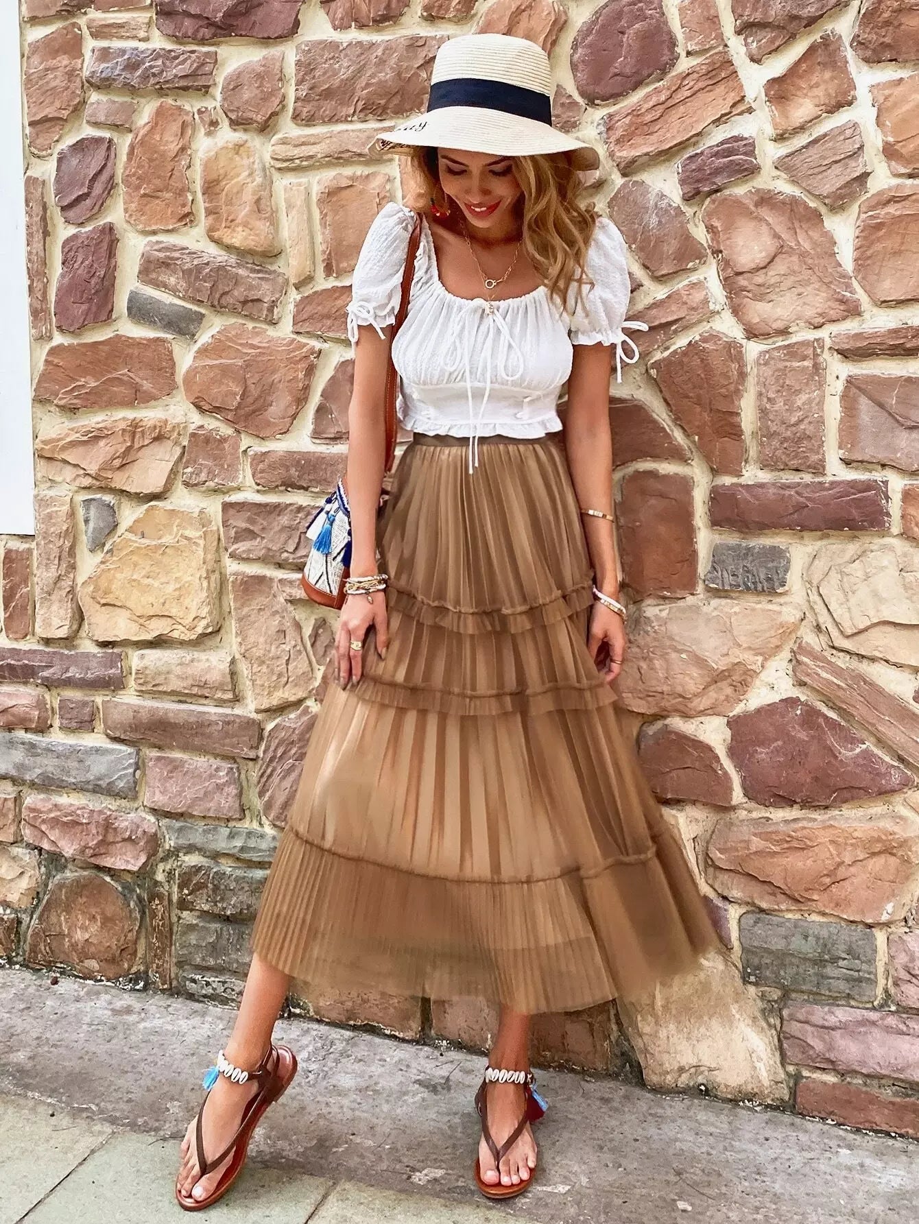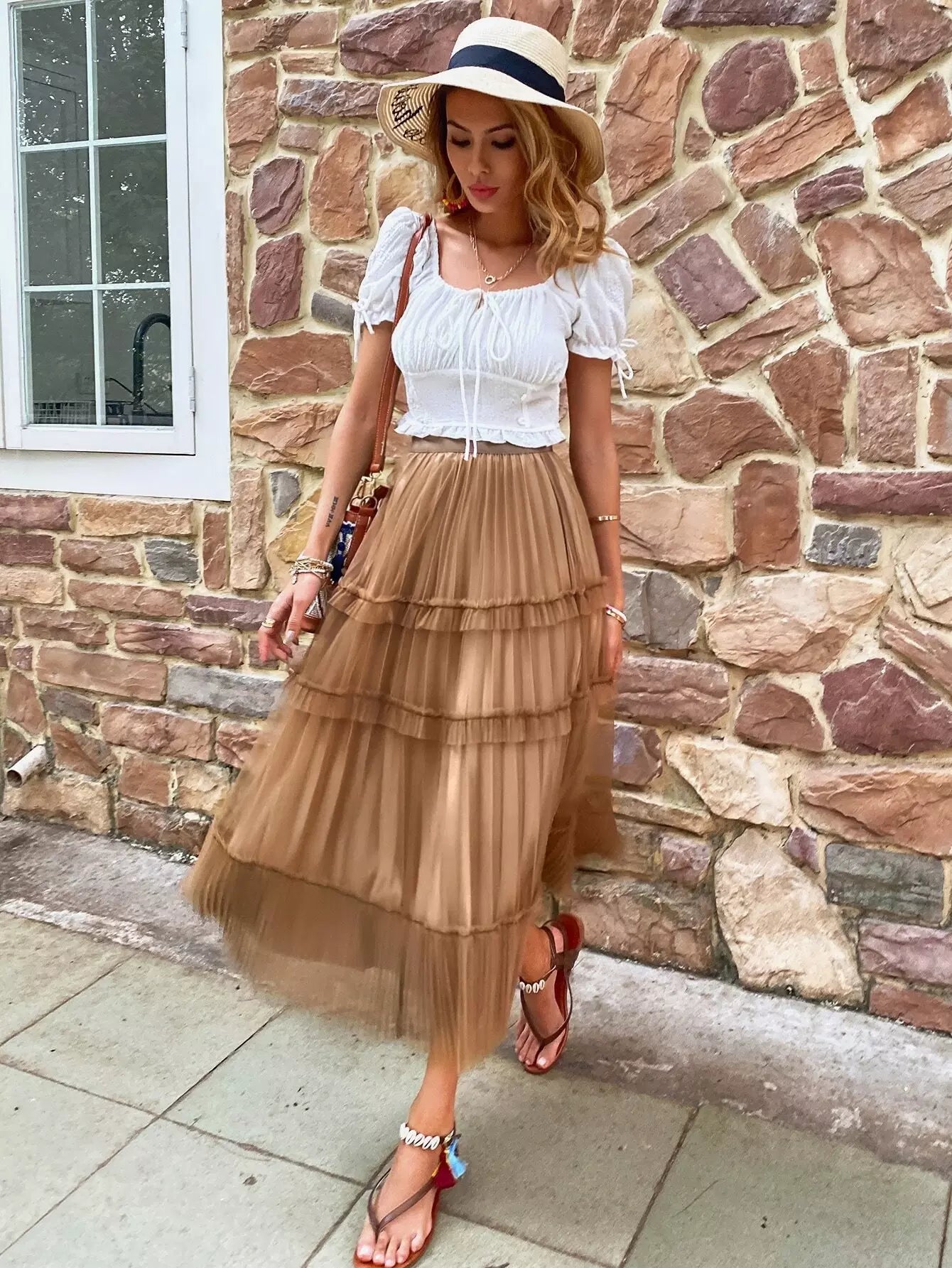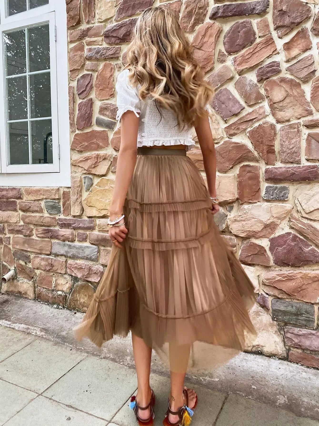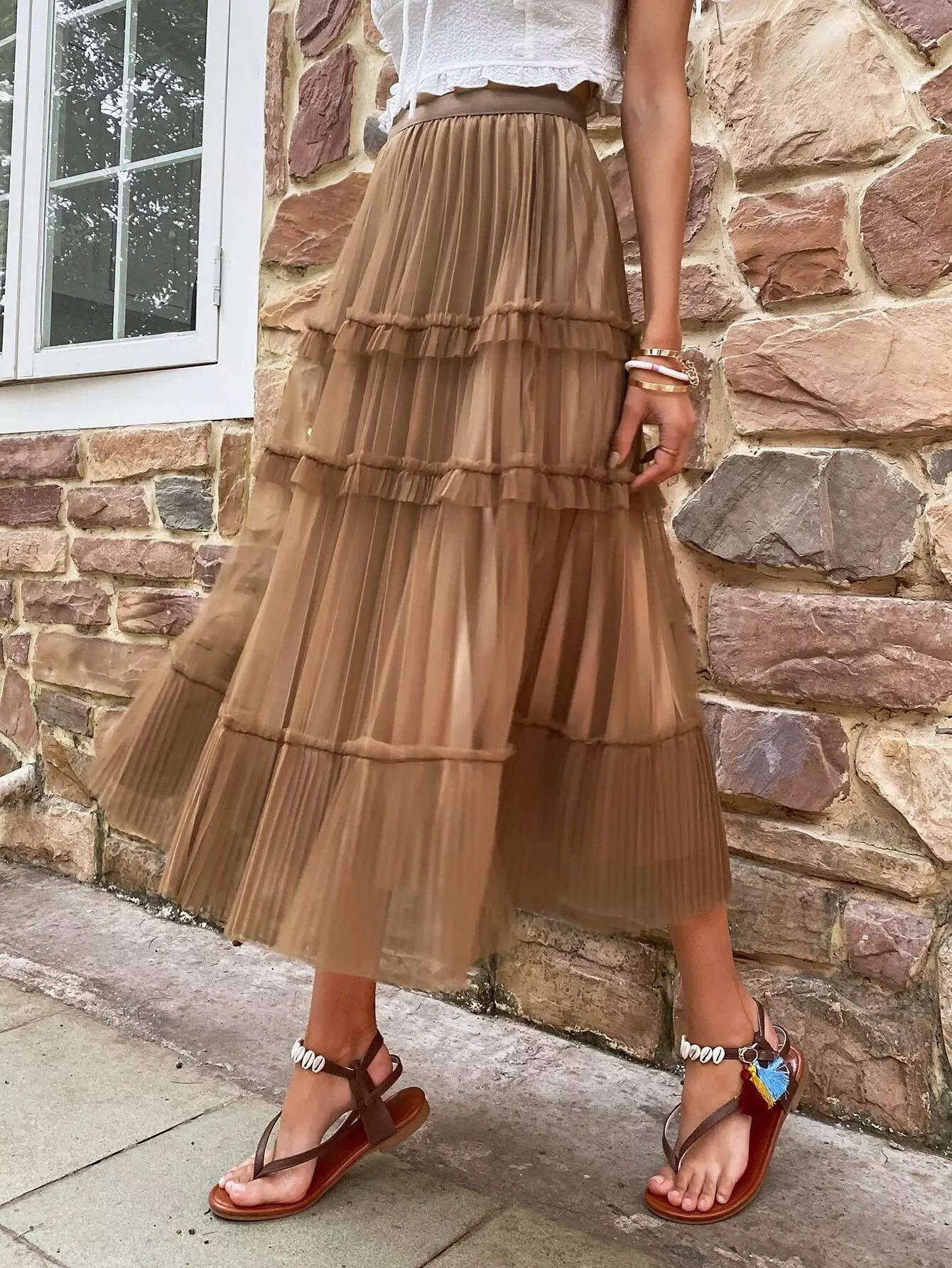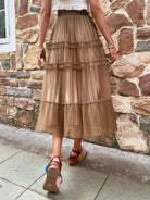 Mesh Solid Tiered Layer Pleated Skirt