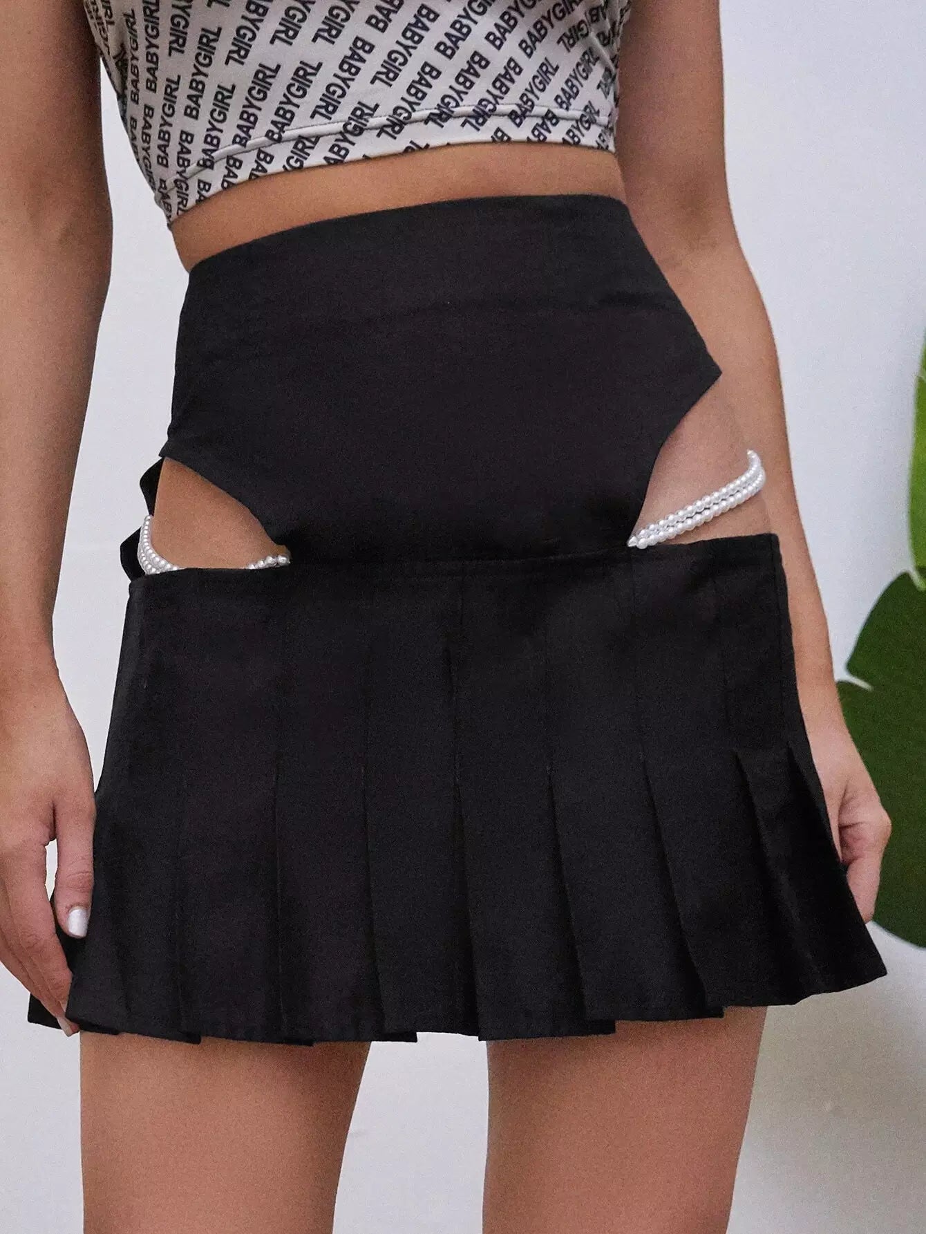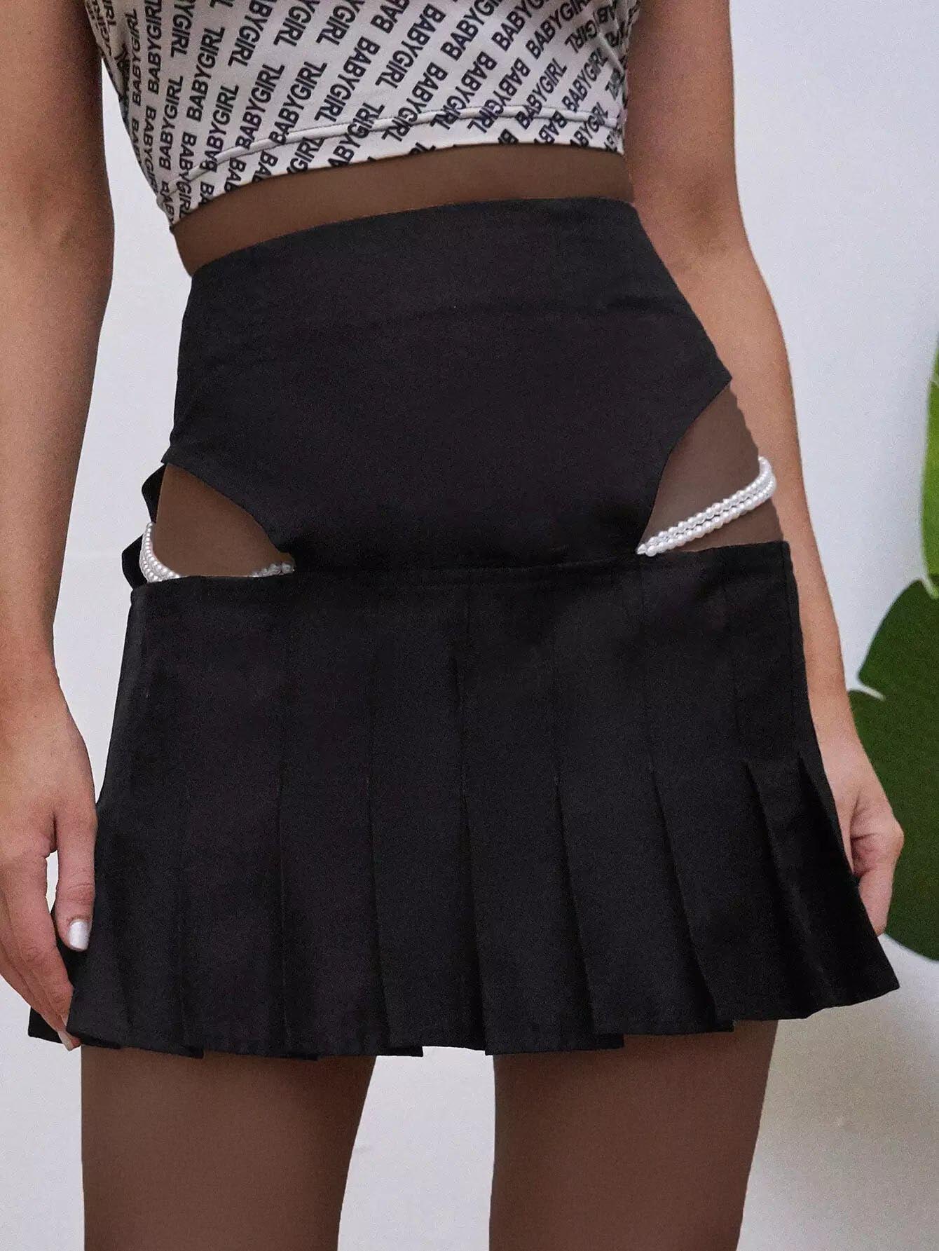 Pearls Chain Decoration Peekaboo Pleated Skirt
