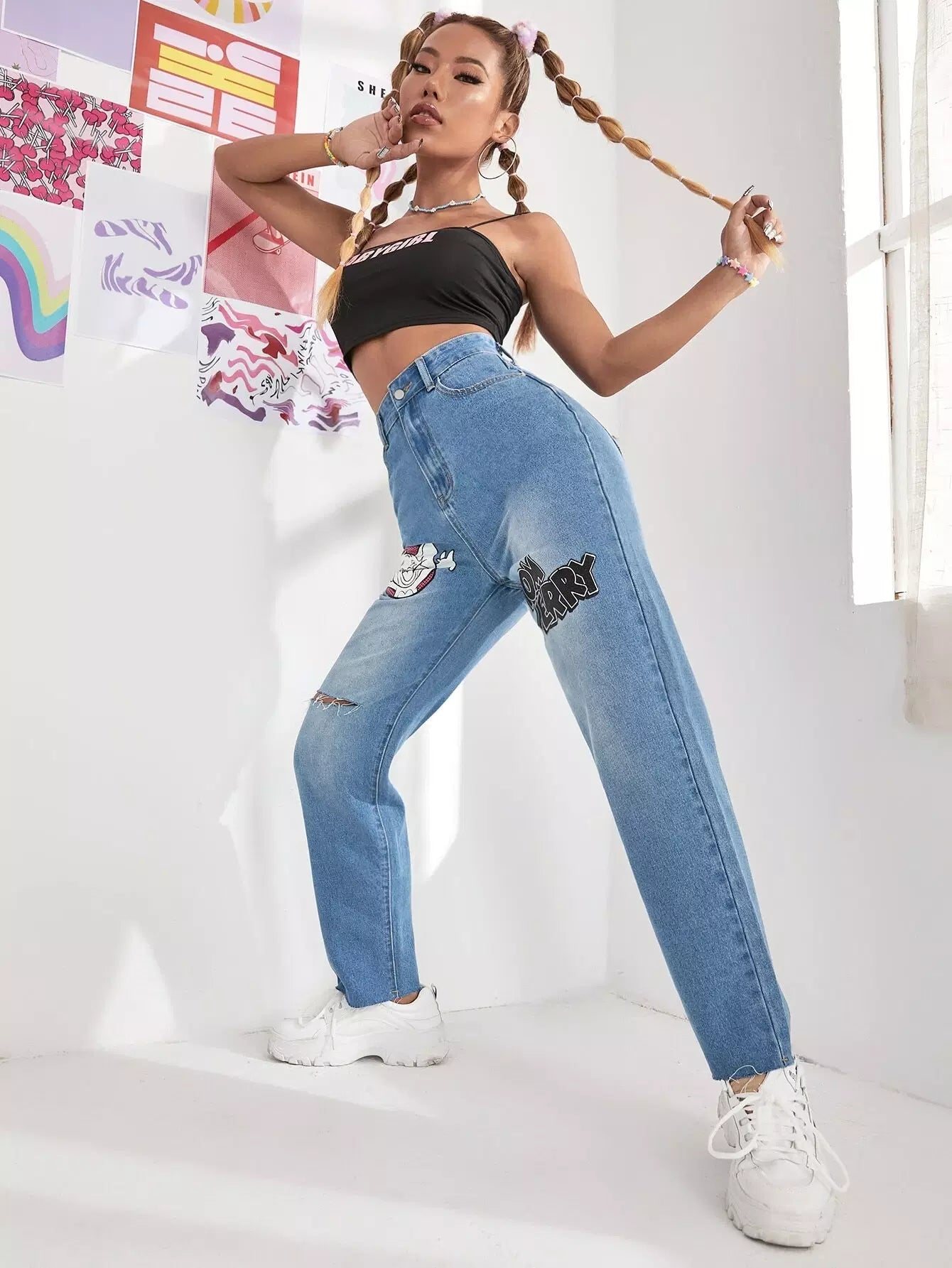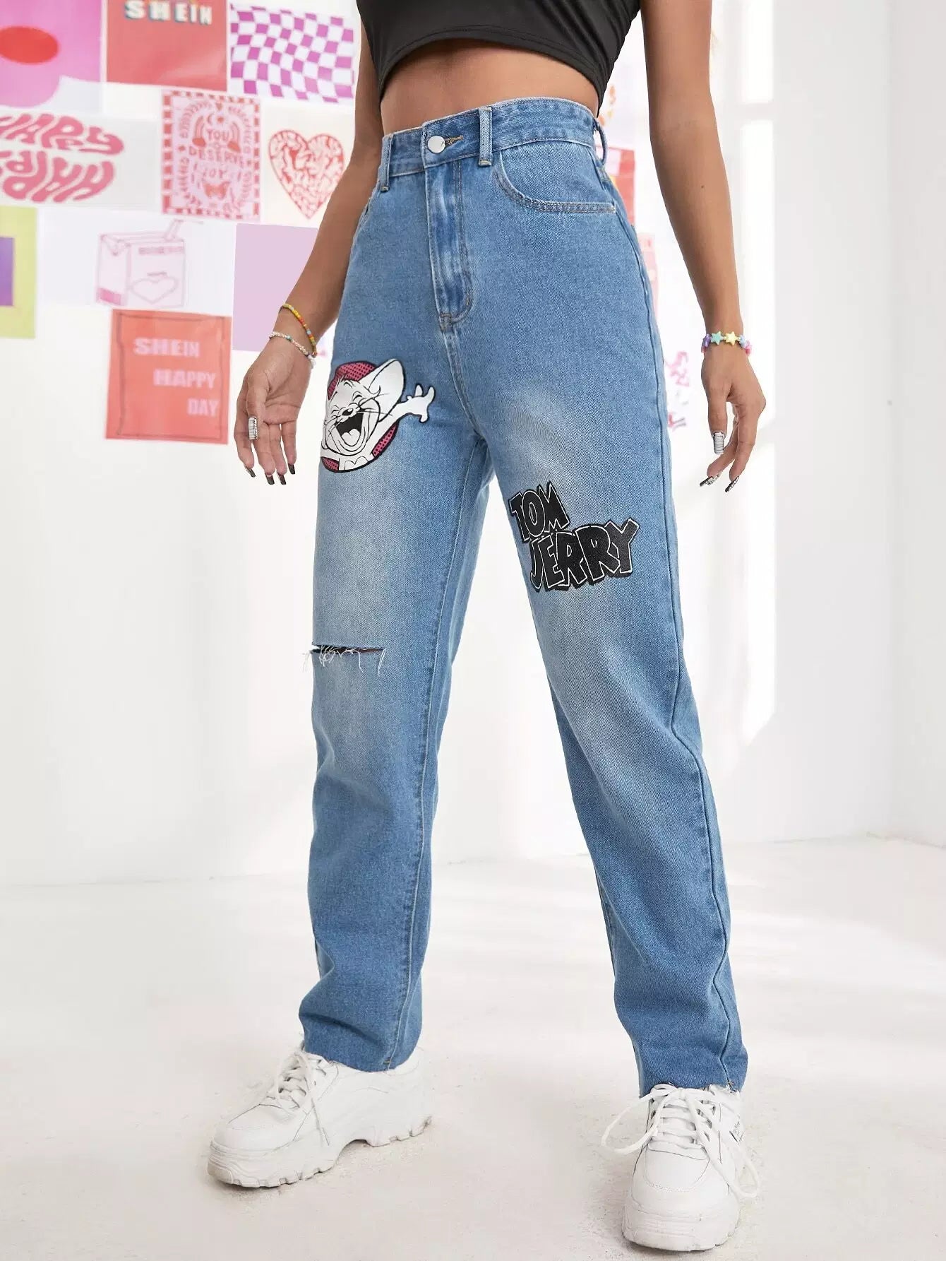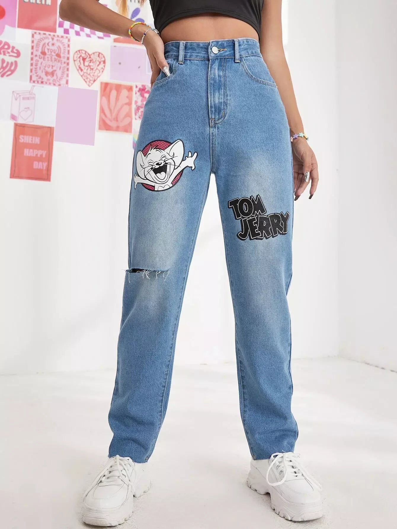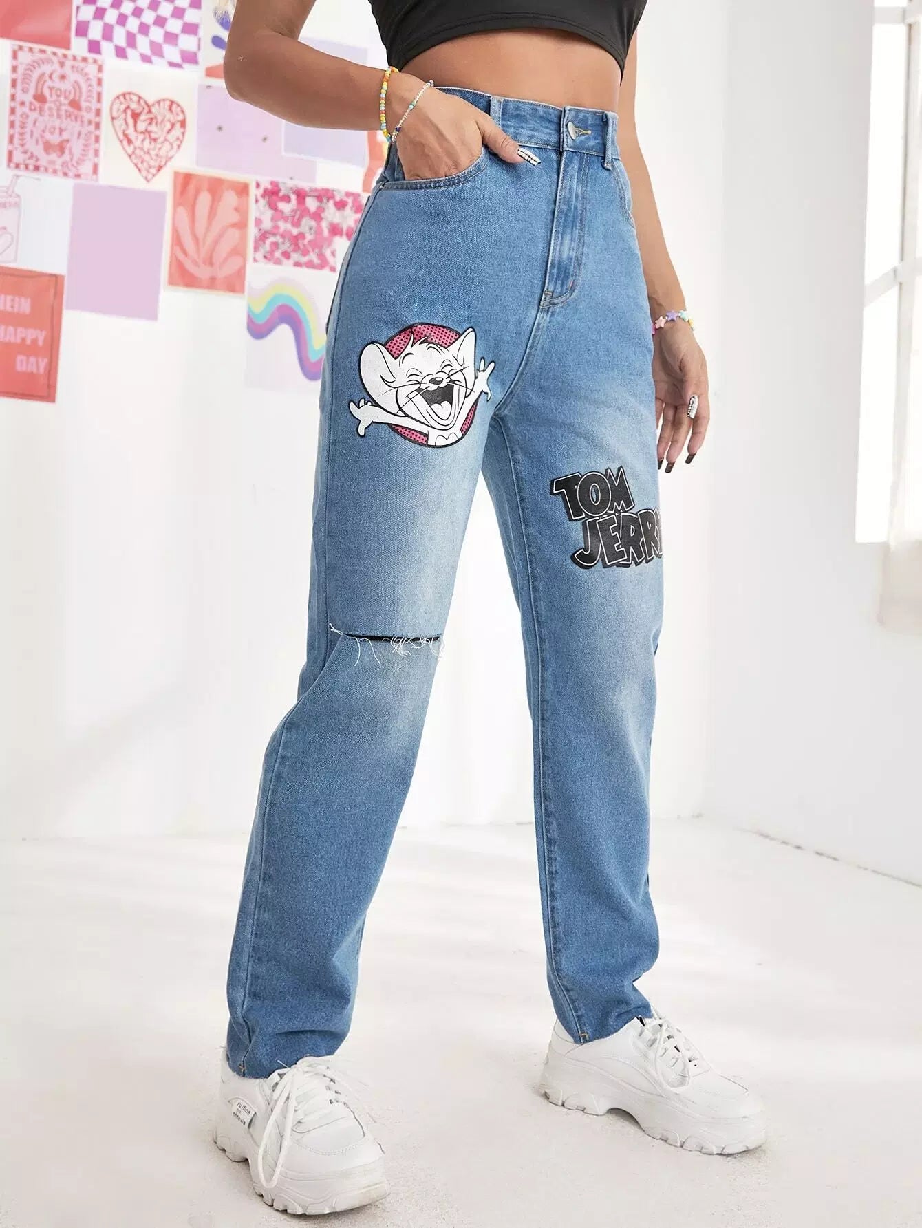 Women - High Waist Letter & Cartoon Graphic Ripped Jeans