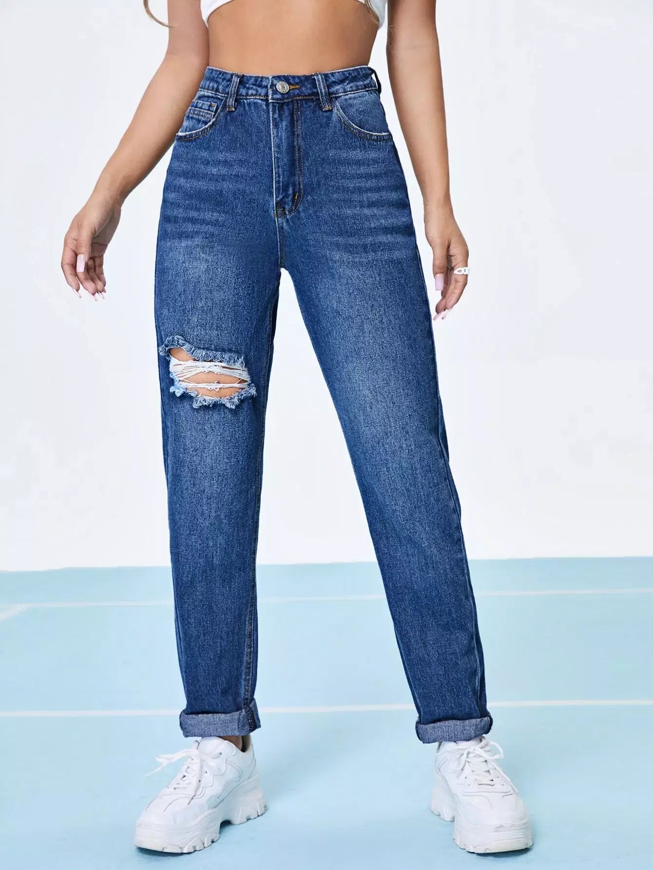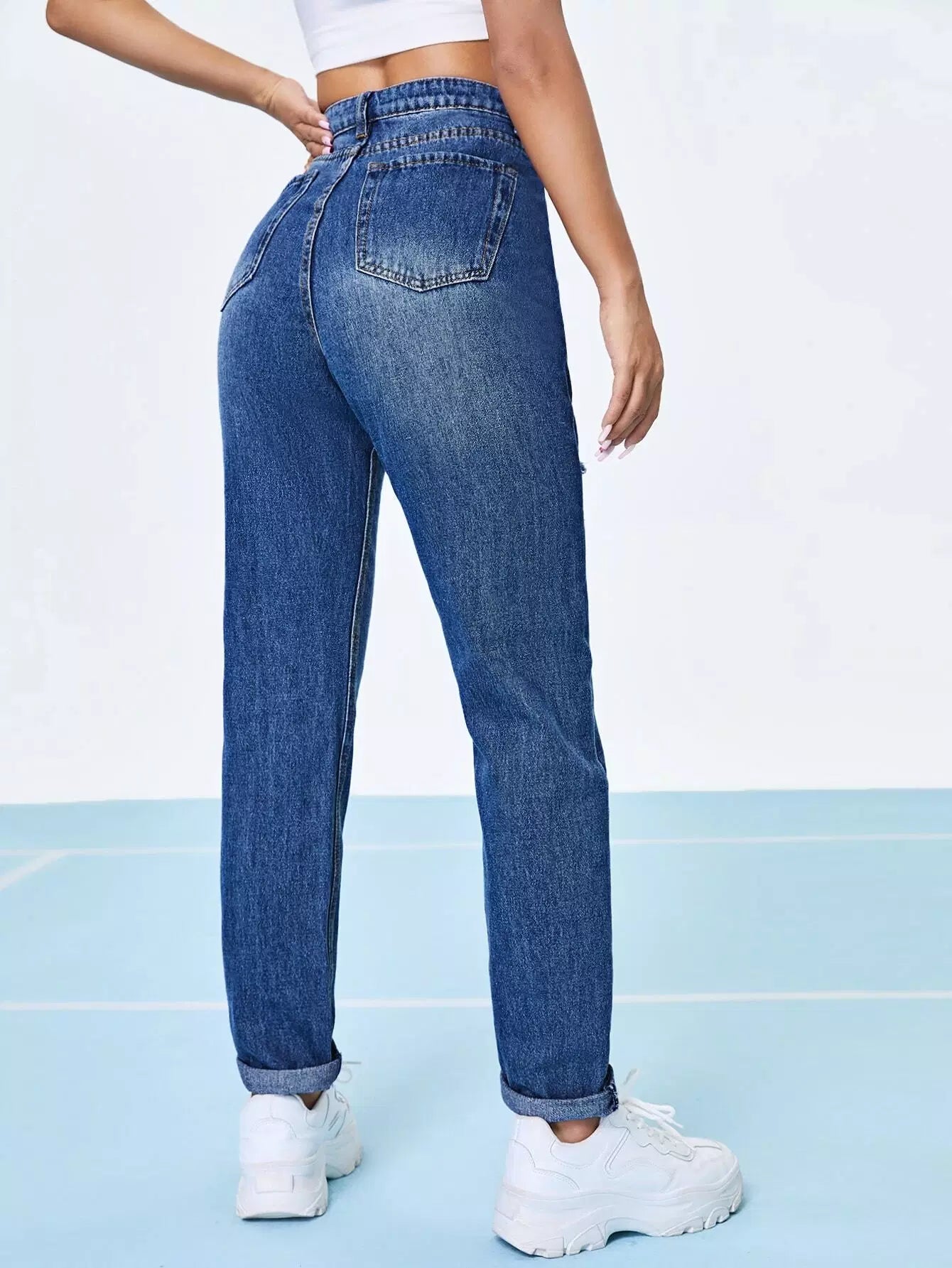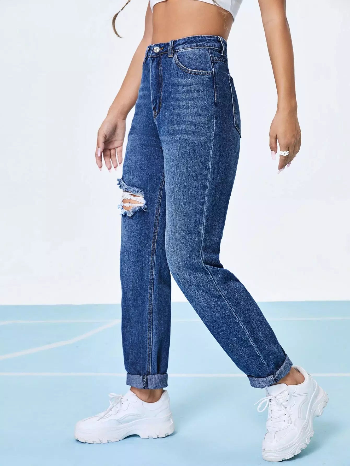 High Waist Ripped Roll Hem Straight Leg Jeans
