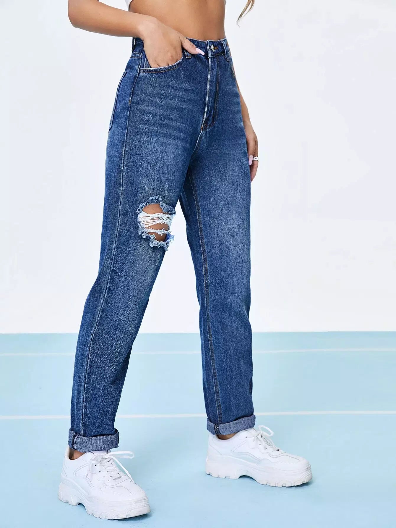Women - High Waist Ripped Roll Hem Straight Leg Jeans