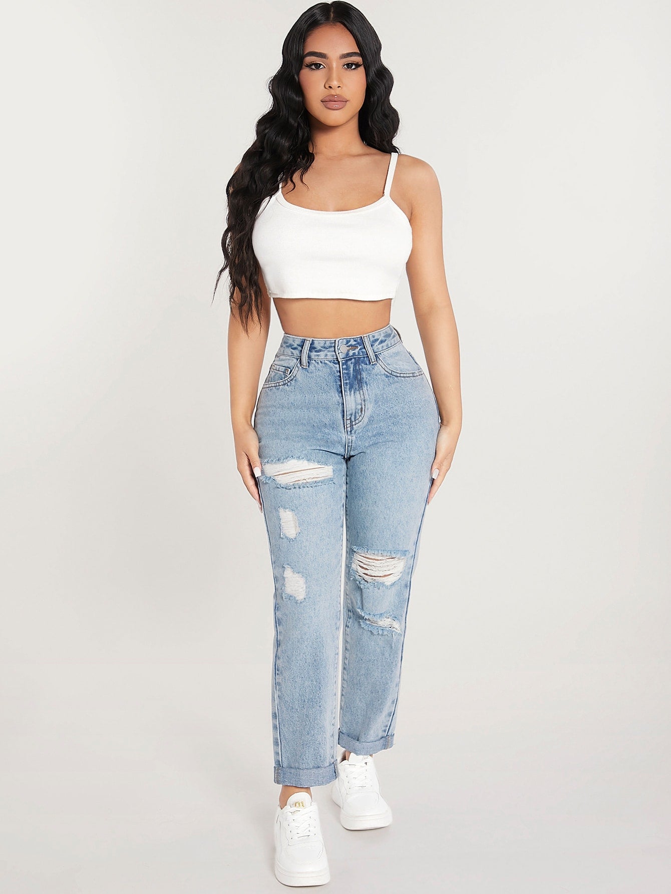 women SHEIN PETITE High Waist Ripped Roll Up Hem Mom Fit Jeans