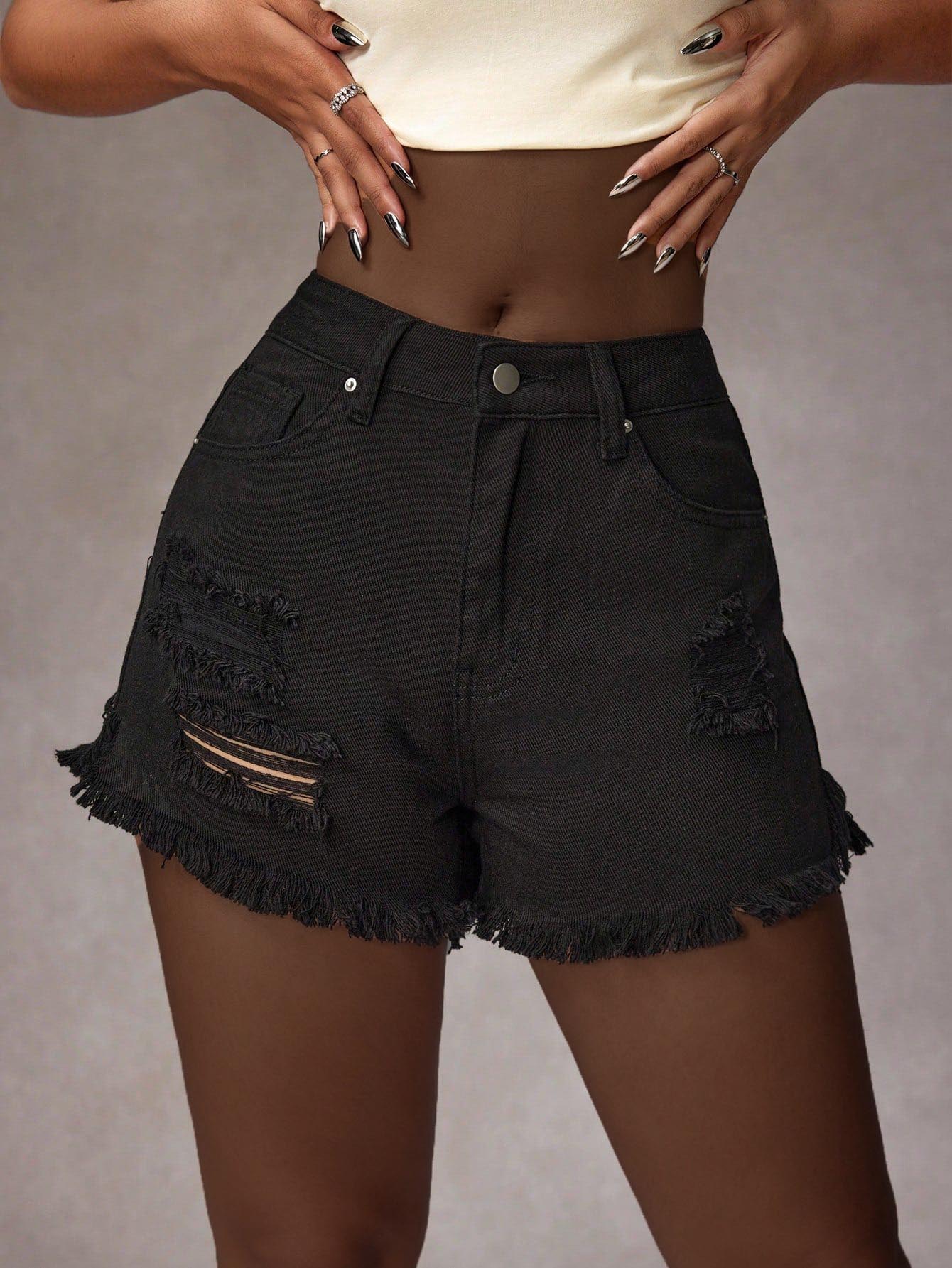 Tall Front Button Pocket Distressed Frayed Edge Denim Shorts, Casual Daily Wear