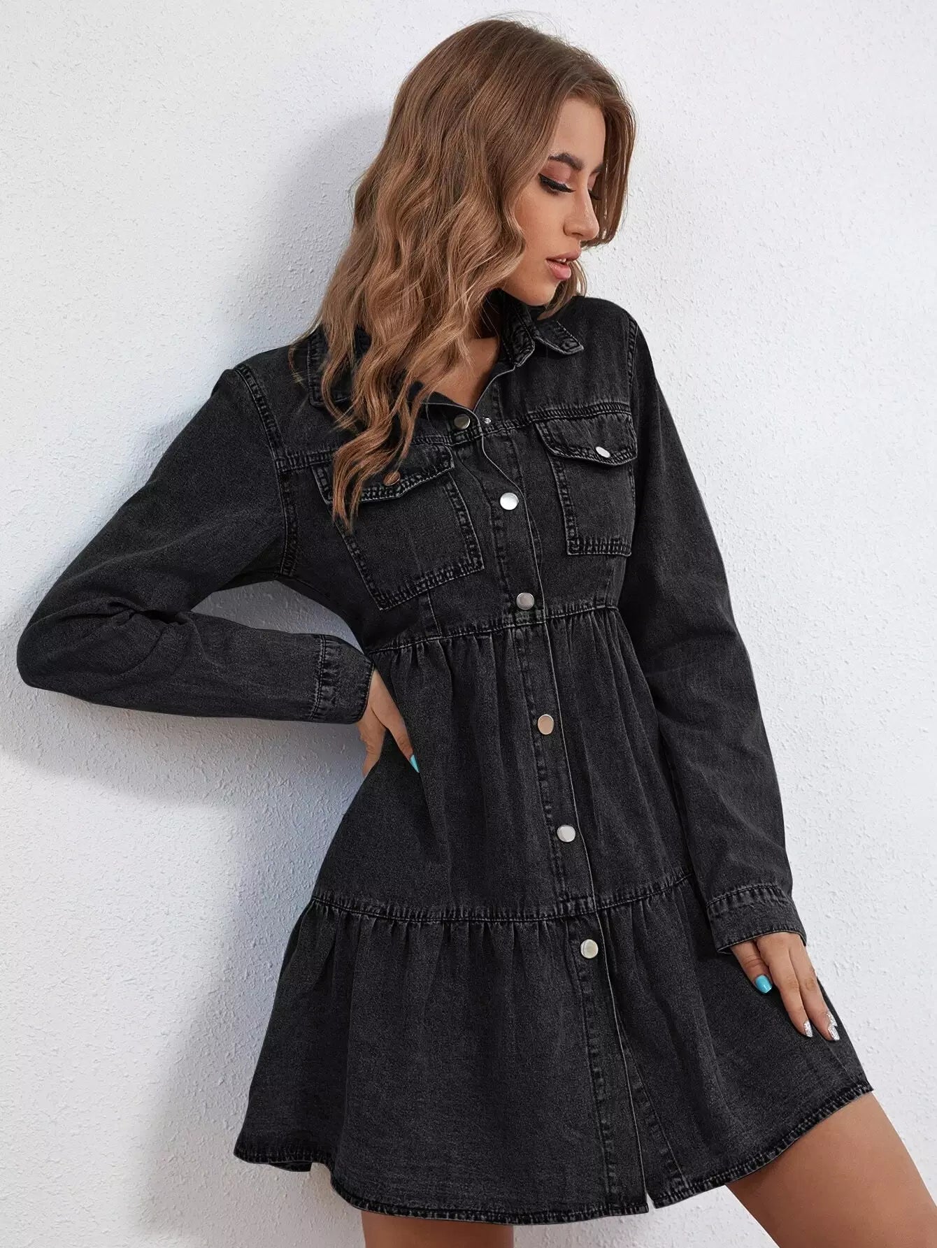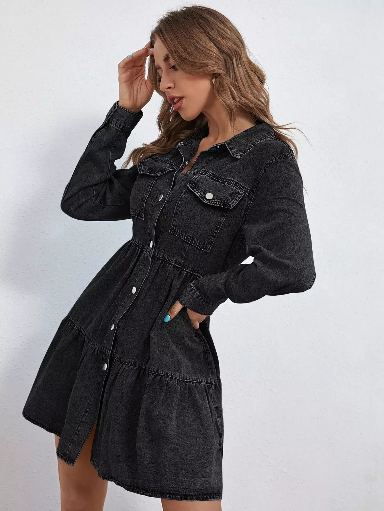 A-Line Button Front Flap Pocket Flounce Hem Denim Dress