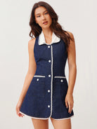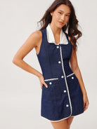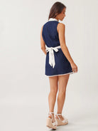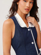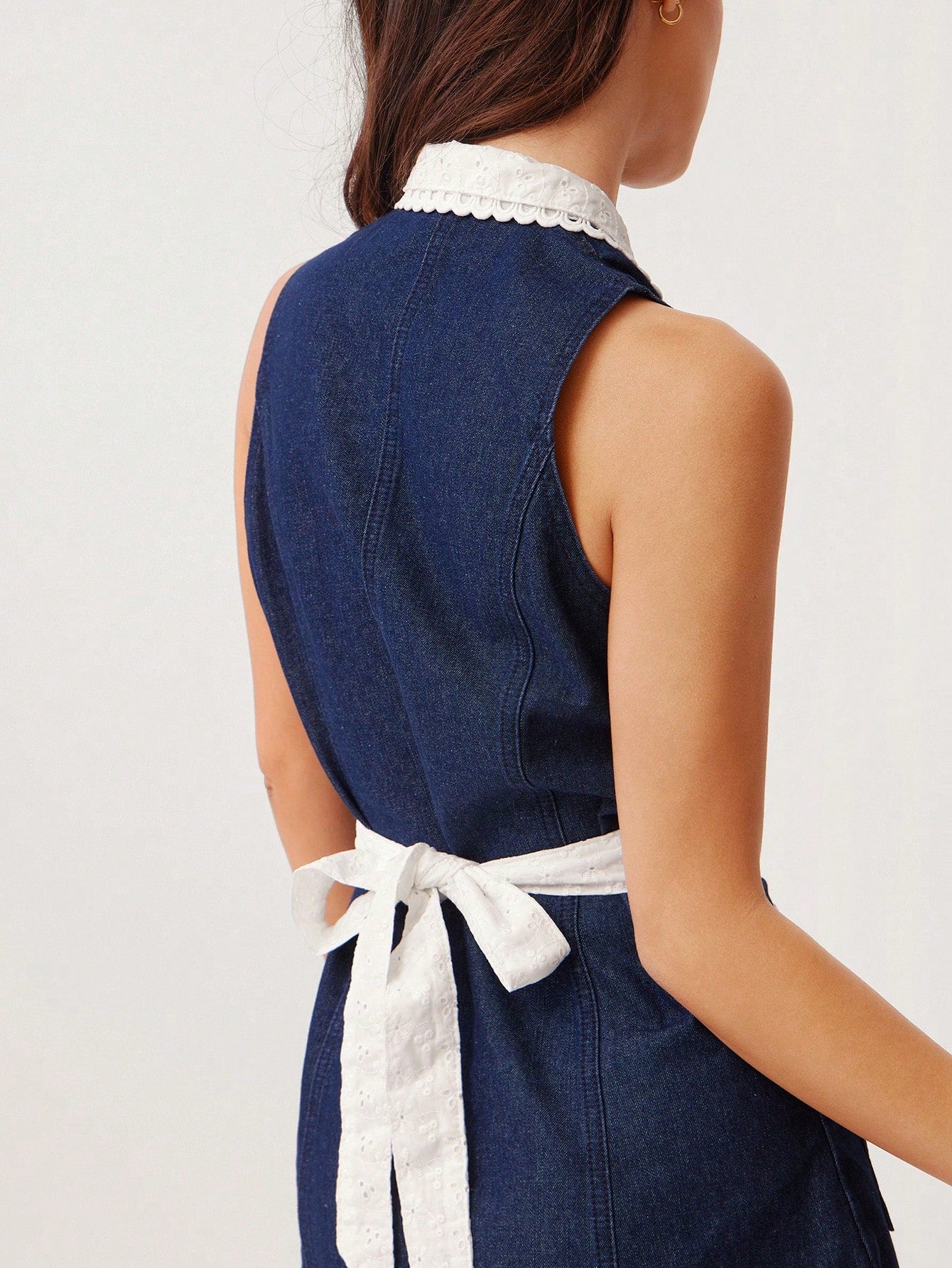 WESTFADE Western Mix Media Cotton Denim Blend & Floral Eyelet Collared Button Front Cute Bow Tie Back