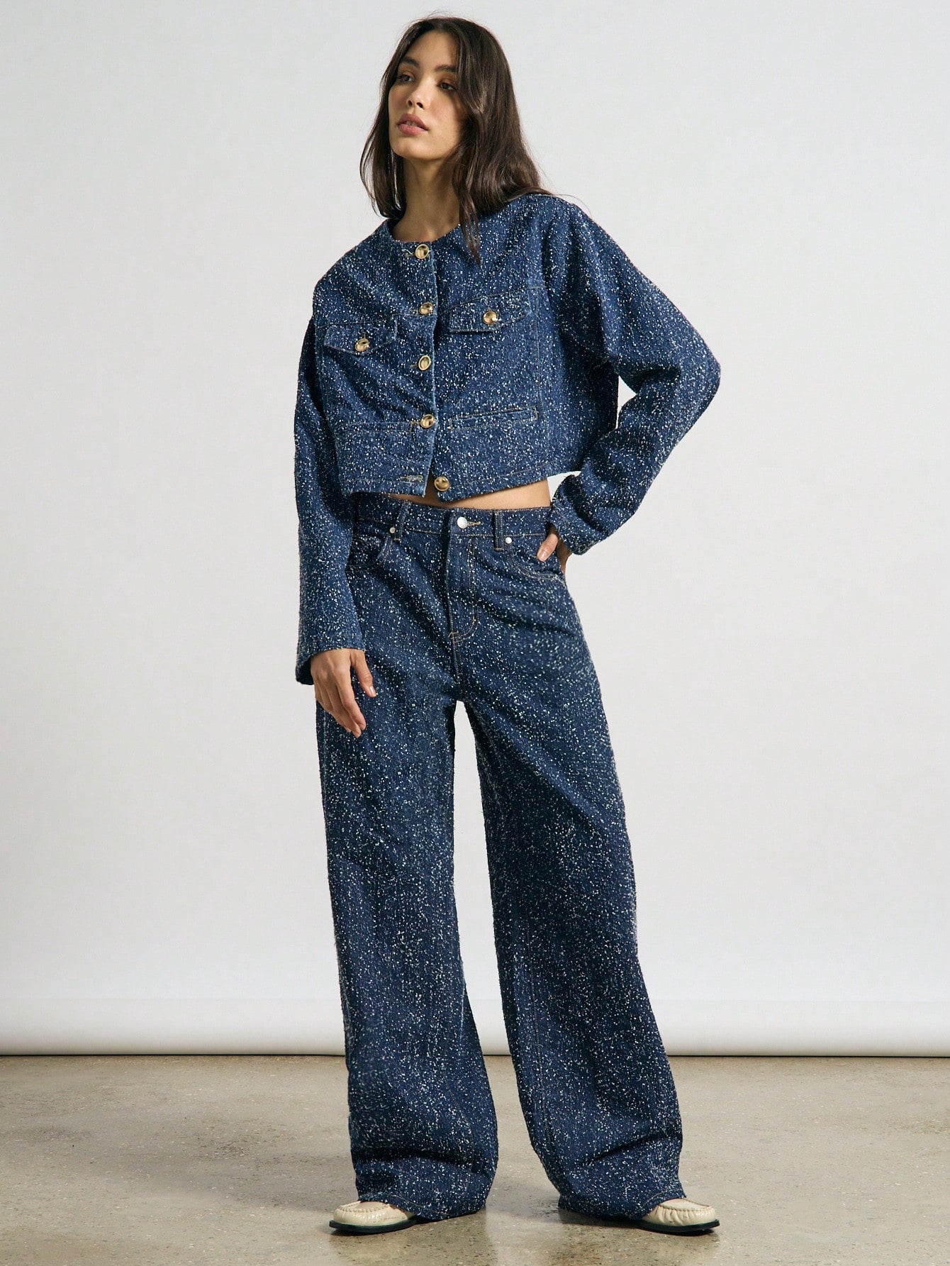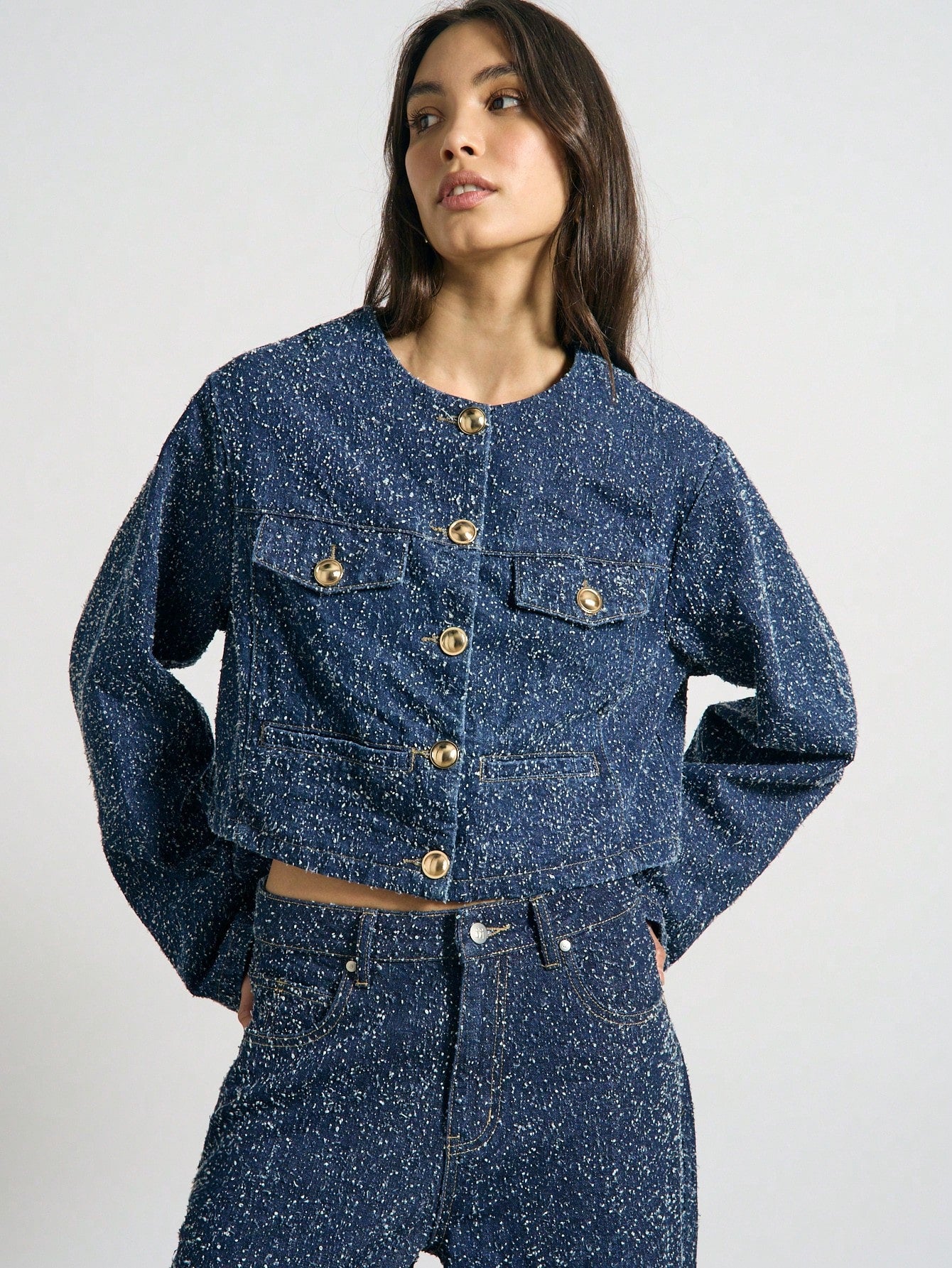 AiiRZ Boucle Texture Trucker Jacket Cropped Button Front Fall Winter Outerwear Flecked Pattern Casual