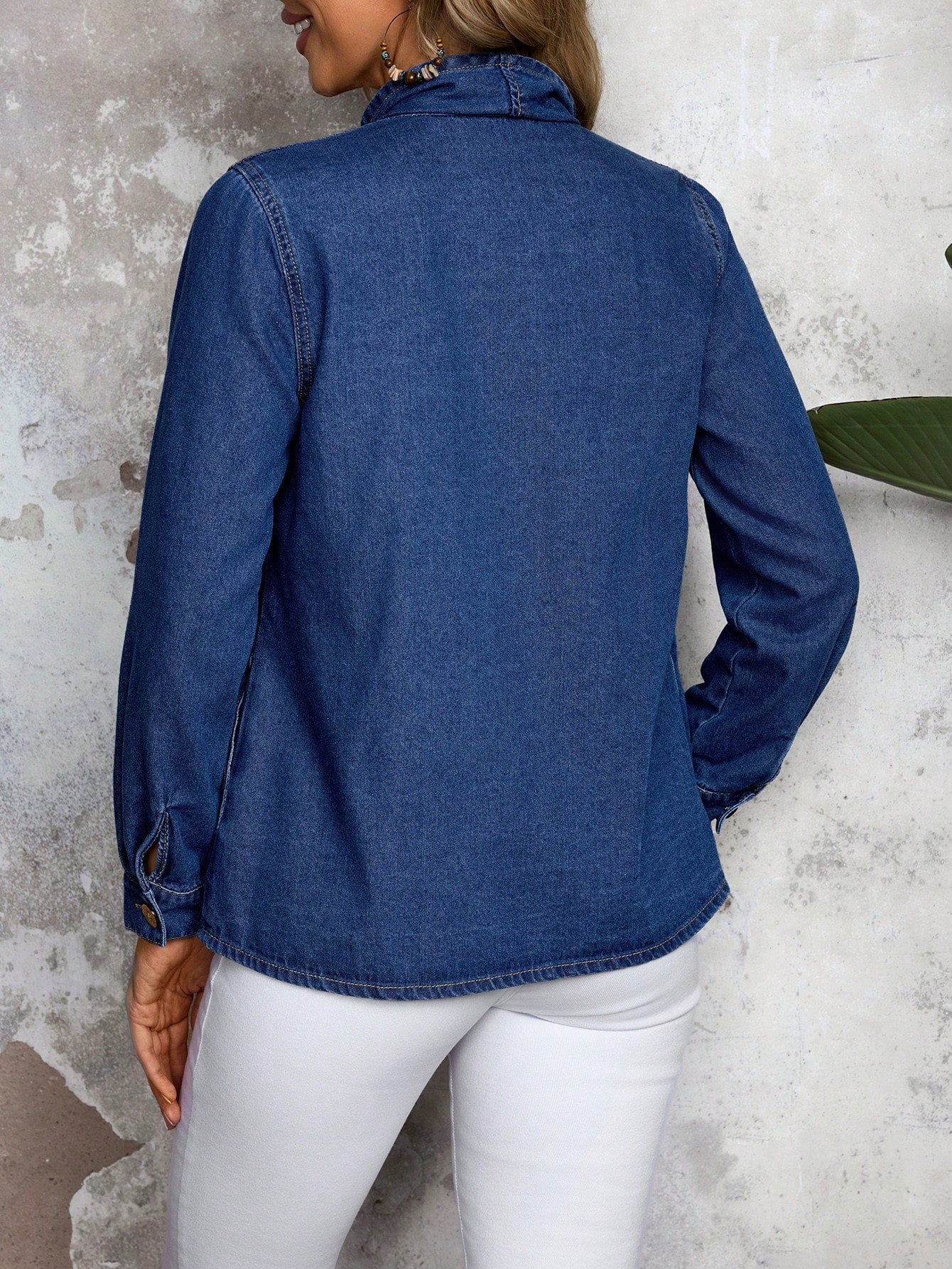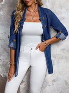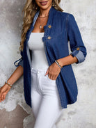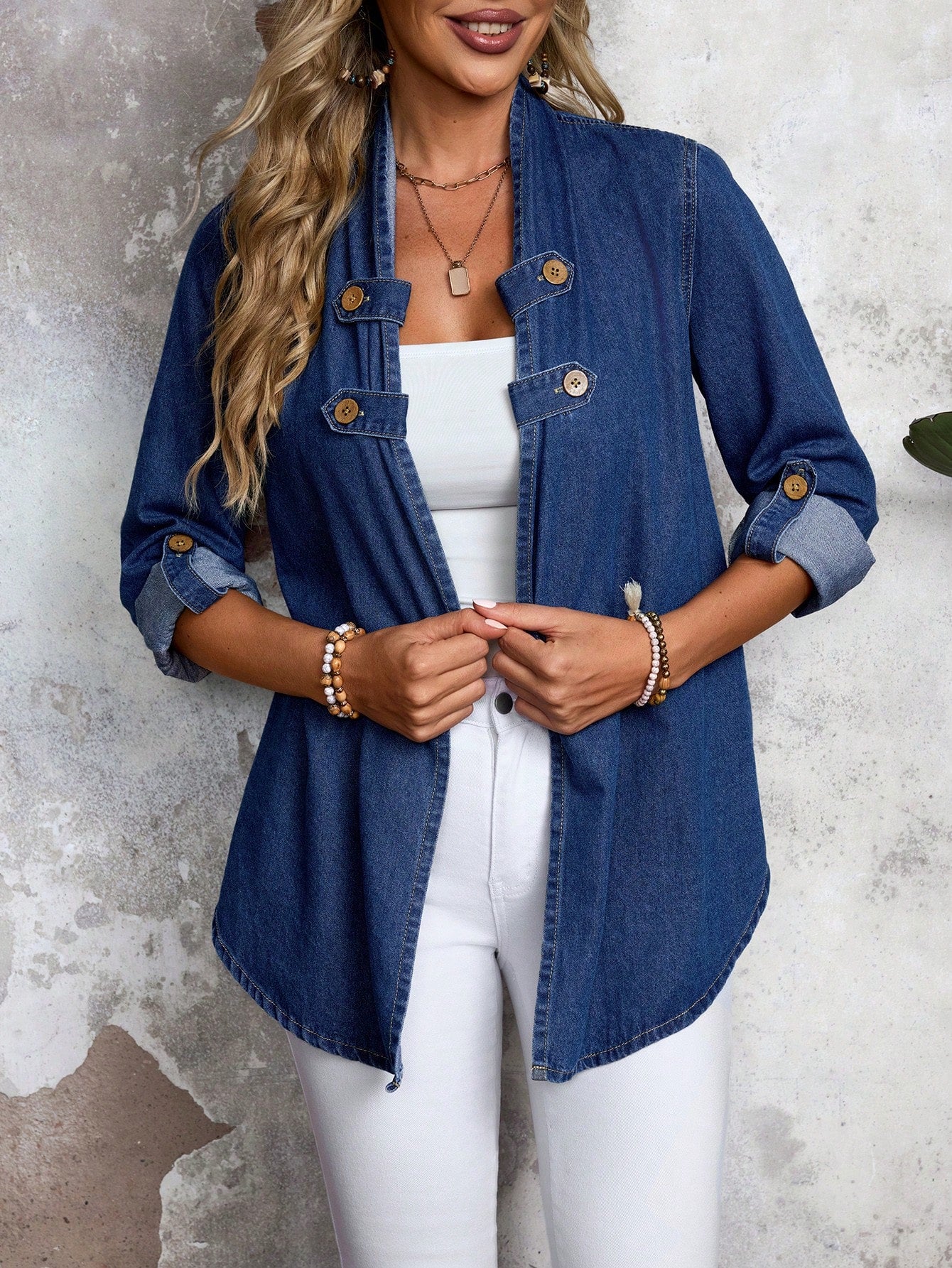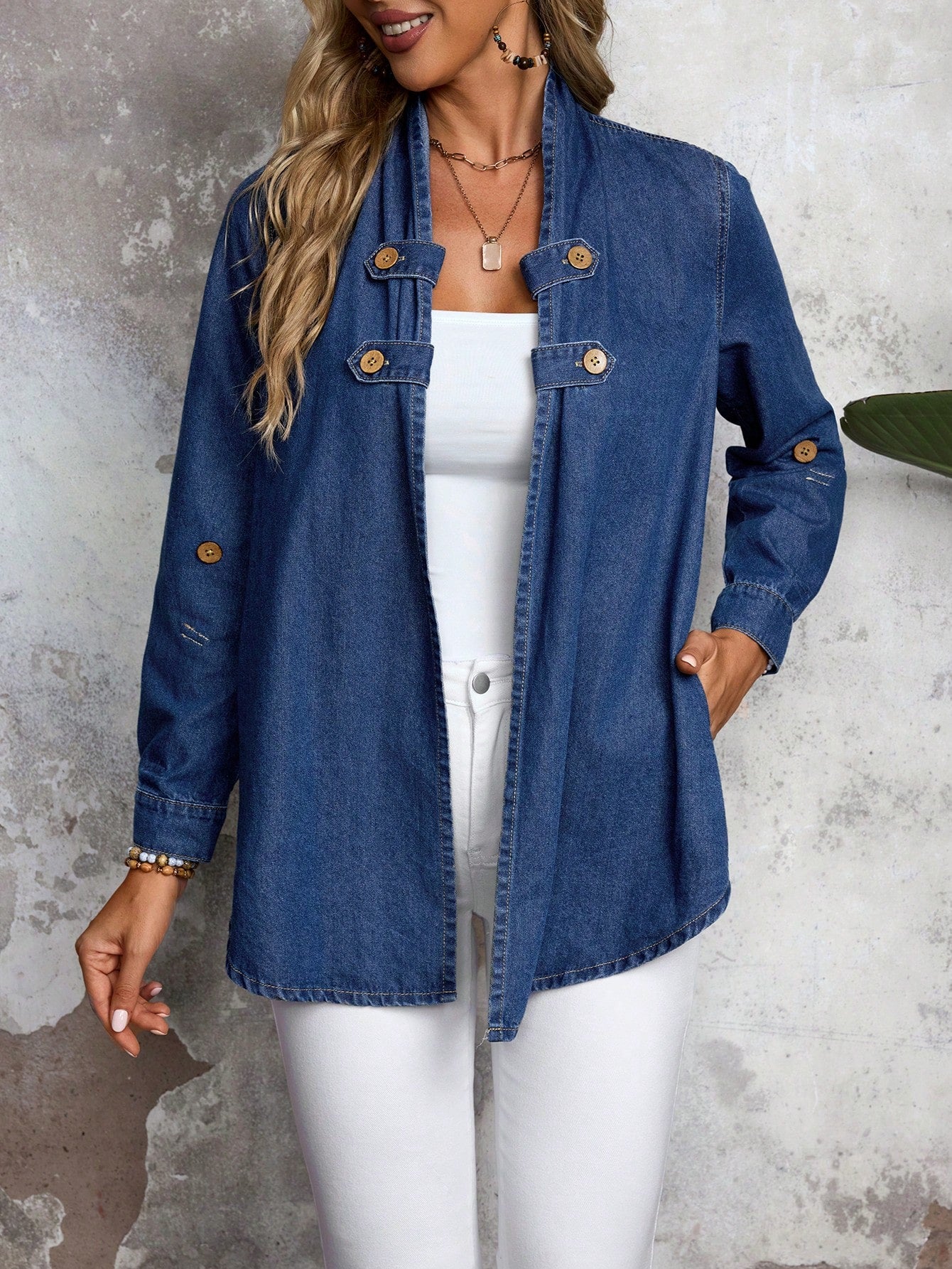 LUNE Women's Button Decorated Roll-Up Sleeve Loose Casual Open Front Denim Jacket, Spring Autumn