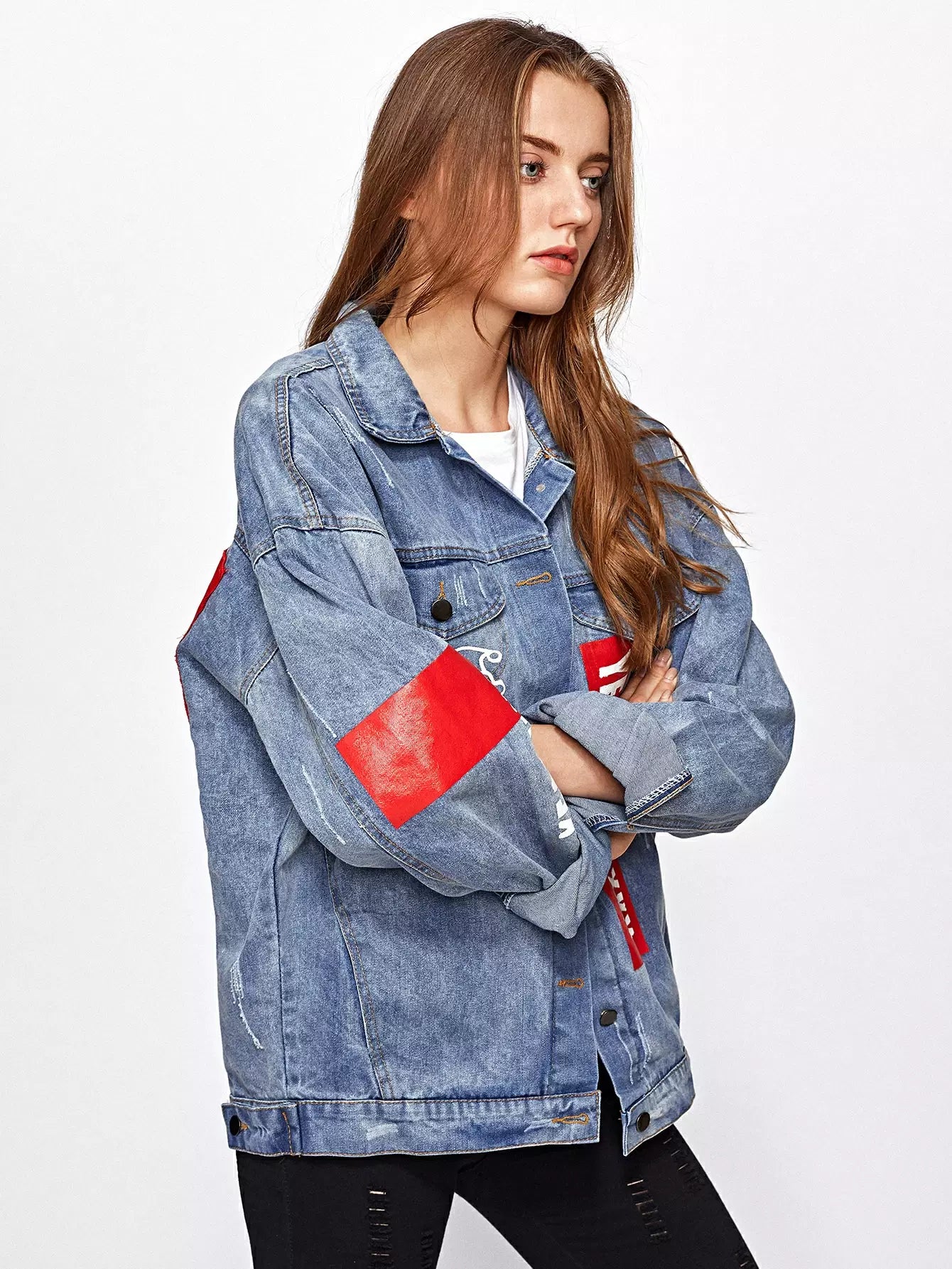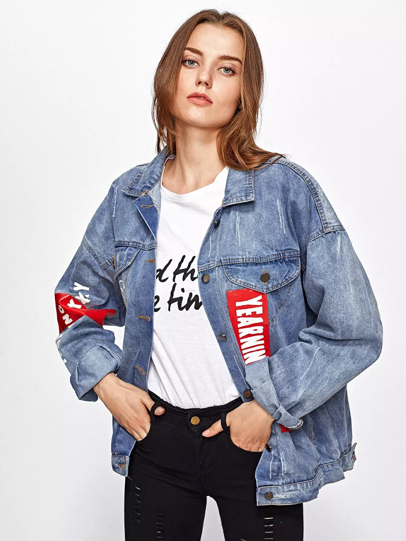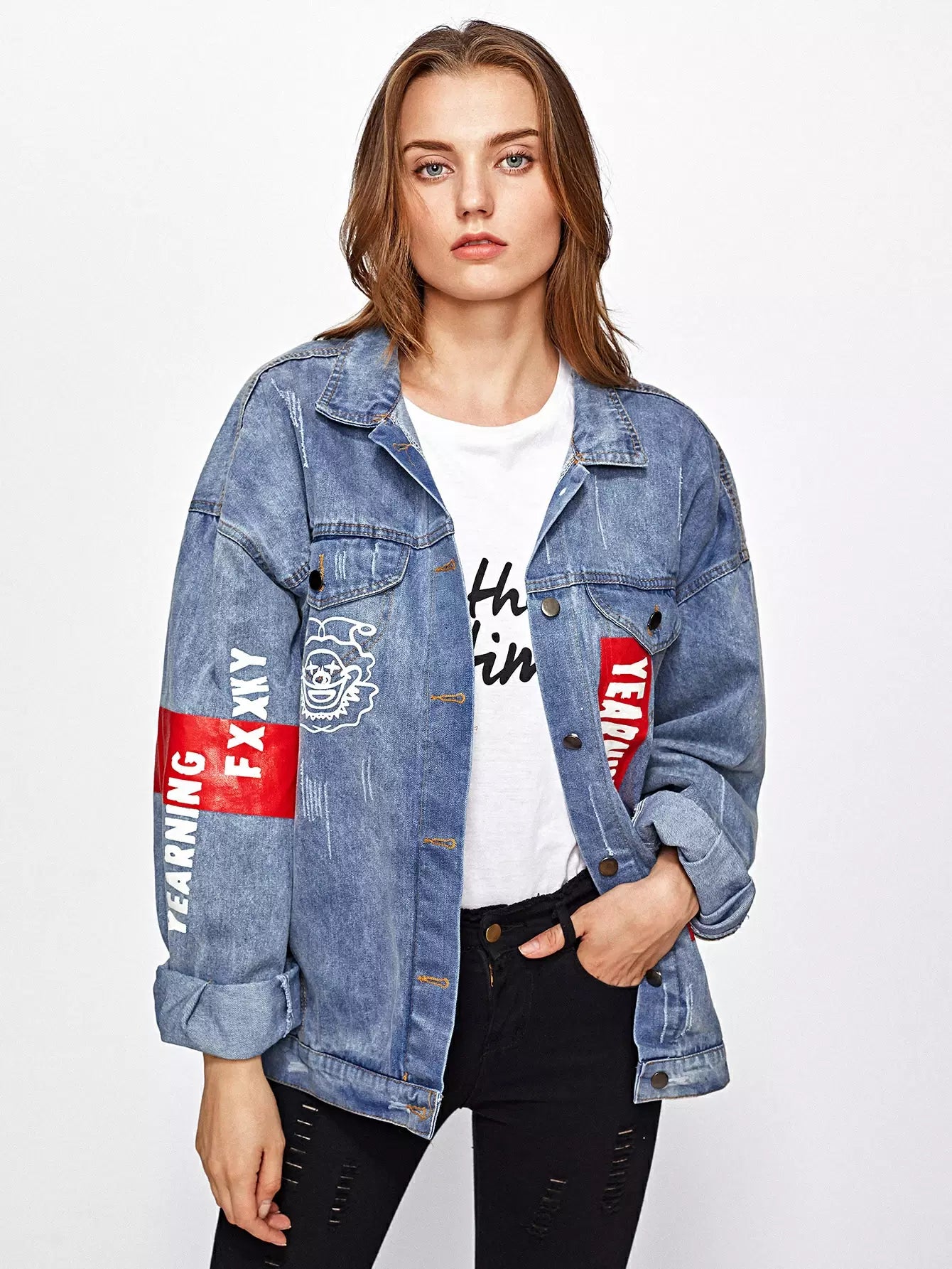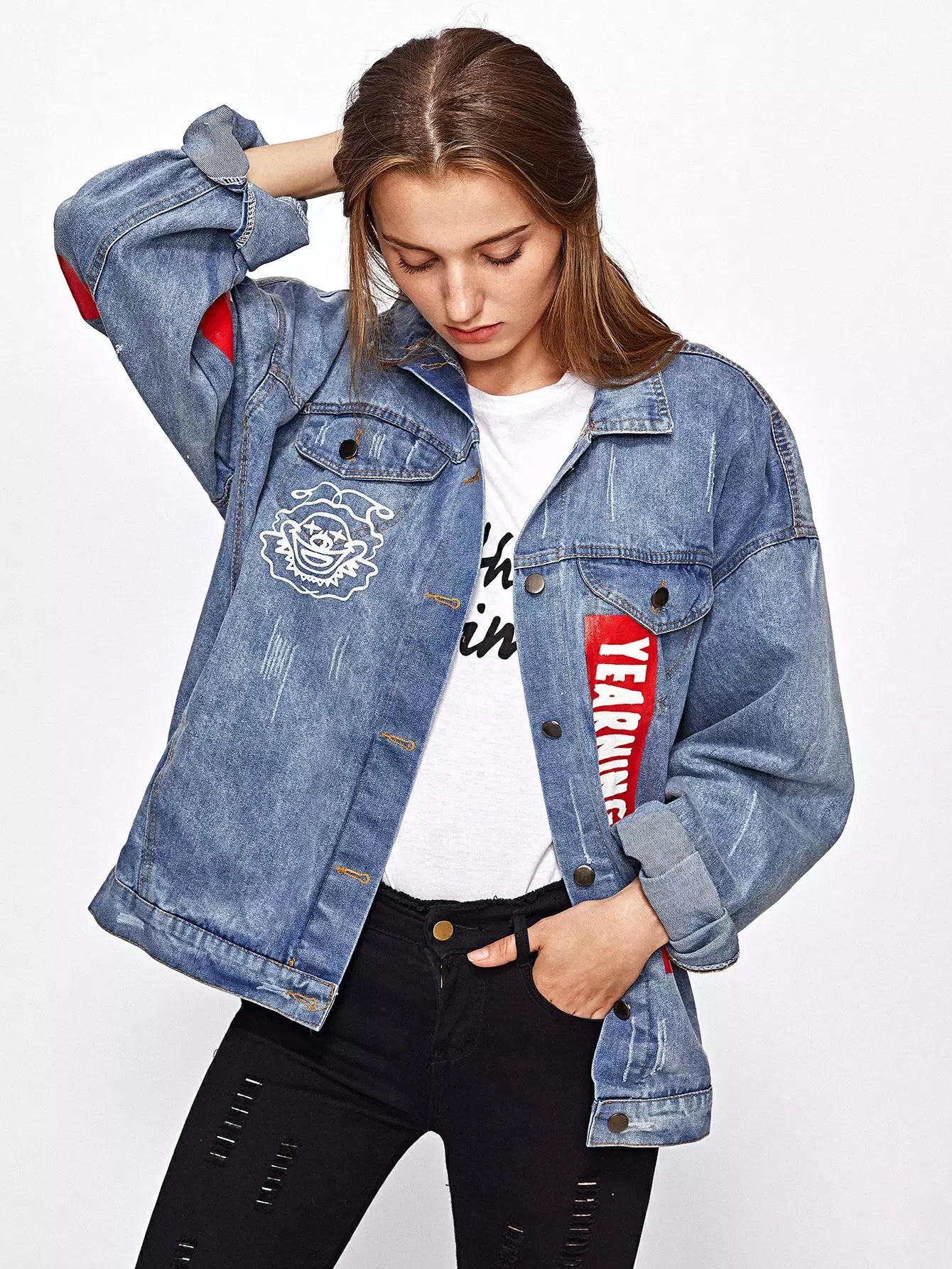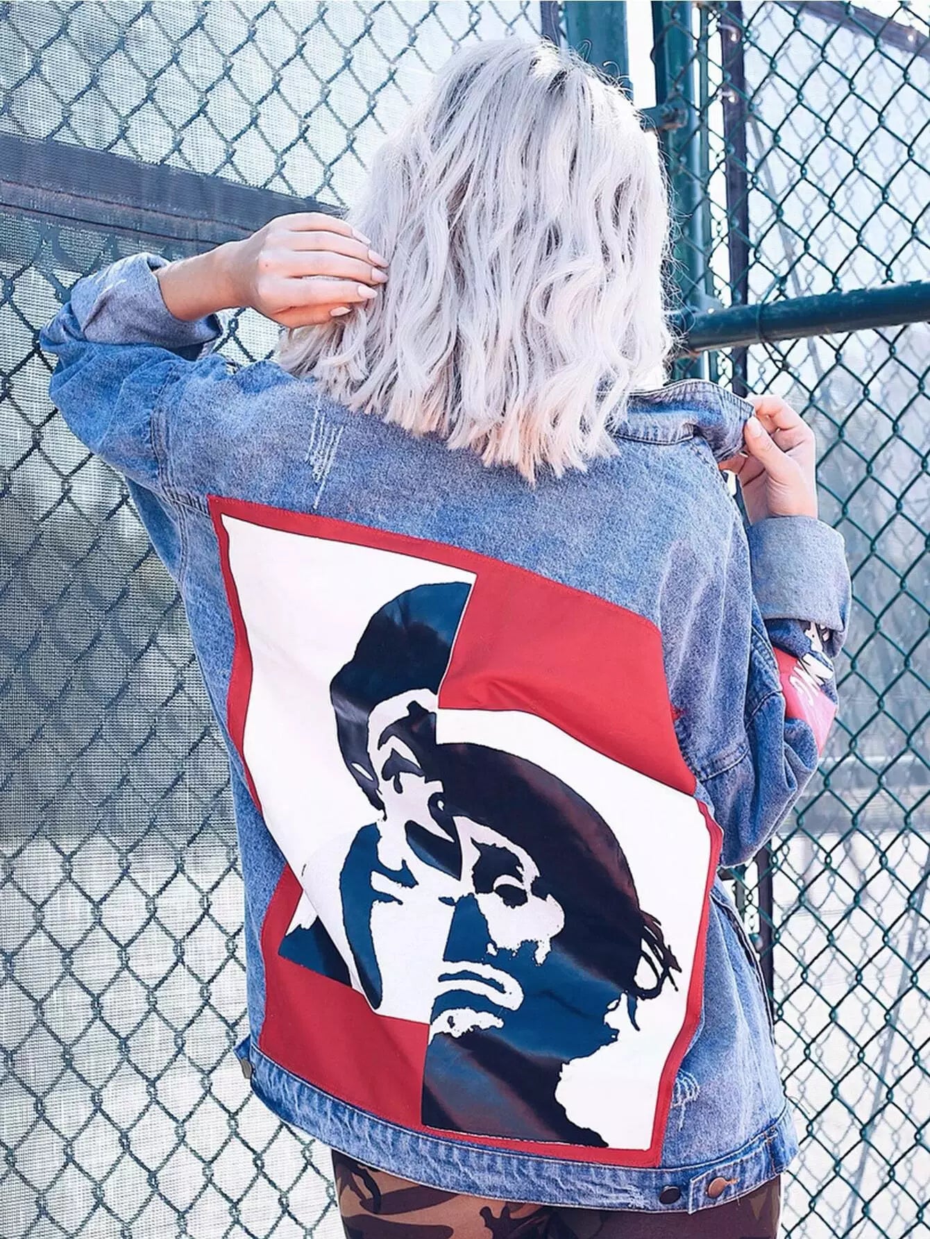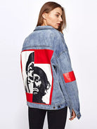 Patch Back Letter Print Bleach Wash Denim Jacket