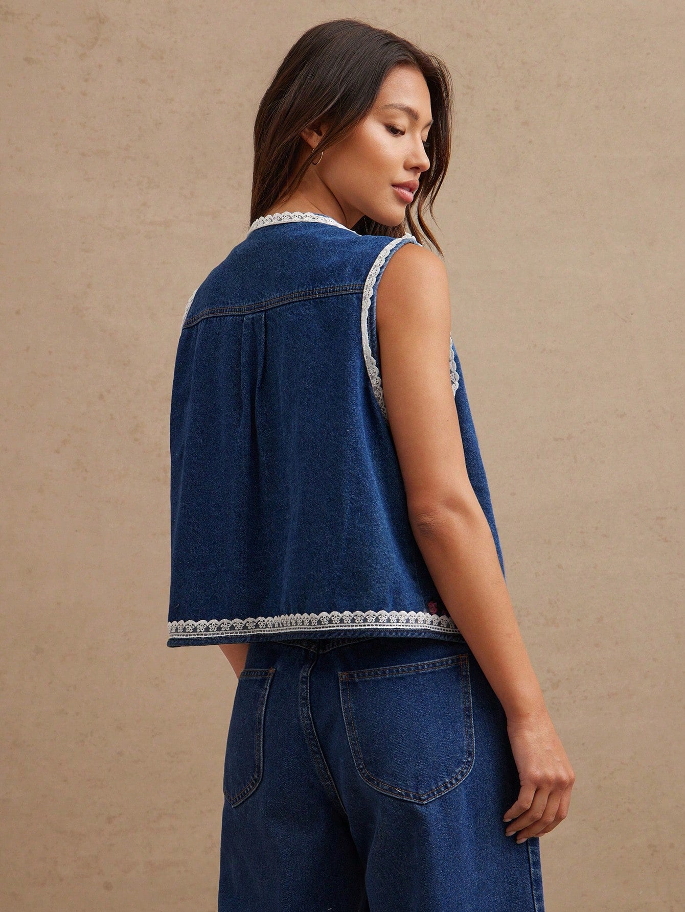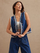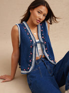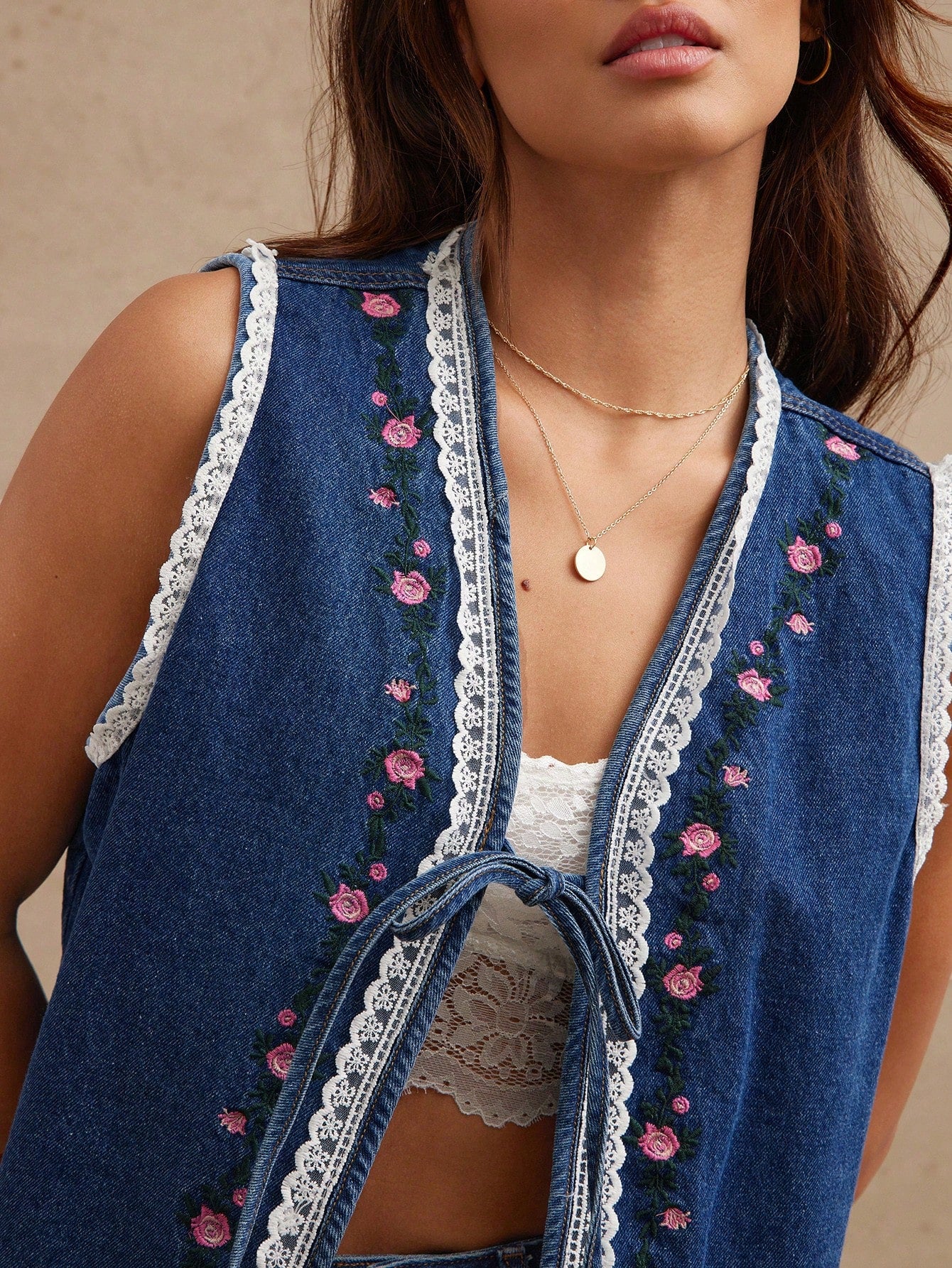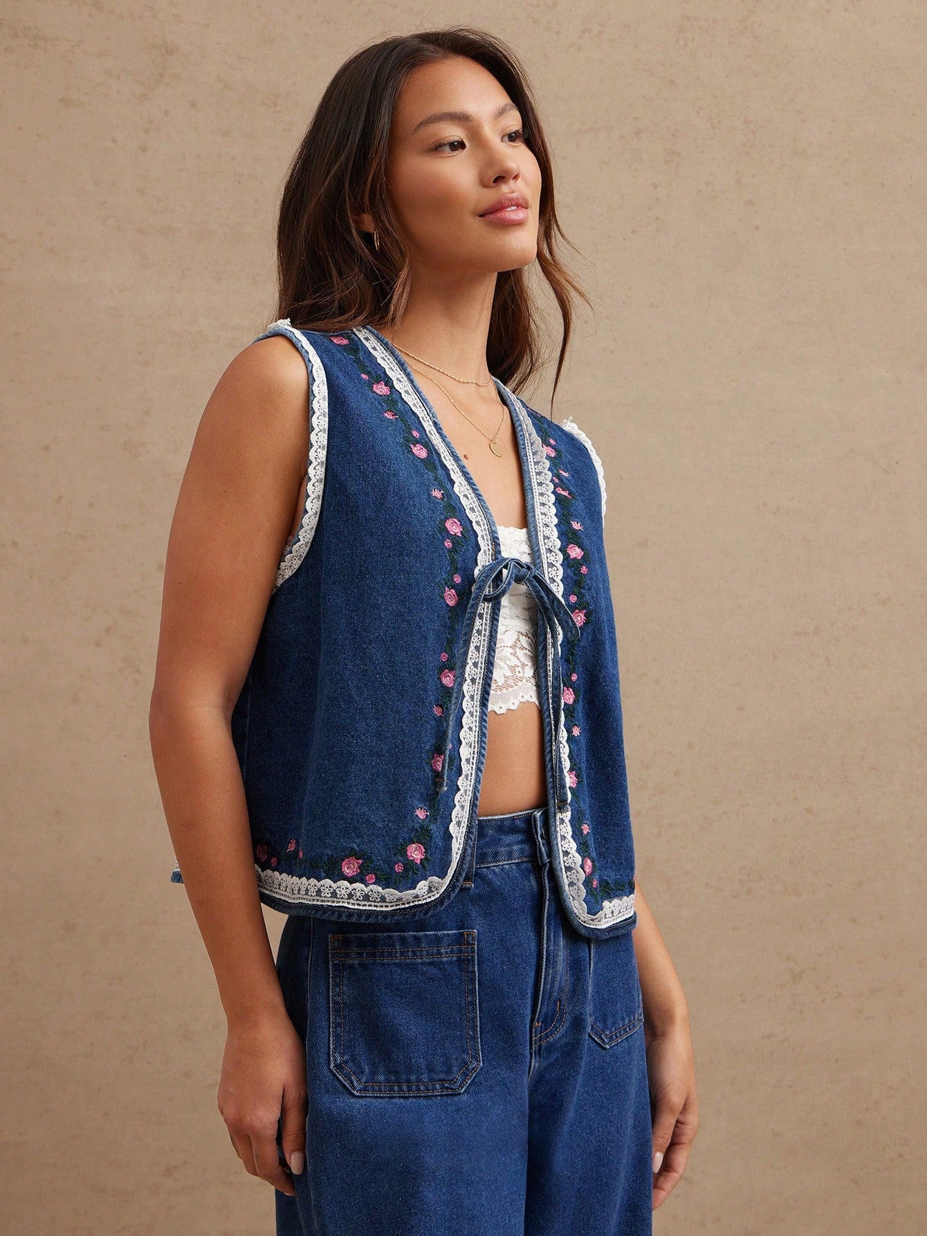 WESTFADE Country Western Cowgirl Spring Floral Embroidered V Neck Cute Bow Tie Front Boxy Denim Vest