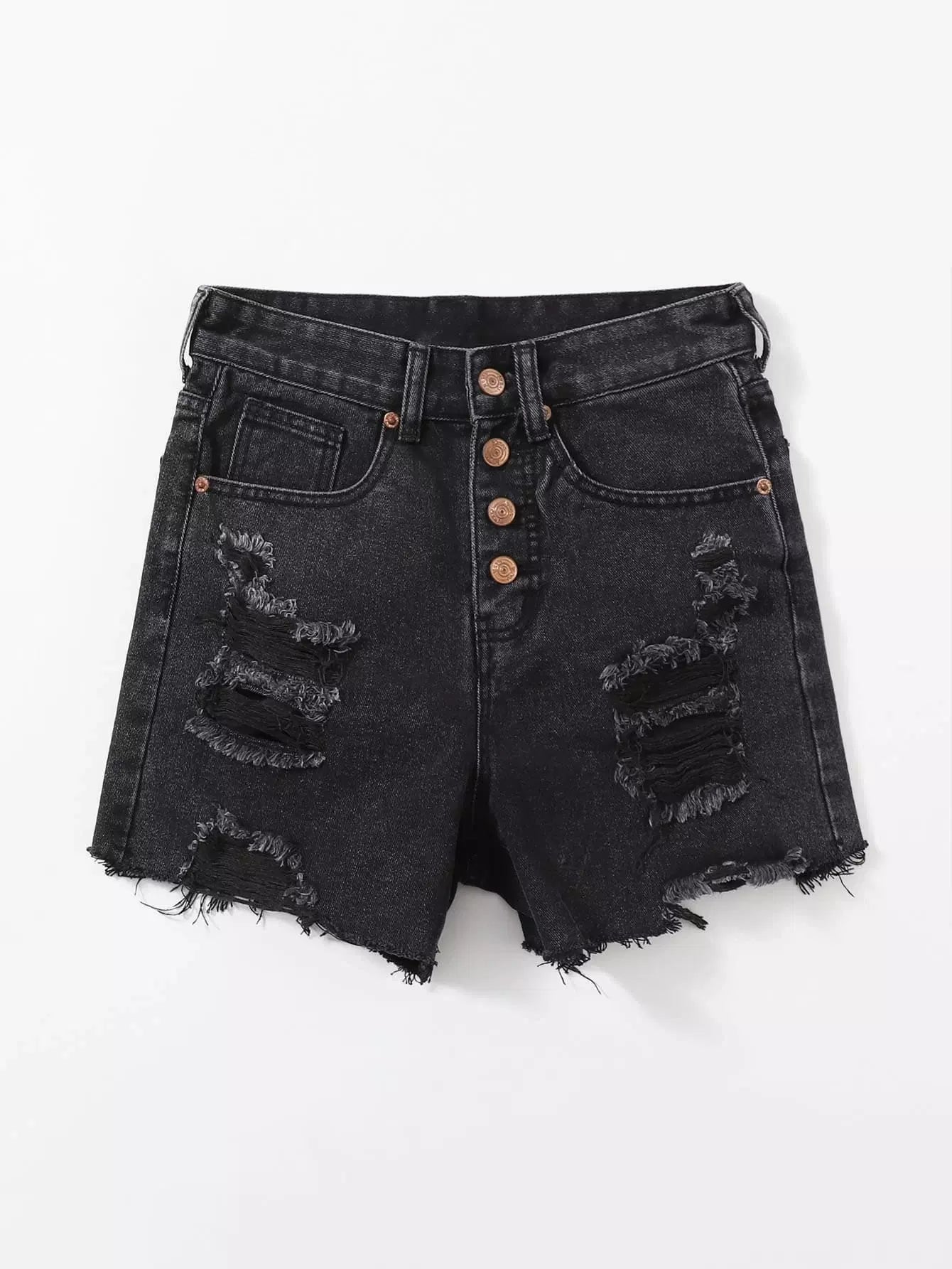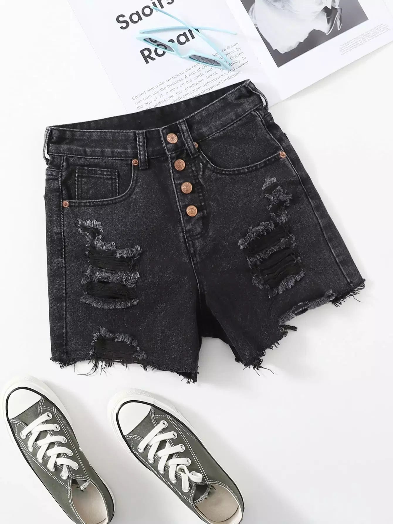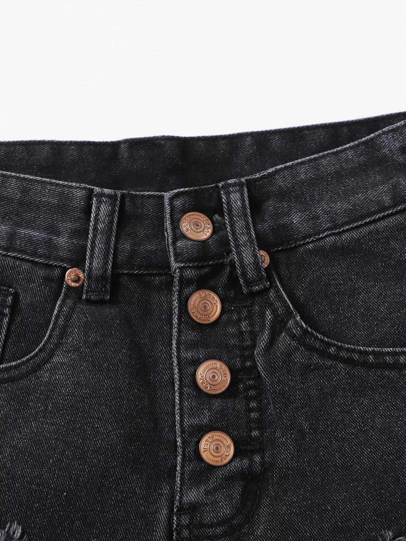 Buttoned Front Ripped Raw Hem Denim Shorts